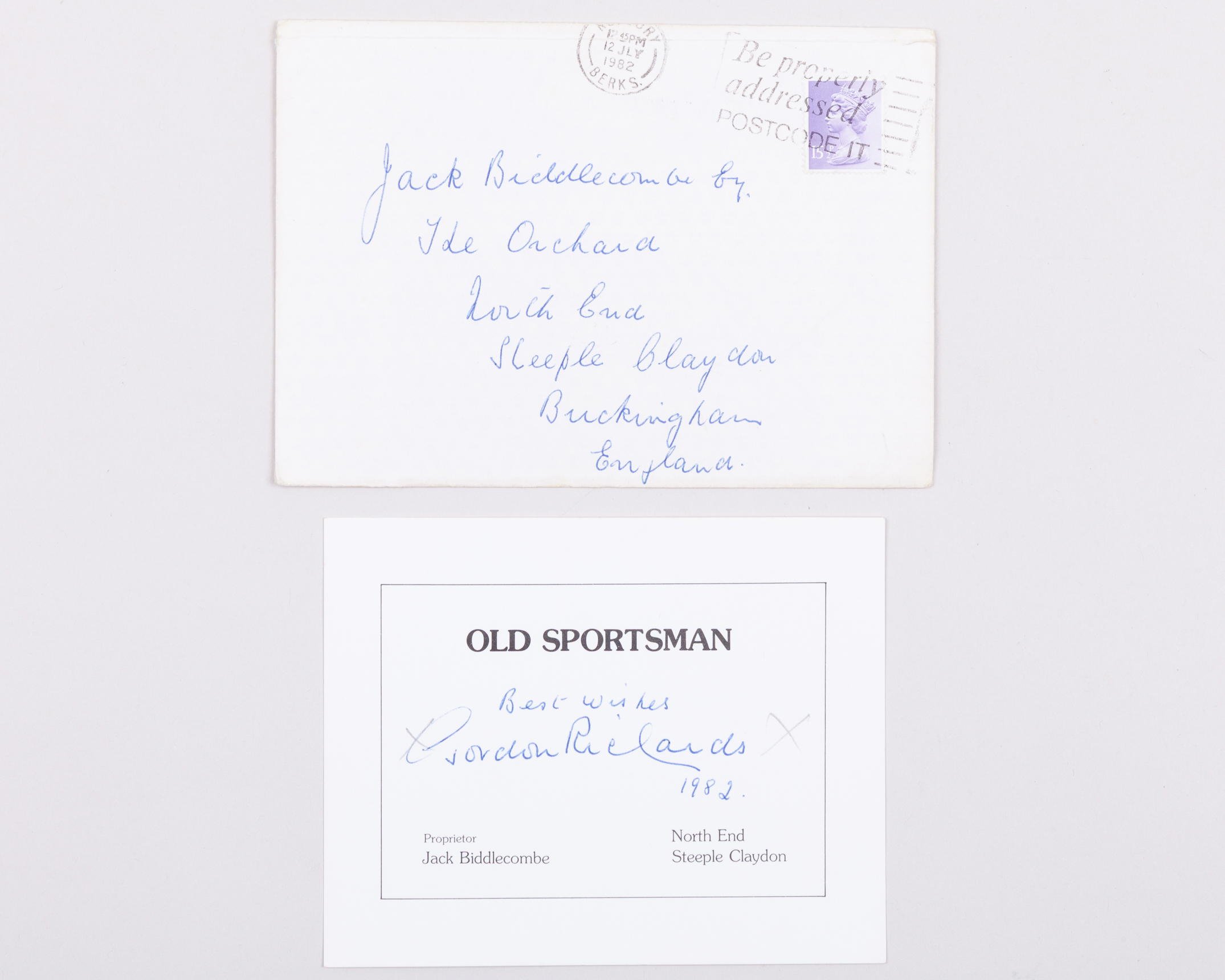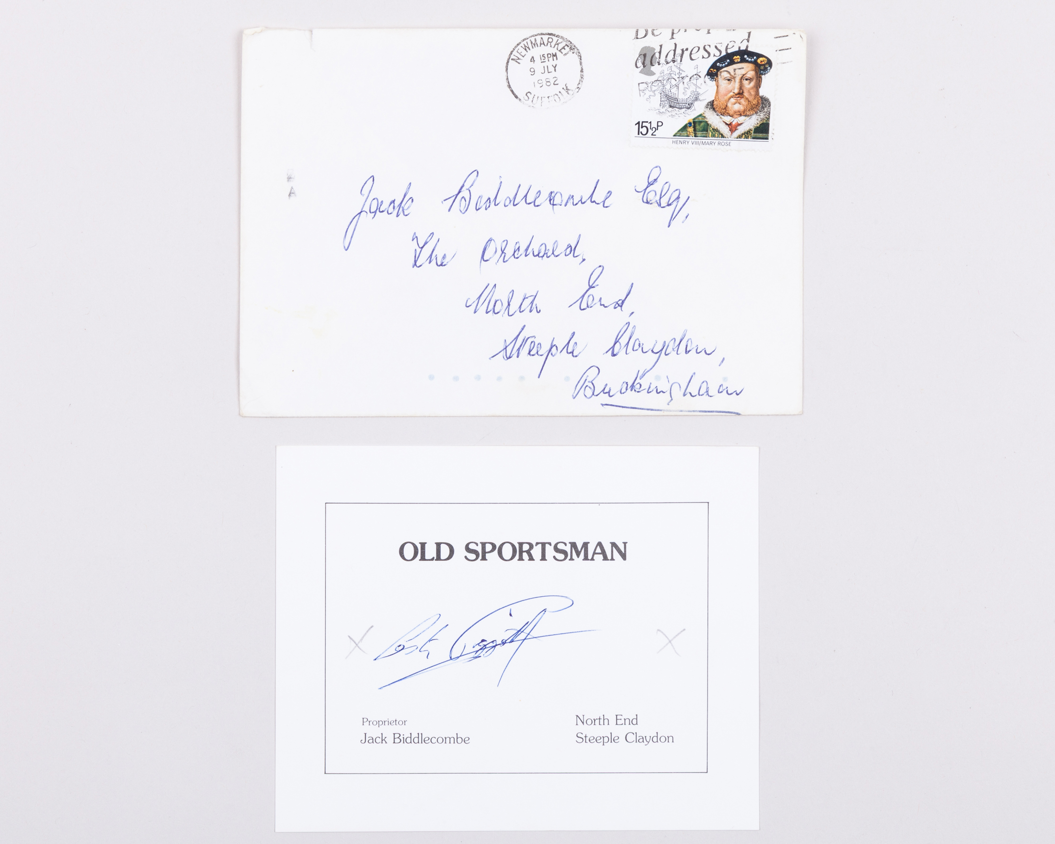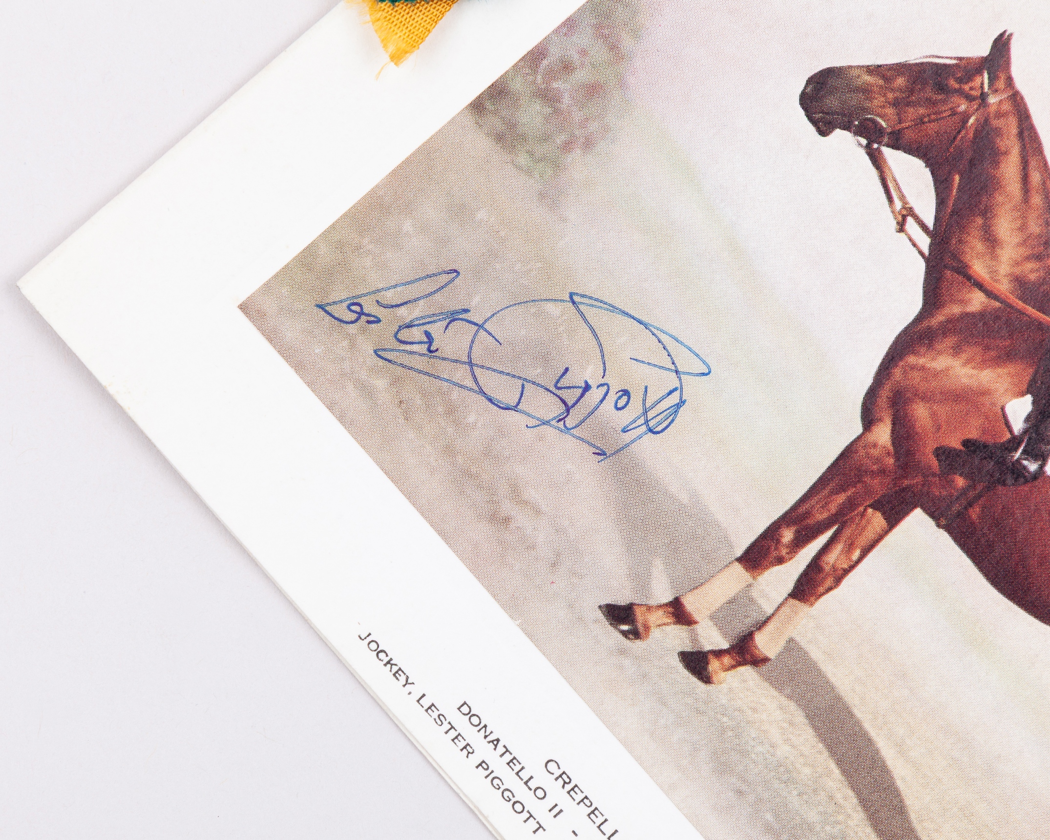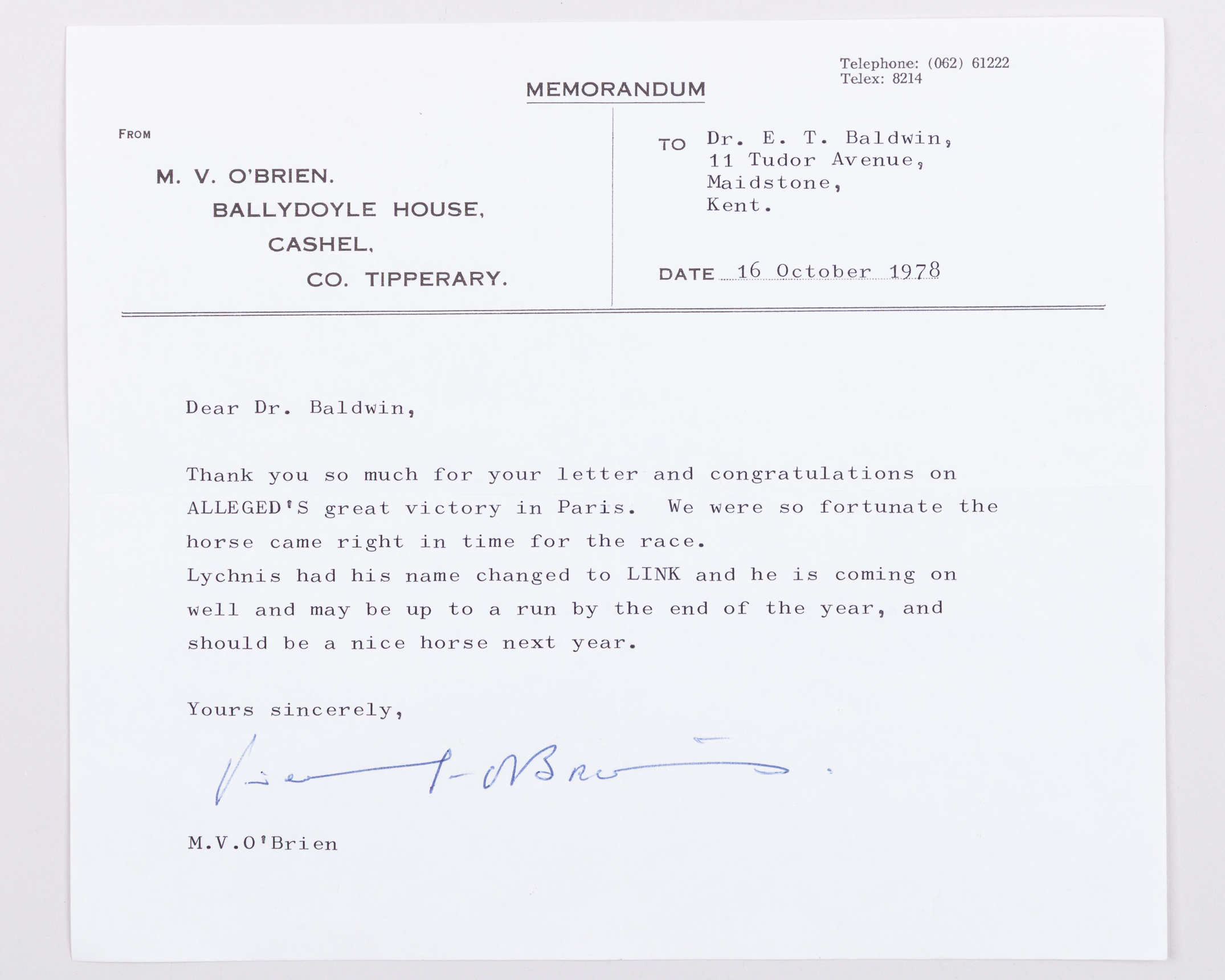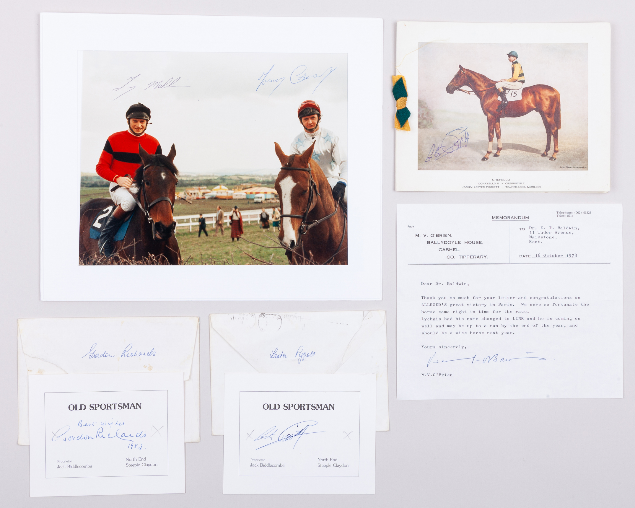 comprising: Vincent O'Brien signed letter on Ballydoyle Memorandum paper, a thank you note after Alleged's victory in the Arc; Sir Victor Sassoon Christmas card featuring Crepello and signed by Lester Piggott; two cards, the first signed by Lester Piggott the other by Sir Gordon Richards; and a Paddy Mullins and Tommy Carmody double-signed colour photograph taken before the Dawn Run v Buck House Match Race at Punchestown (5)