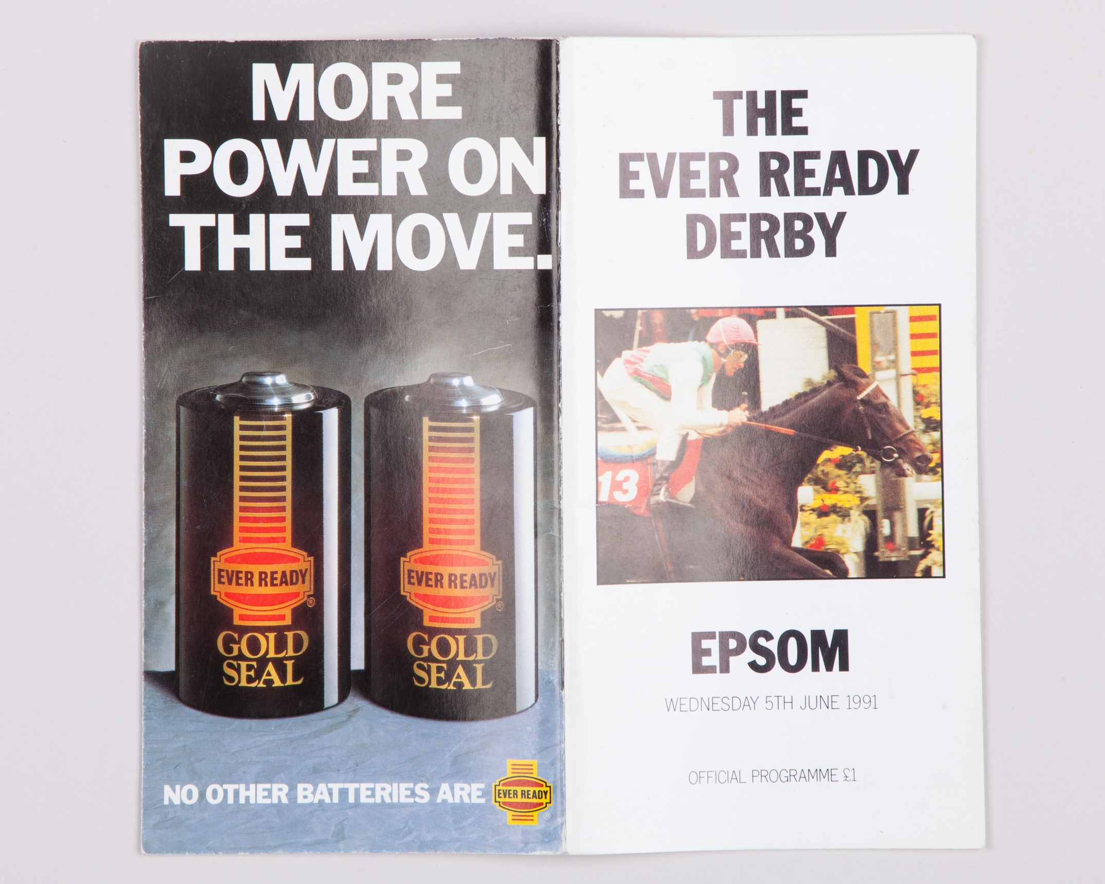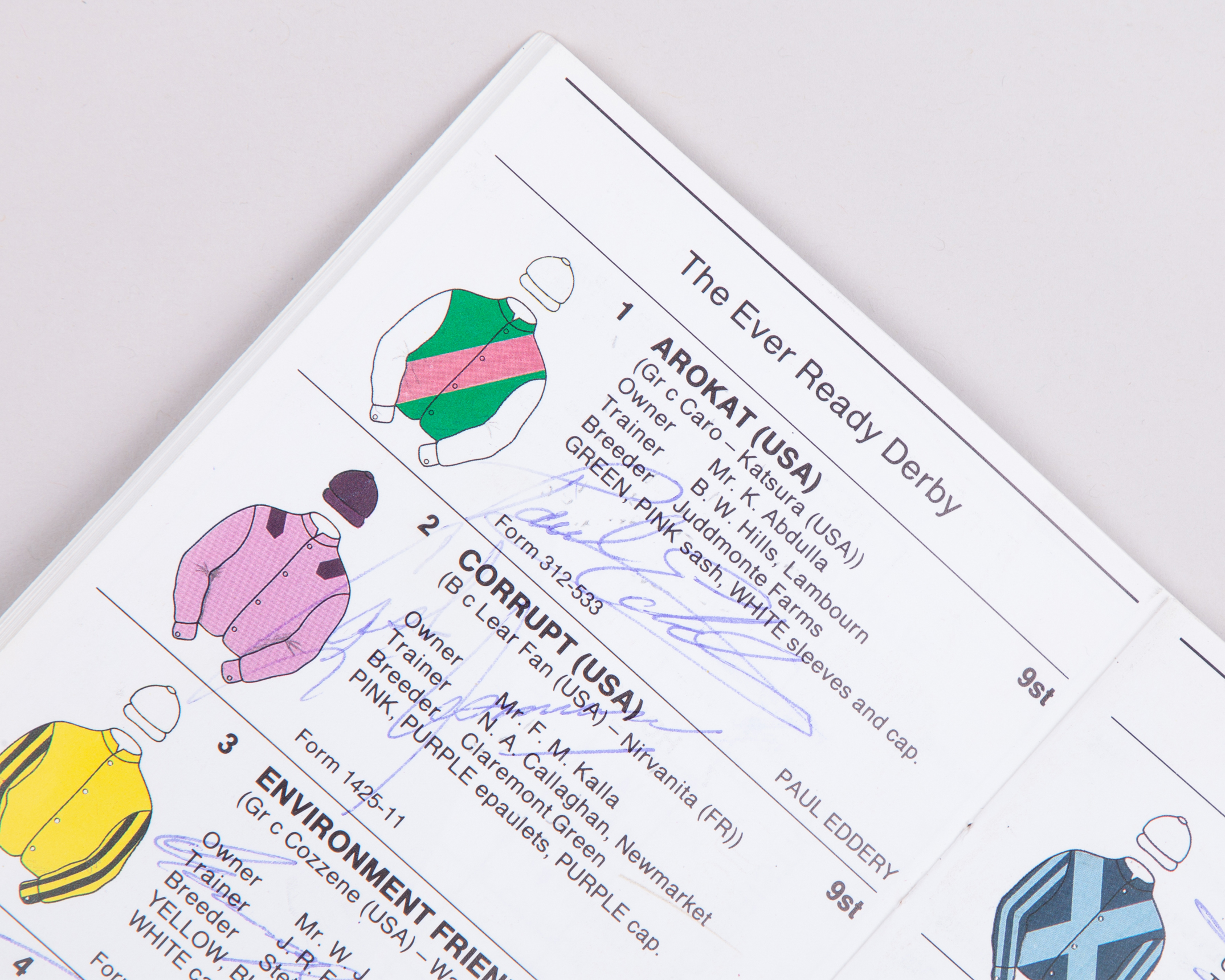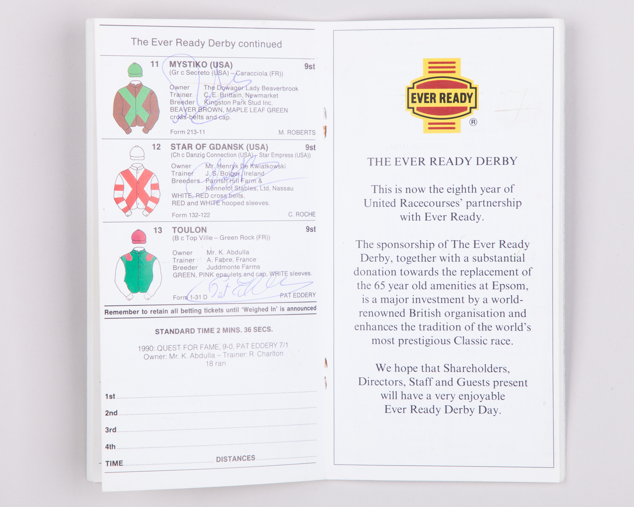 1991 Epsom Derby racecard fully-signed by the competing jockey,