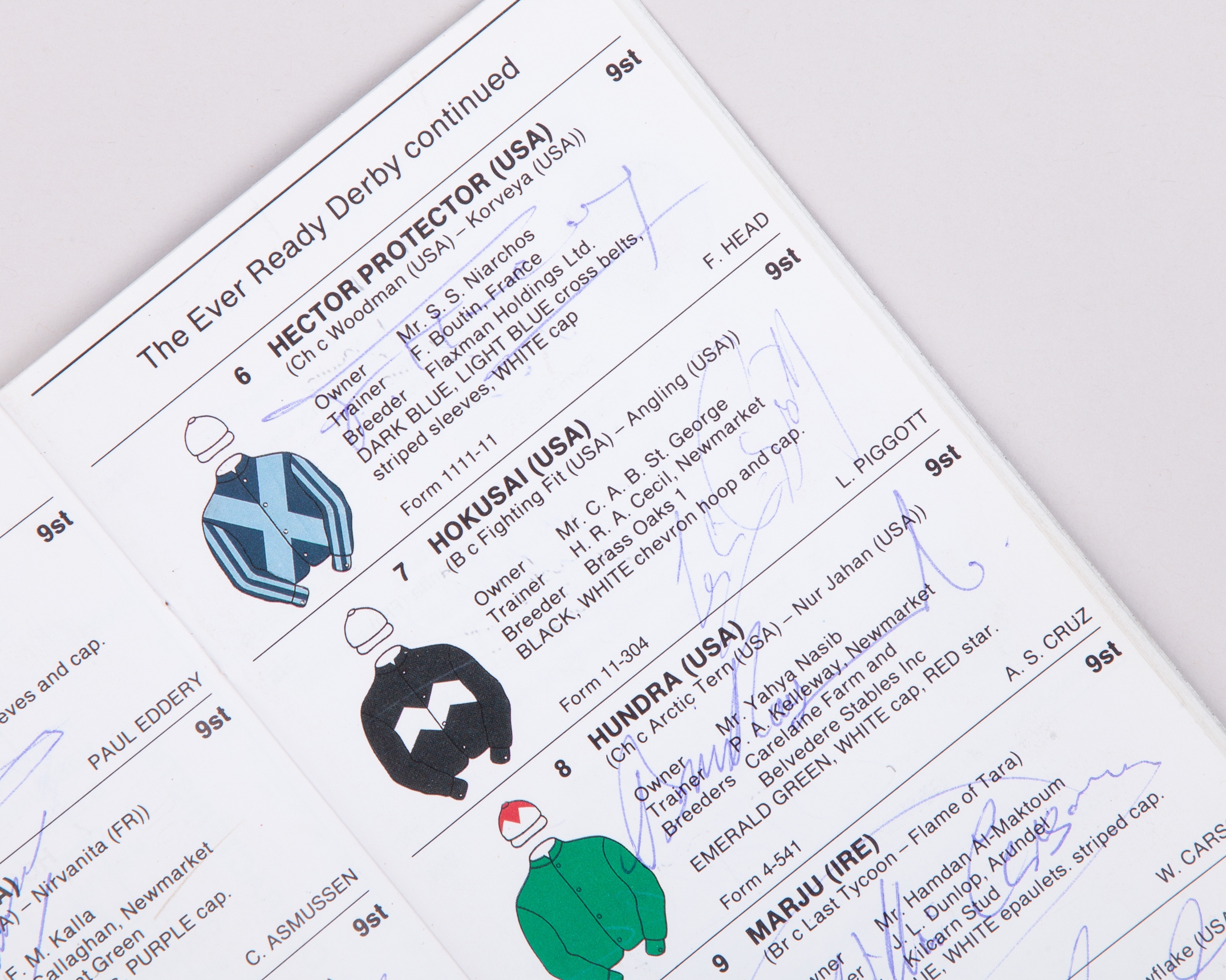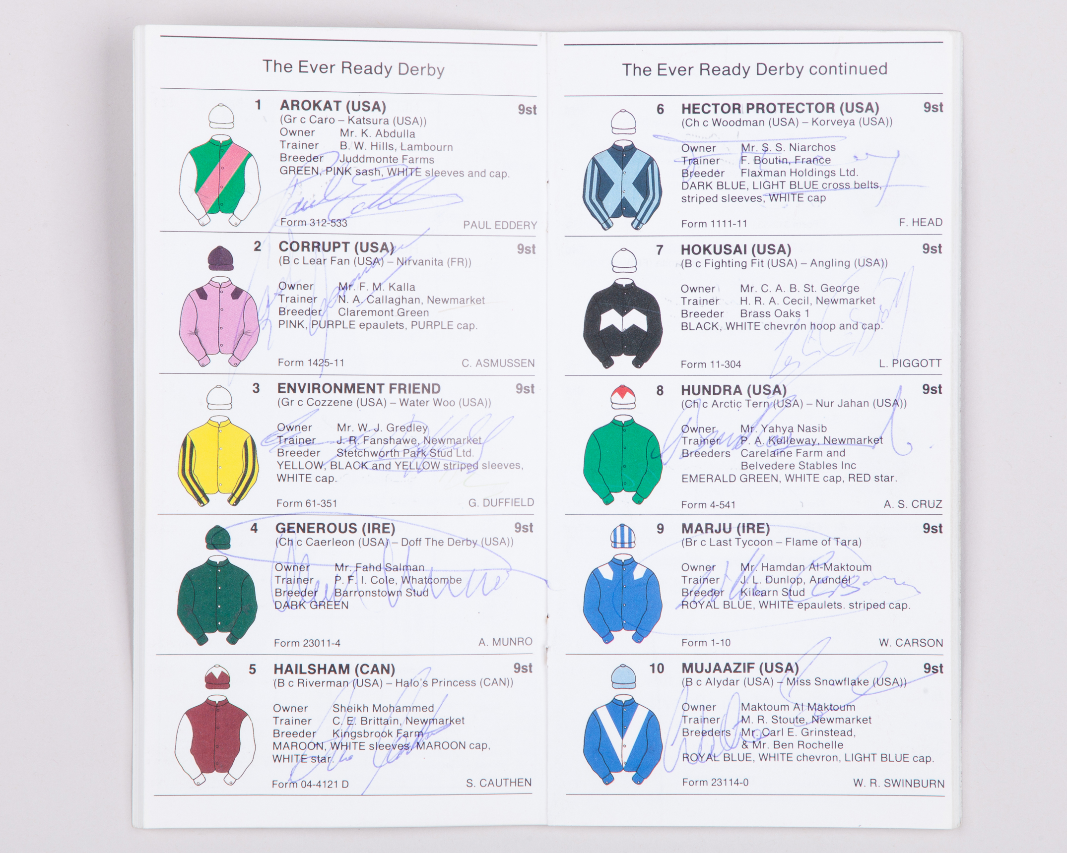 signed in ink over the race entries by Paul Eddery, Cash Asmussen, George Duffield, Alan Munro (winning jockey, Generous), Steve Cauthen, Freddy Head, Lester Piggott, Tony Cruz, Willie Carson, Walter Swinburn, Michael Roberts, Christy Roche & Pat Eddery