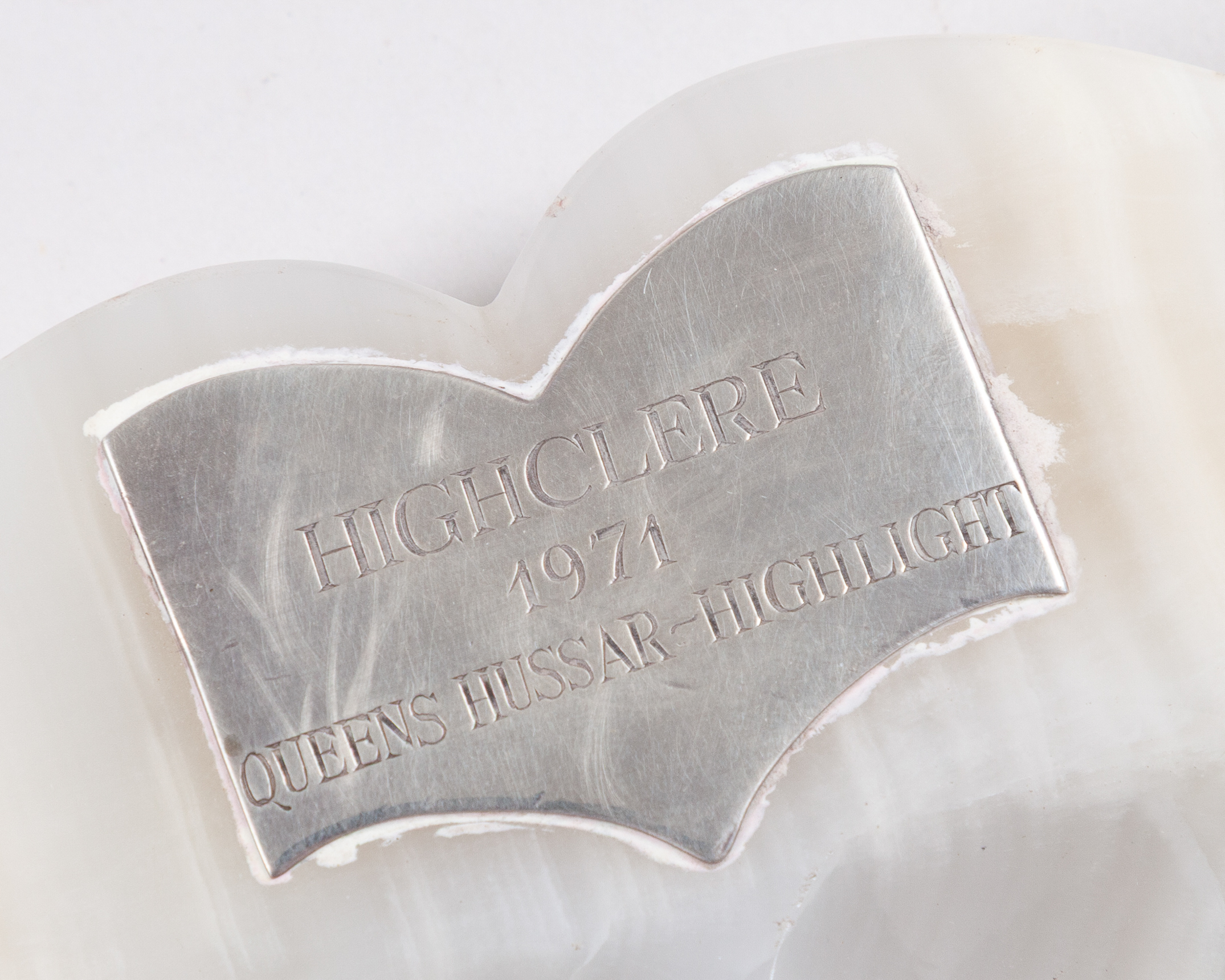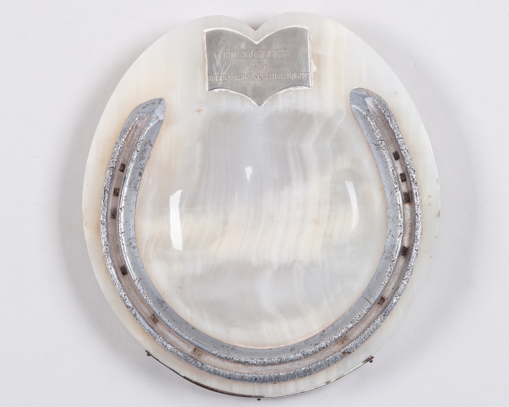 mounted on a marble ash tray, set with two plaques reading HIGHCLERE, 1971, QUEENS HUSSAR - HIGHLIGHT. WINNER 1974, 1000 GUINEAS AND PRIX DE DIANE