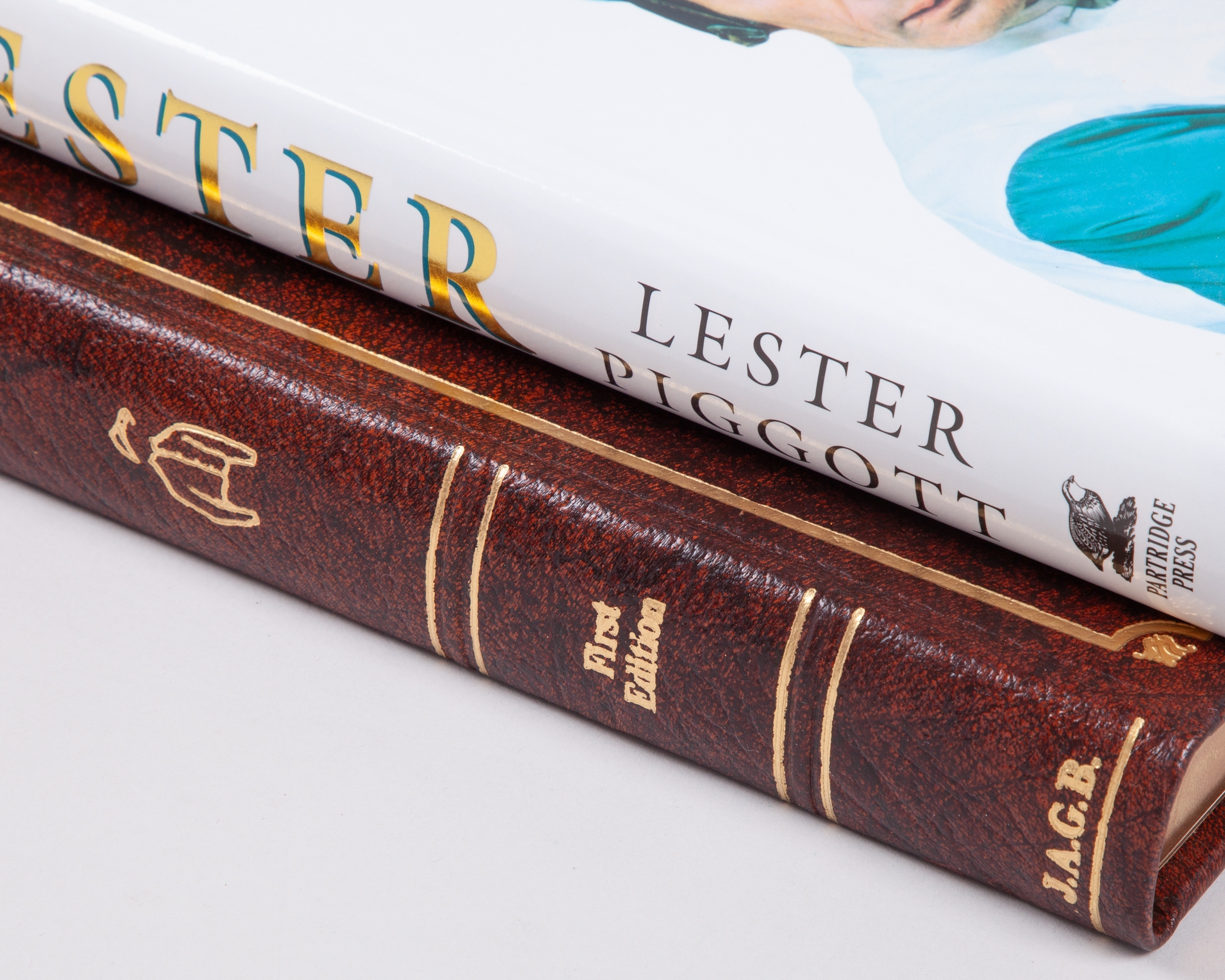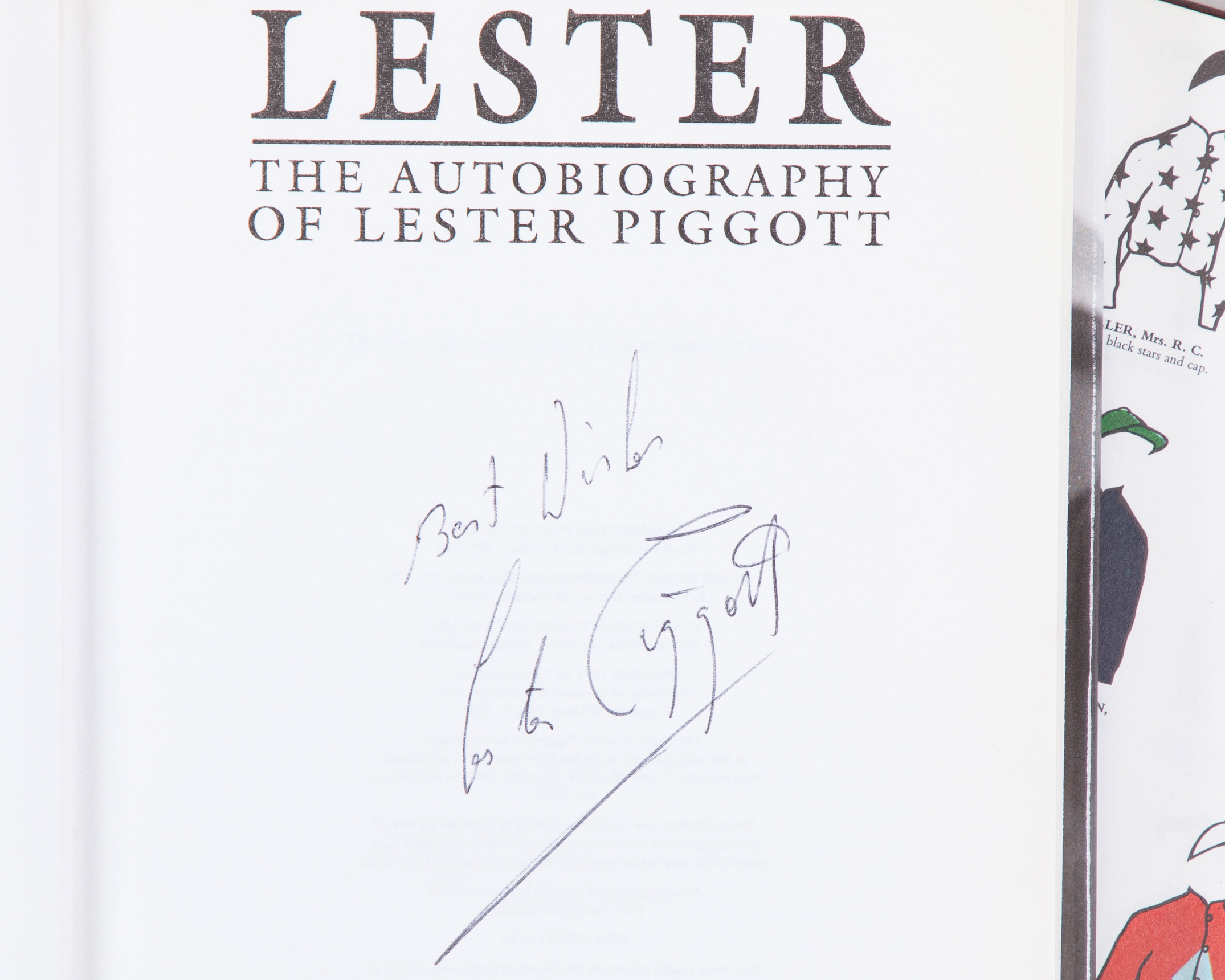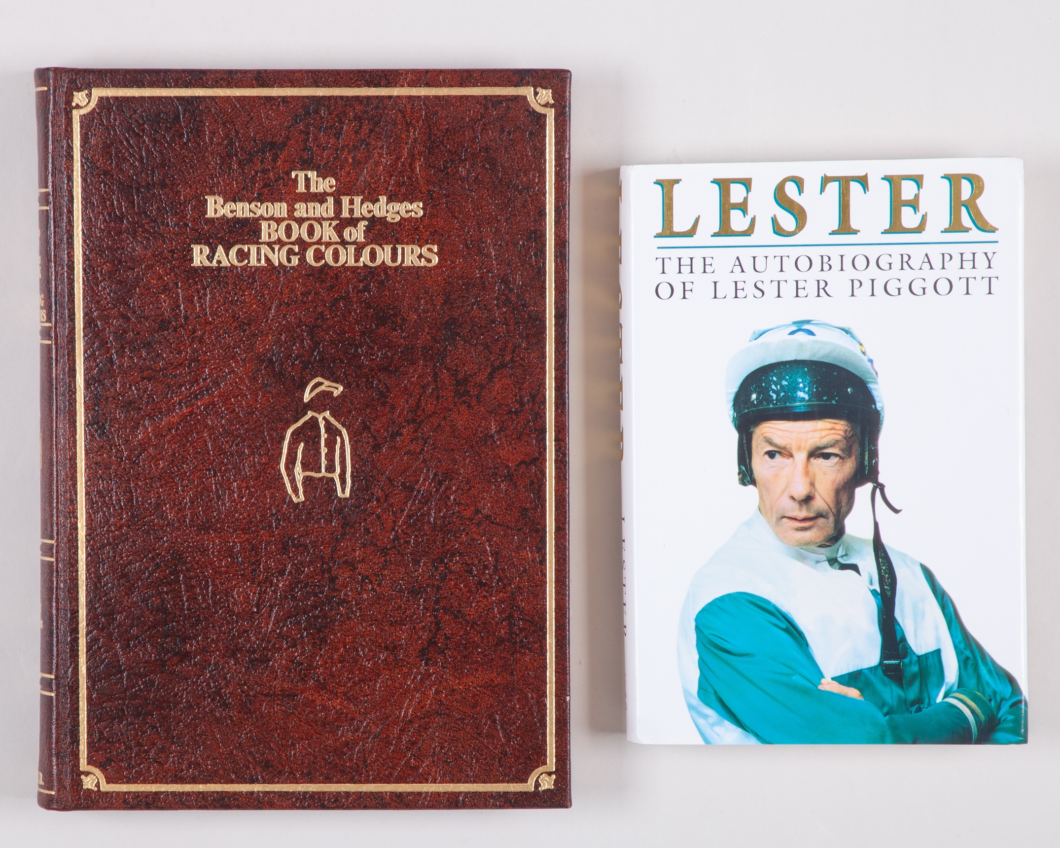 The Benson & Hedges Book of Racing Colours leather bound limited edition, 317/1973, signed by Lester Piggott and by Lord Oaksey; and a signed copy of Lester The Autobiography