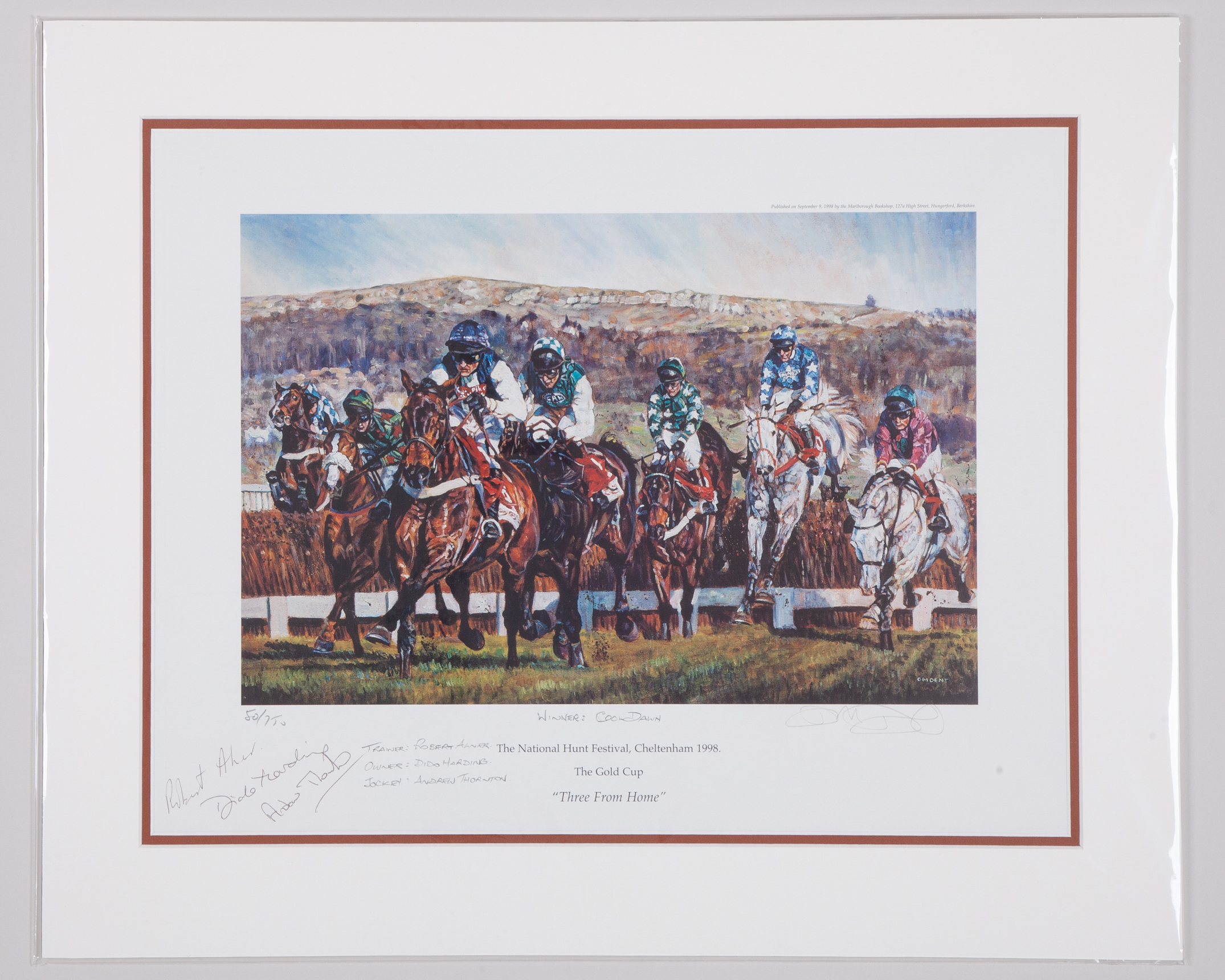 additionally signed by the artist, titled; The National Hunt Festival, Cheltenham 1998. The Gold Cup “Three From Home”, 50/750, mounted, 58 by 48cm overall