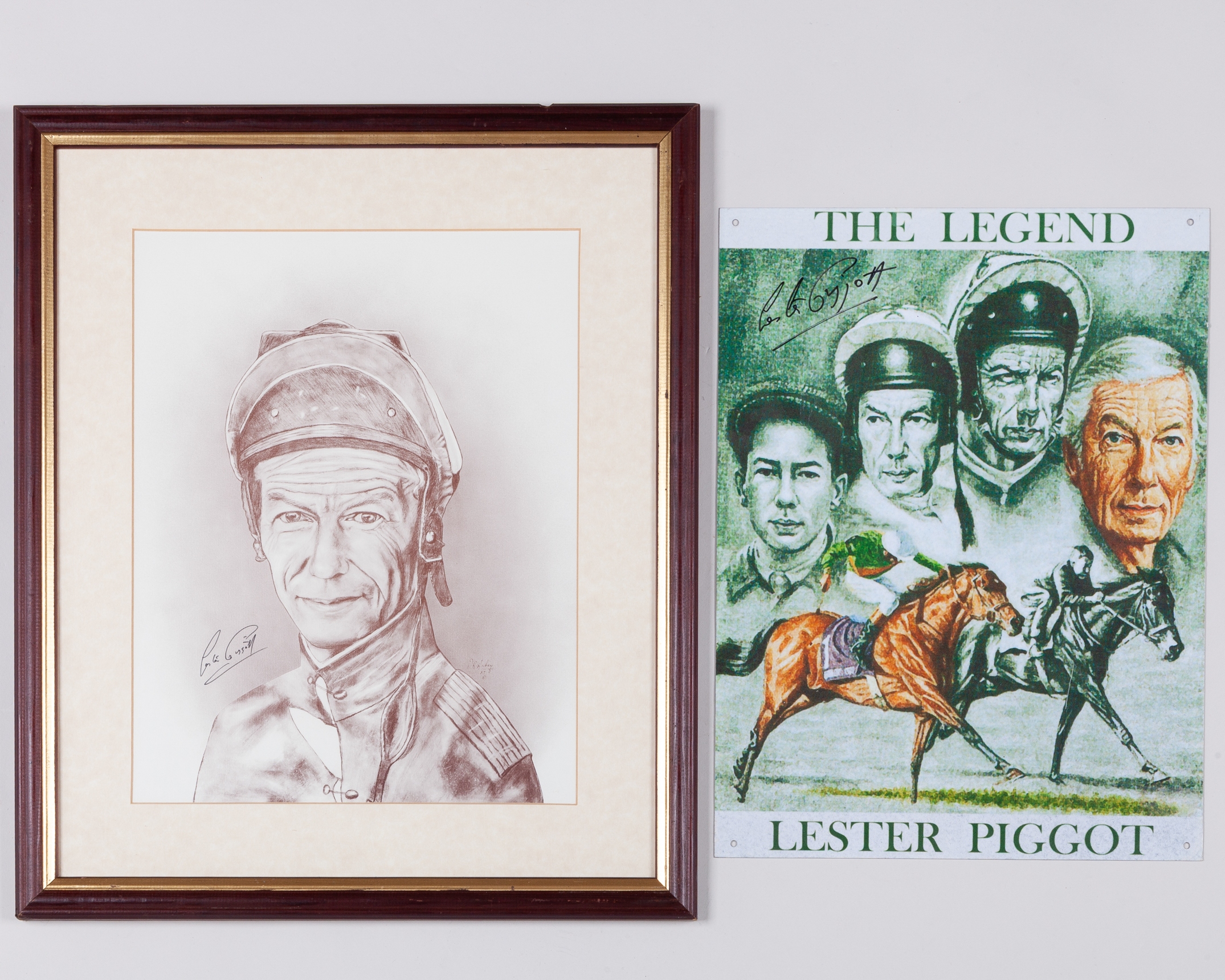 one by Peter Deighan printed on metal sheet titled "The Legend, Lester Piggott, signed in black marker, drilled for wall mounting, 40 by 30cm.; and a signed portrait, mounted, framed and glazed, 50 by 42cm.