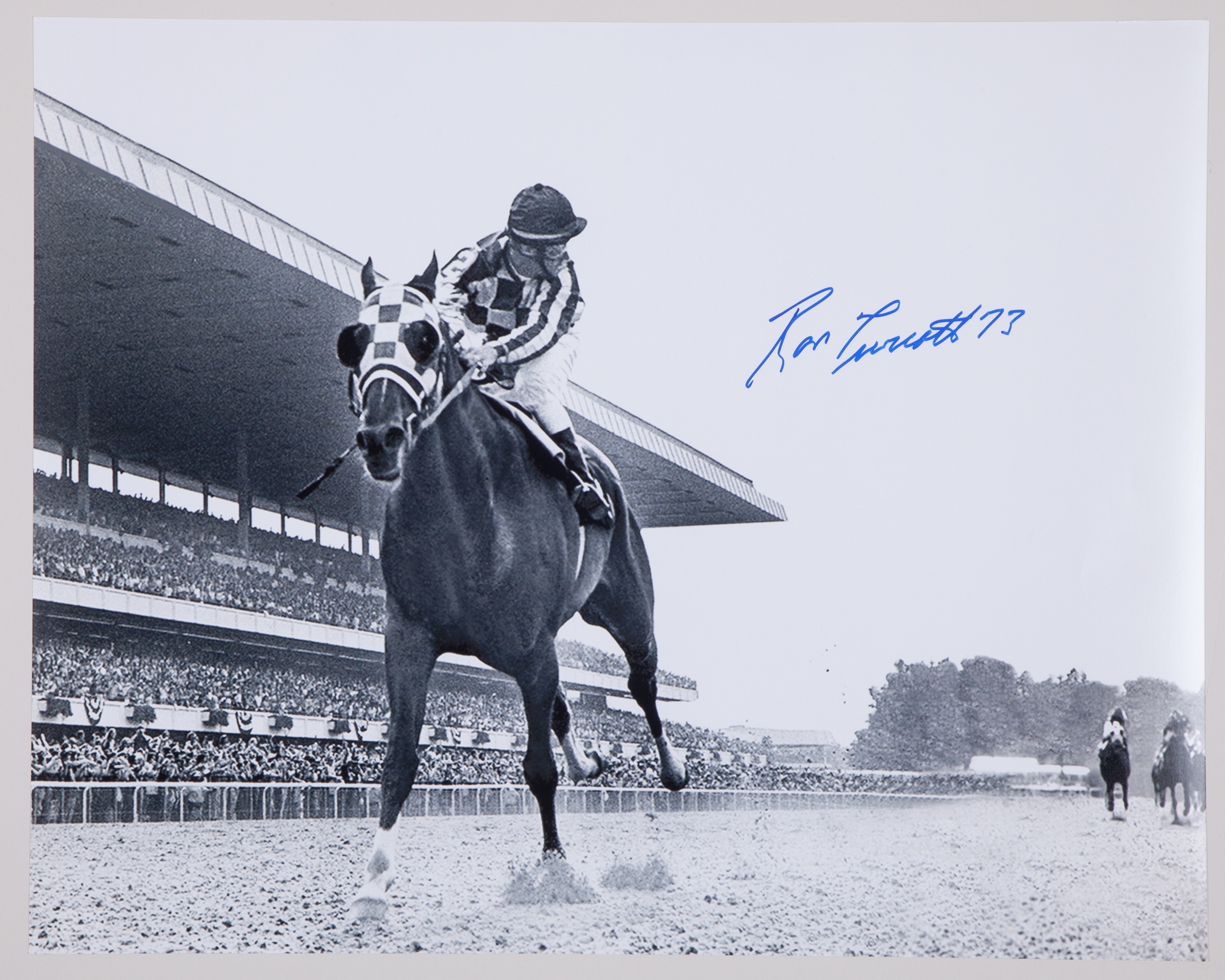 Black & white photograph of Triple Crown winner Secretariat signed by jockey Ron Turcotte,