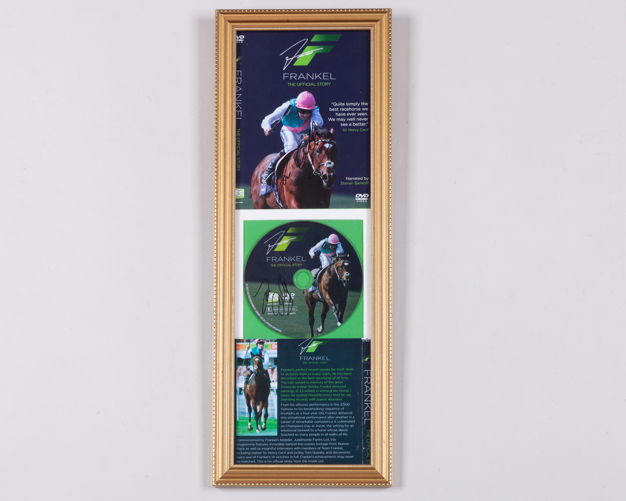 the Frankel Official Story DVD disc signed by the jockey in black marker and mounted with the marketing literature under glass in a gilt frame, 48 by 18cn.