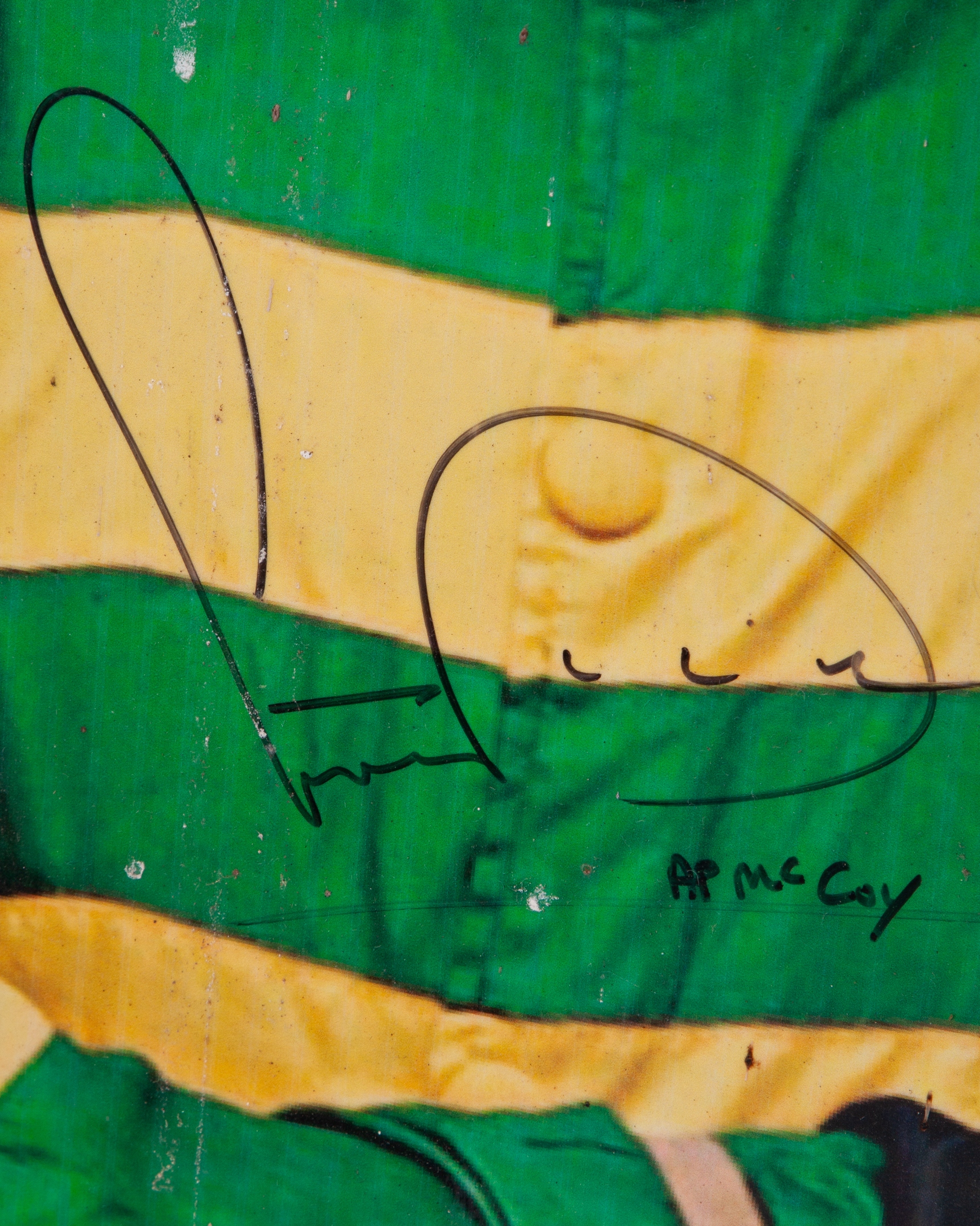 in the J.P. colours, signed in black marker, the ever-driven jockey also correcting the 4,000 printing to 5,000; sold together with a sash created to promote people to vote for A.P. at the BBC Sports Personality of the Year Awards in 2010 (2)