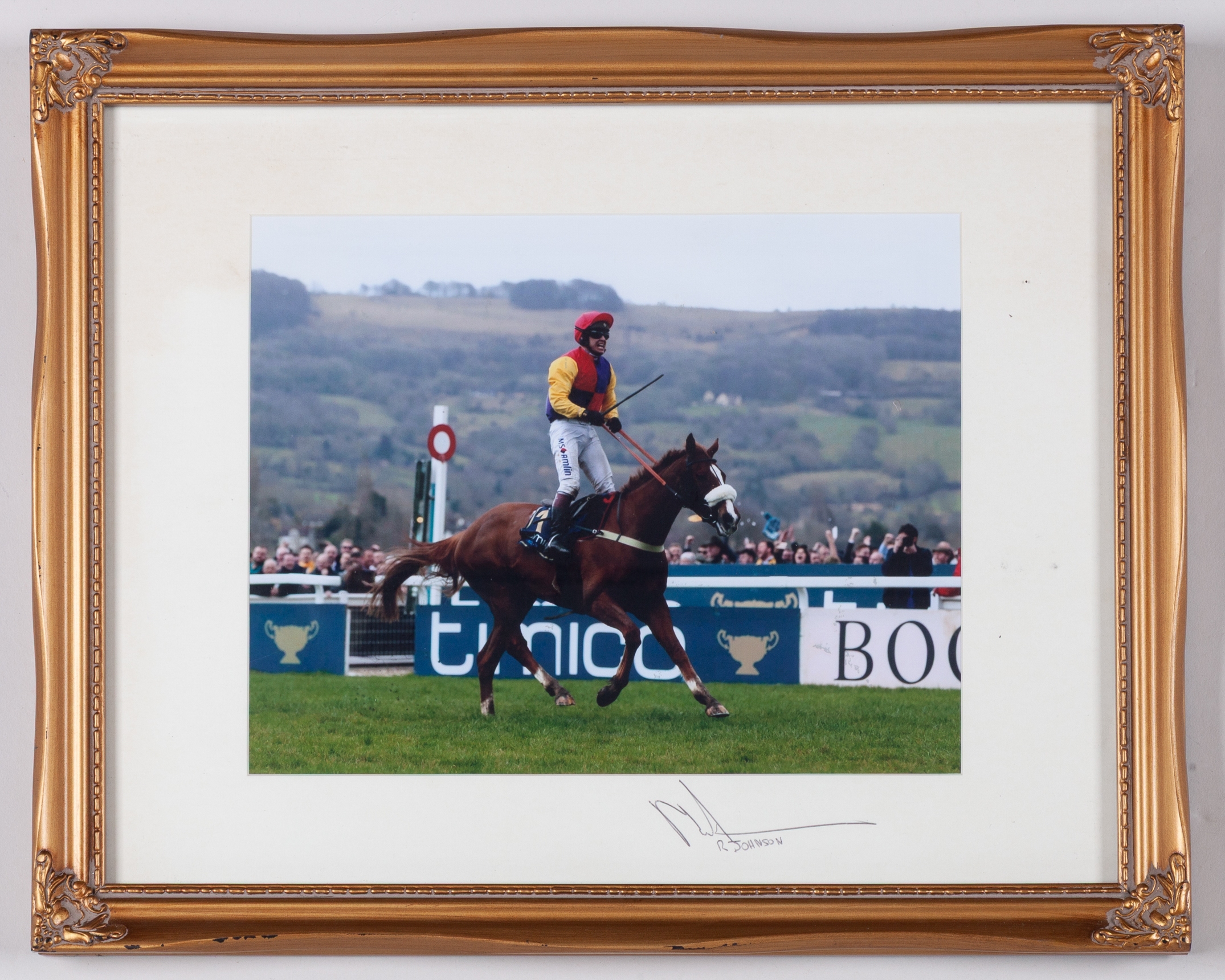8 by 10in. colour photograph, signed to the mount in ink by the jockey, framed & glazed, 31 by 39cm.