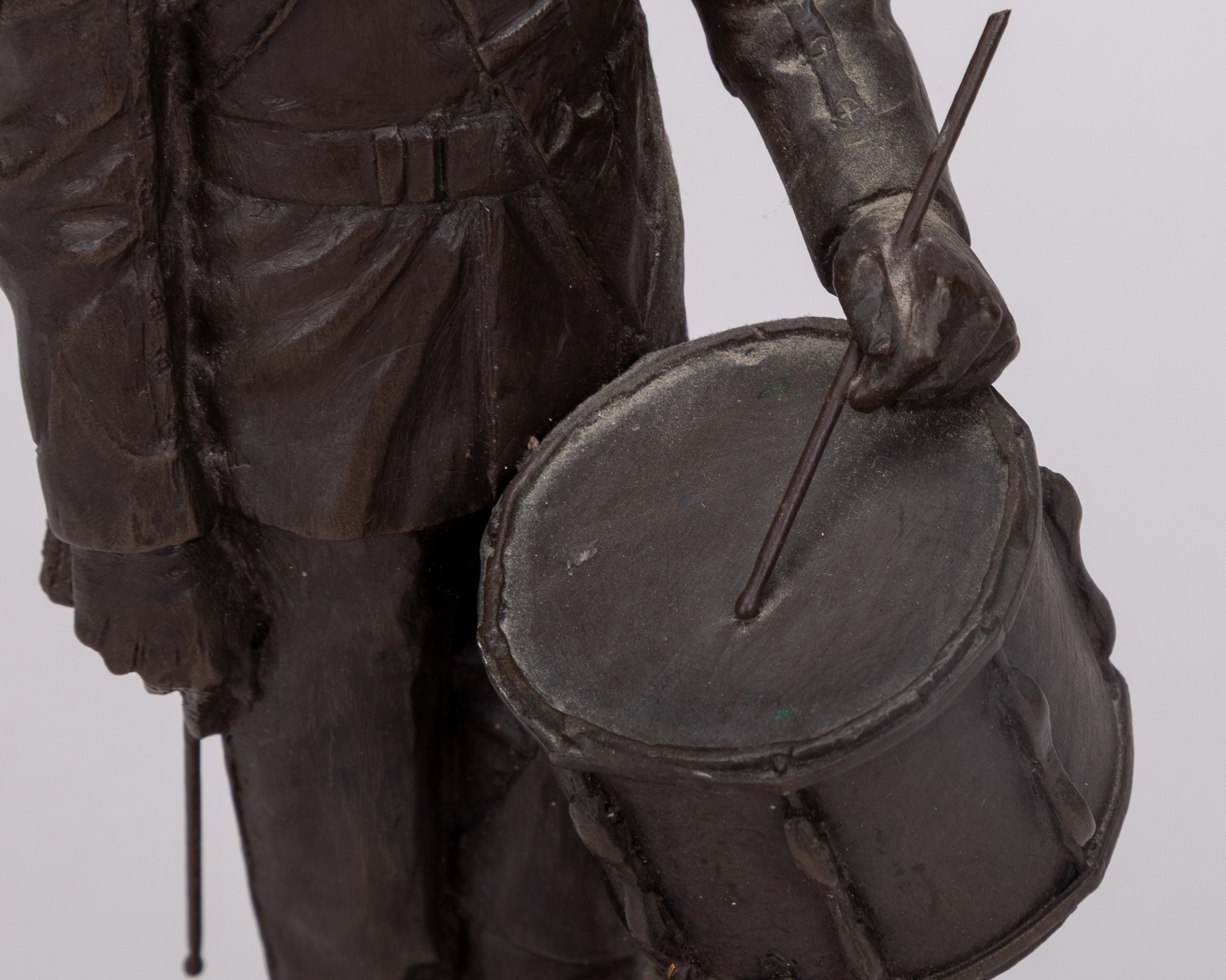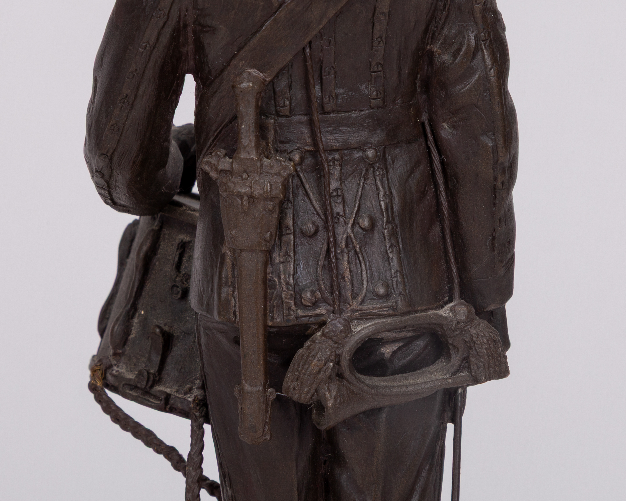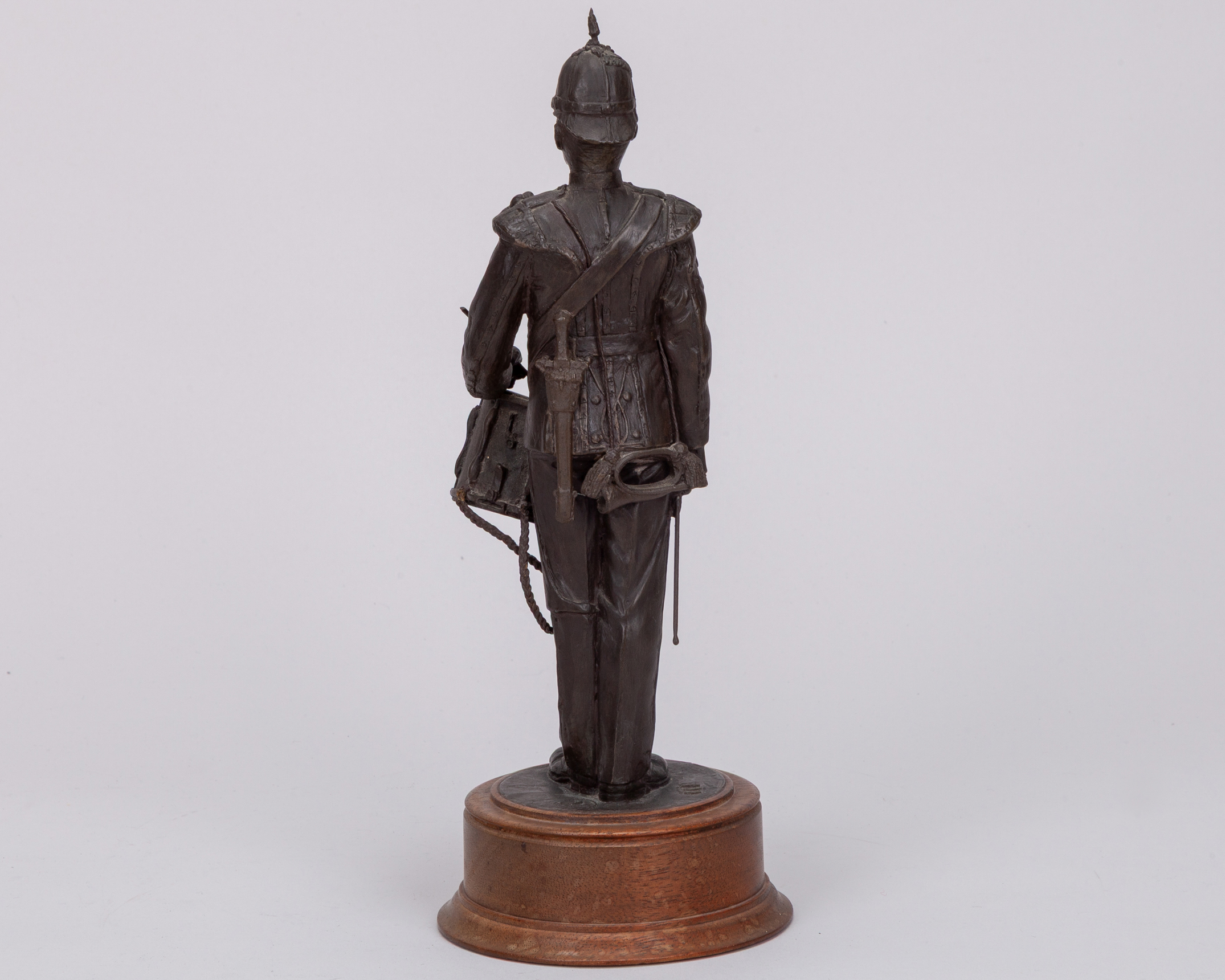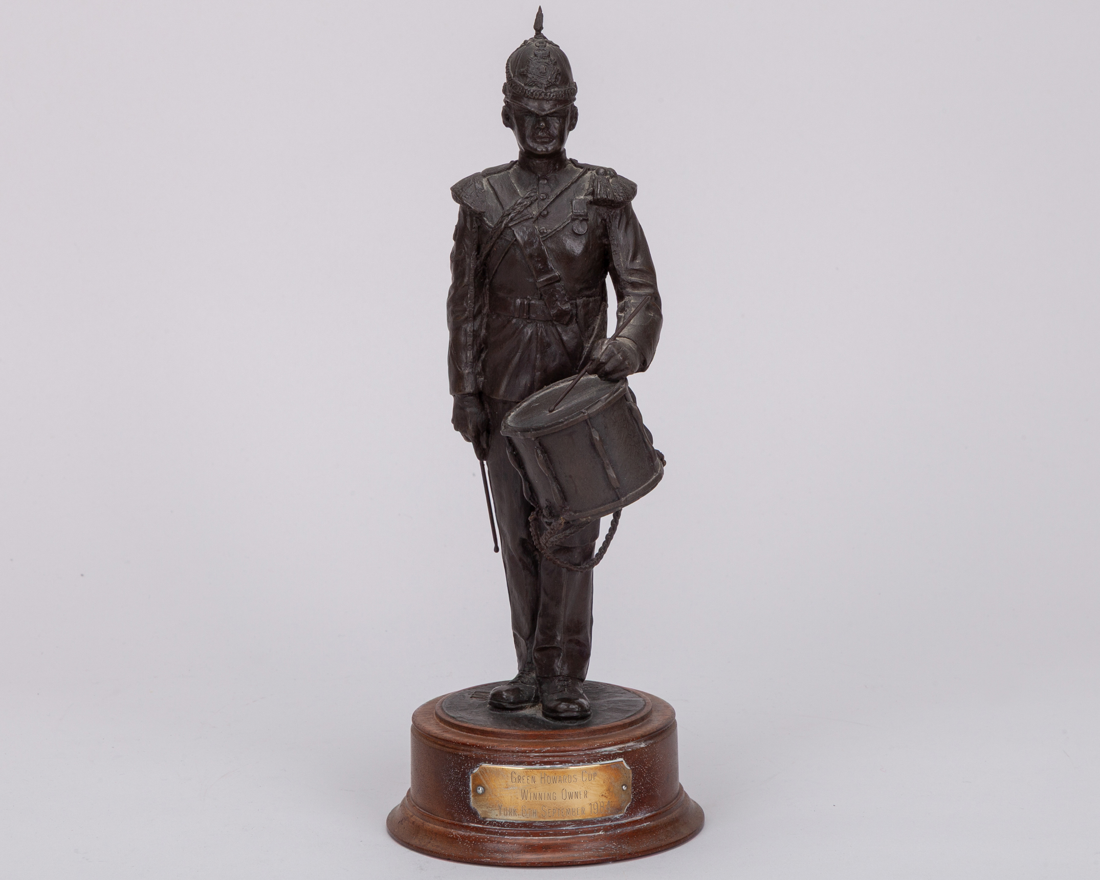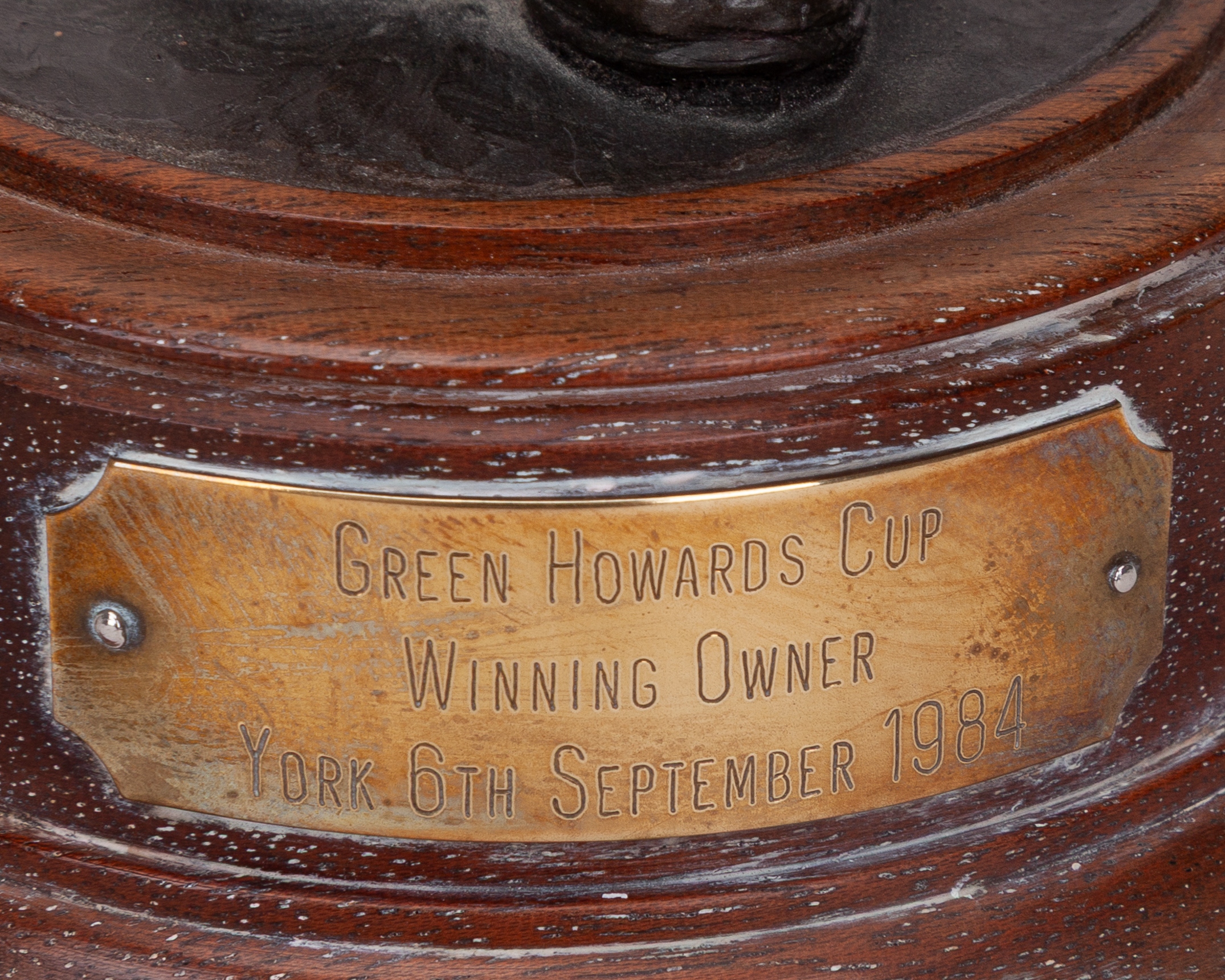 in the form of a bronze figure of a Green Howards Drum Major by the sculptor Peter Hicks, set on a circular wooden base applied with a plaque reading GREEN HOWARDS CUP, WINNING OWNER, YORK 6th SEPTEMBER 1984, height 25.5cm.