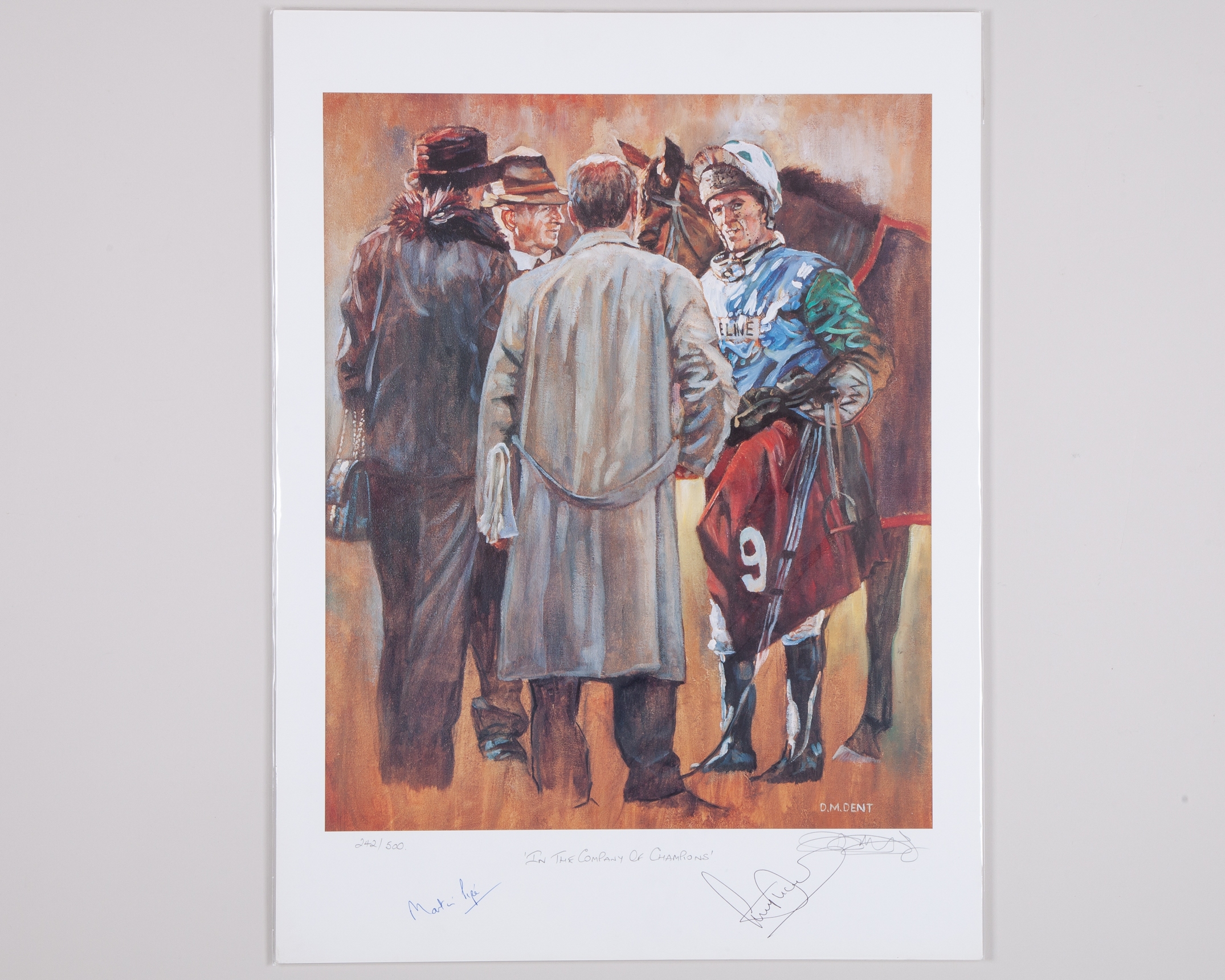 Two autographed horse racing prints by David Dent (British, b.1959),