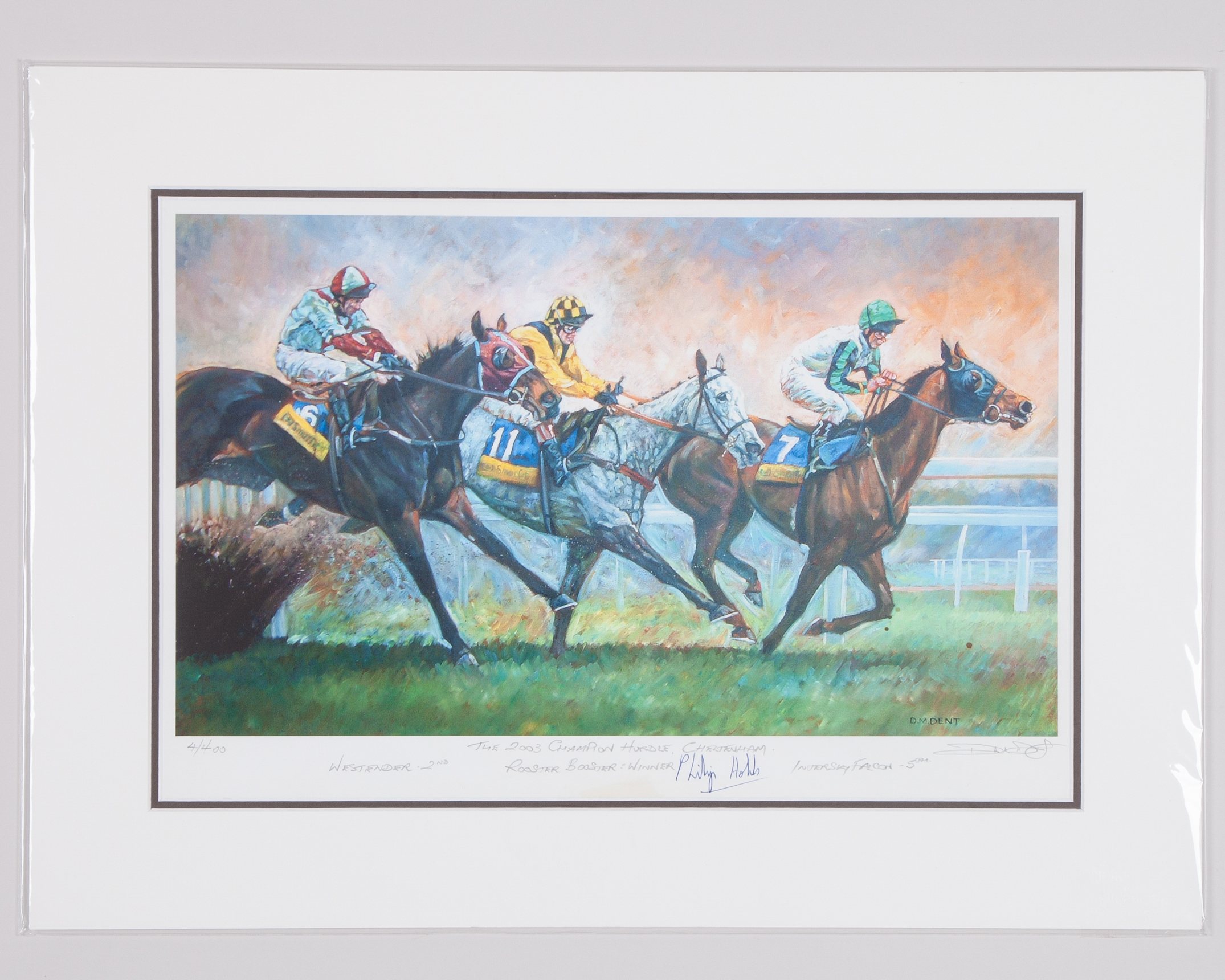 both signed by the artist, the first additionally signed by trainer Philip Hobbs titled; The 2003 Champion Hurdle, Cheltenham, mounted, 57 by 42cm overall, the second additionally signed by Martin Pipe and A.P. McCoy titled; In The Company of Champions, 242/500, 44 by 59cm (2)