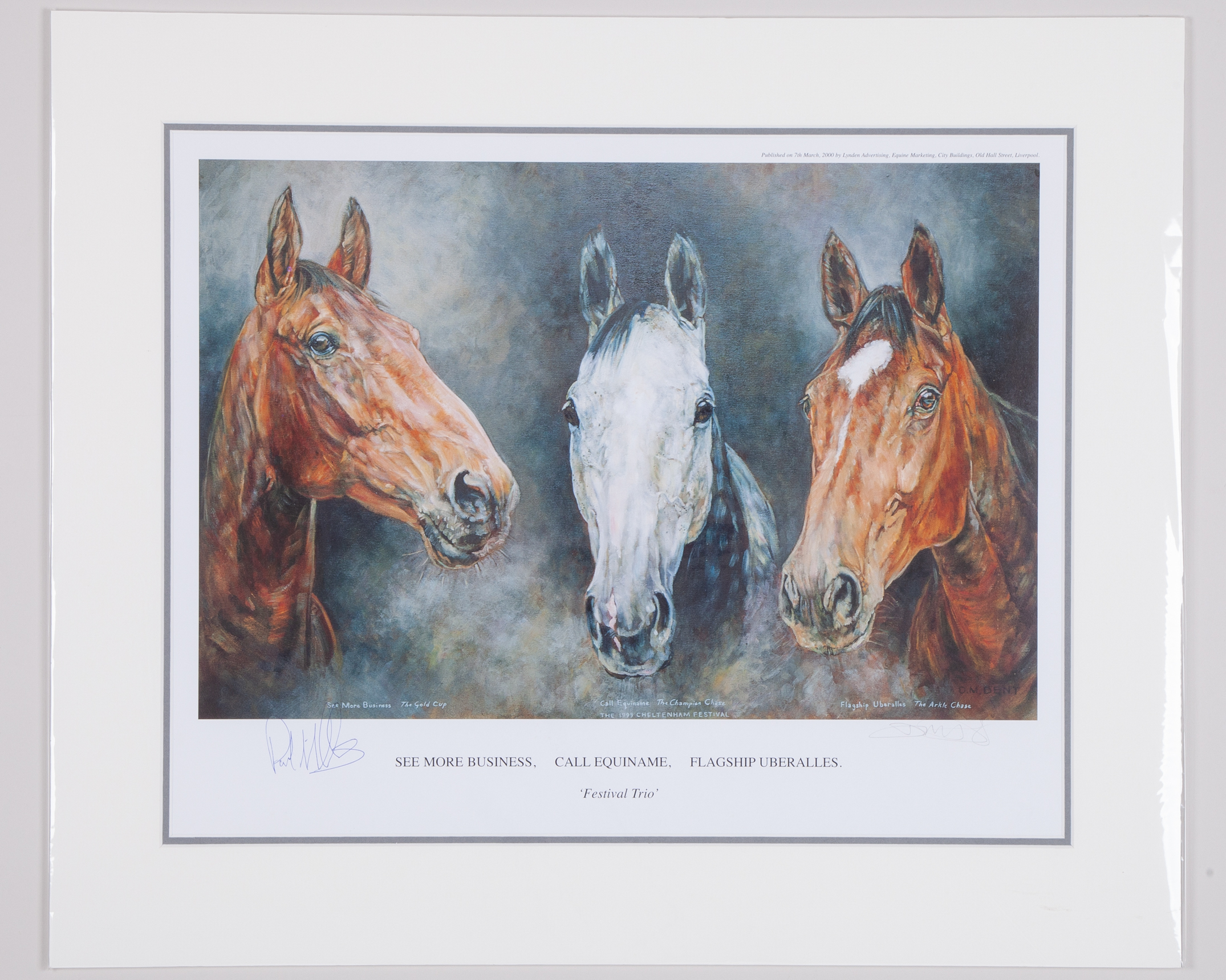 both signed by the artist, the first additionally signed by Paul Nicholls titled; Festival Trio, mounted, 61 by 51cm overall, the second additionally signed by Martin Pipe and A.P. McCoy titled; In The Company of Champions, 238/500, mounted, 50 by 65cm overall (2)