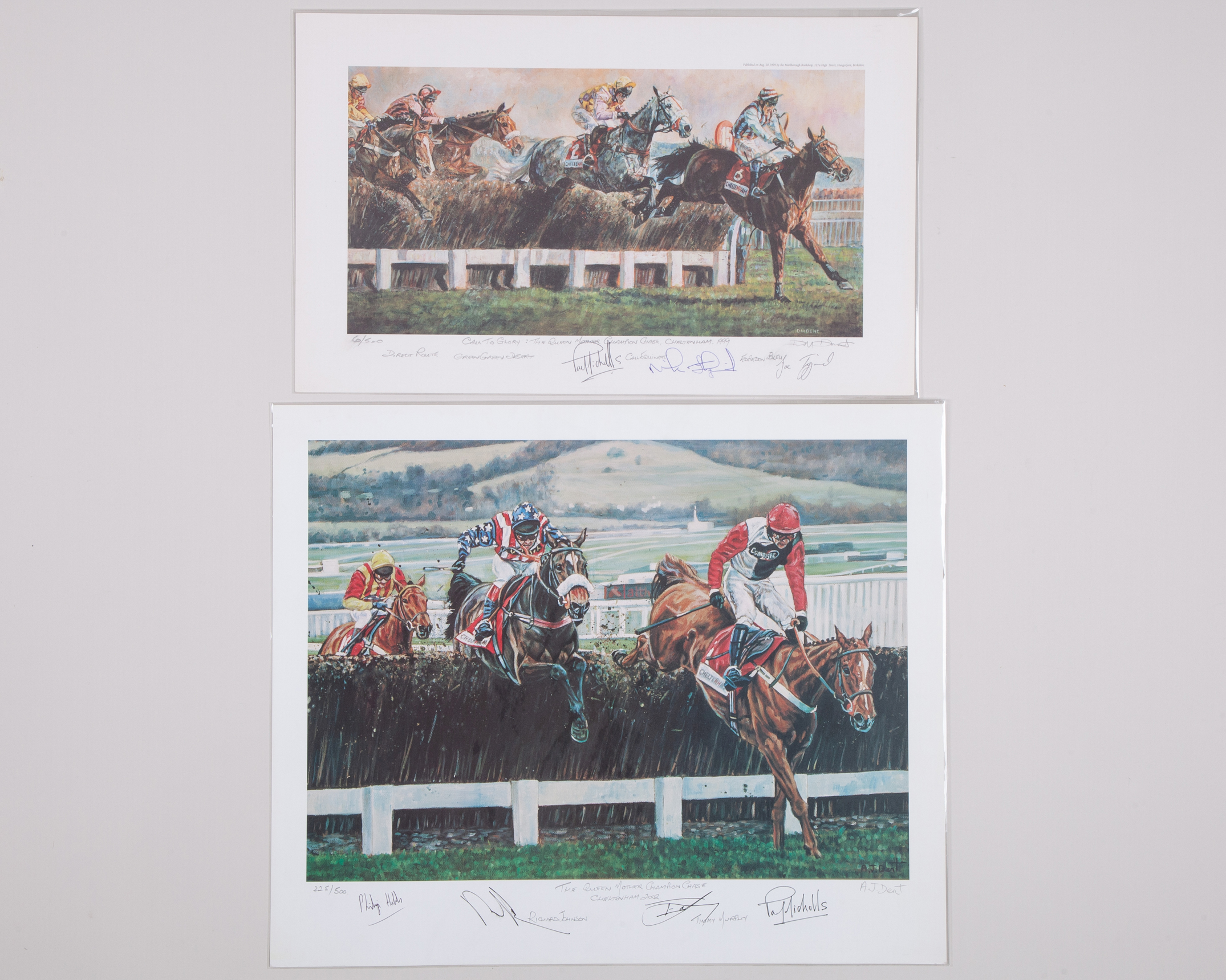 A pair of autographed The Queen Mother Champion Chase limited edition prints by the brothers David Dent (British, b.1959) and Adrian Dent (British, b.1966),