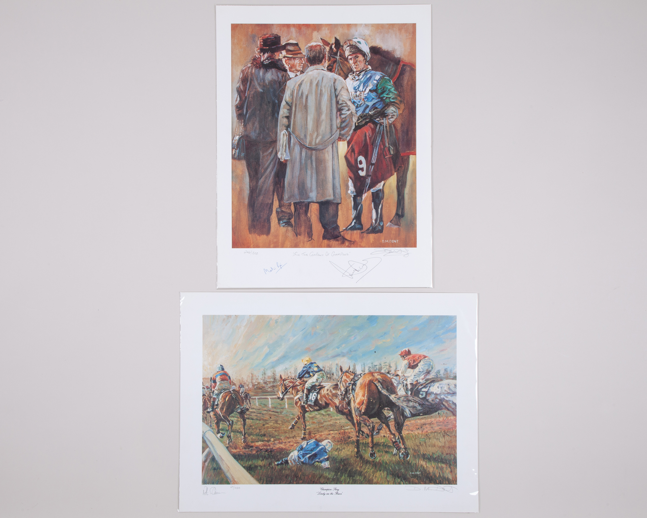 Two autographed horse racing limited edition prints by David Dent (British, b.1959)