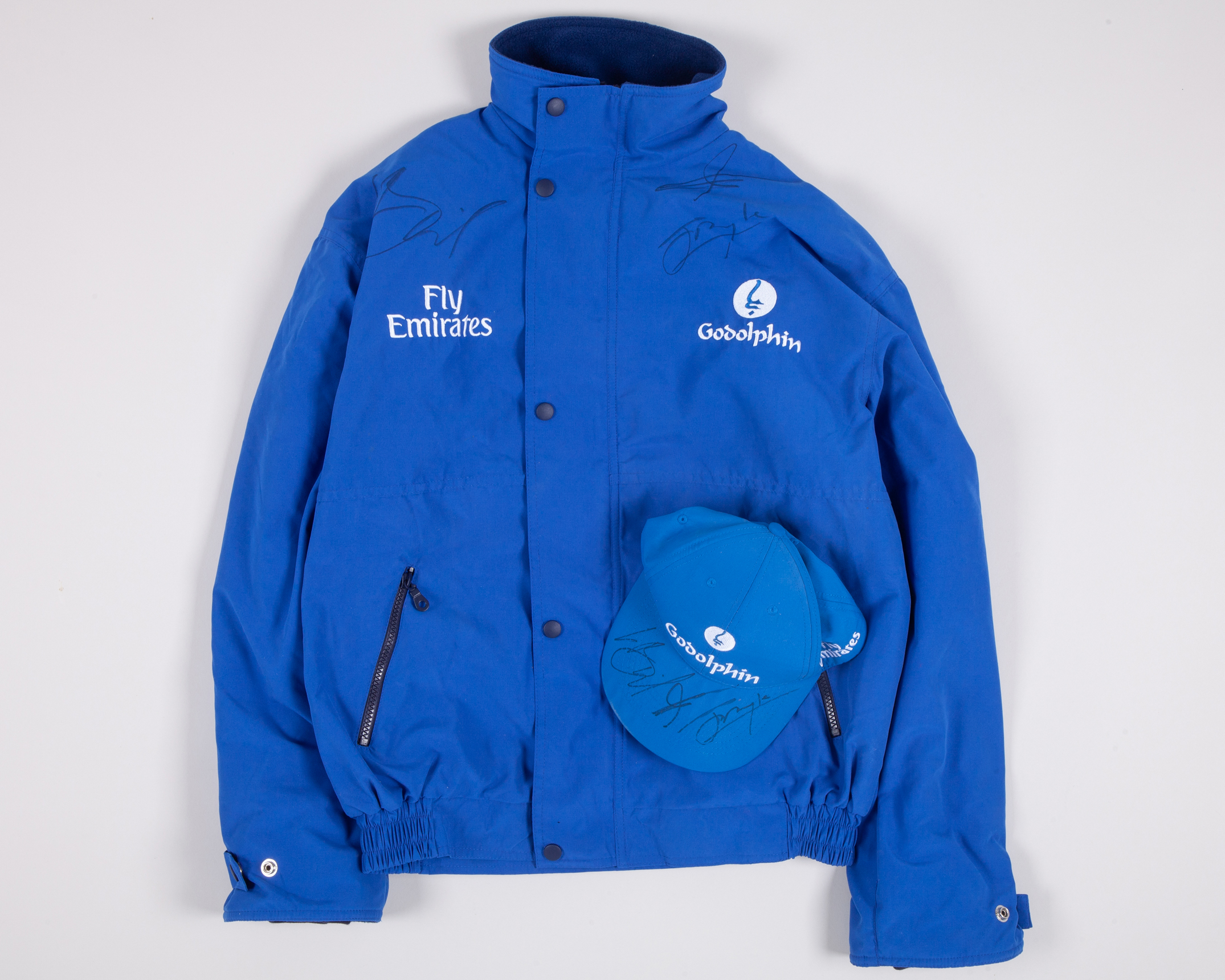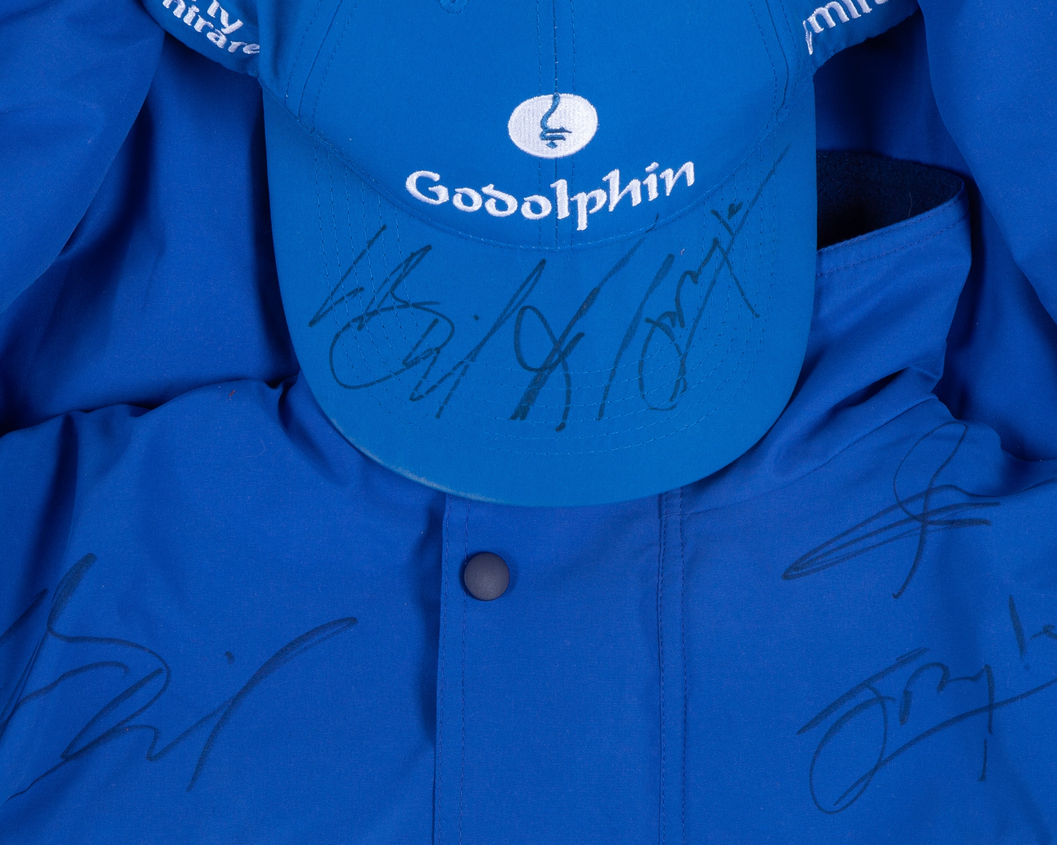 Godolphin Racing jacket and cap both signed by the jockeys Frankie Dettori, William Buick and James Doyle,