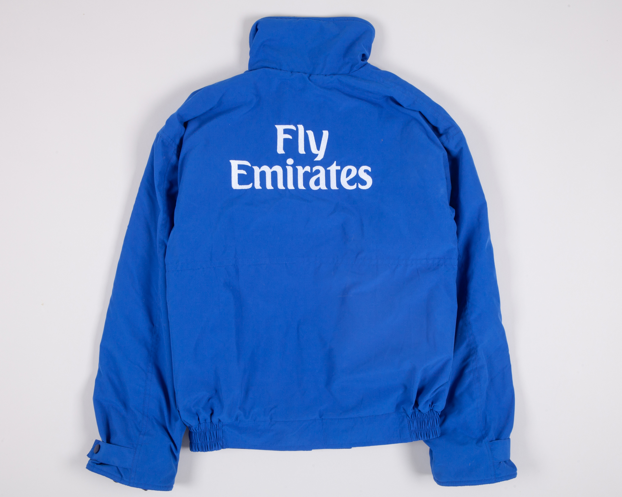 branded fleece-lined cold weather jacket and baseball cap, both items signed by the three jockeys in black marker