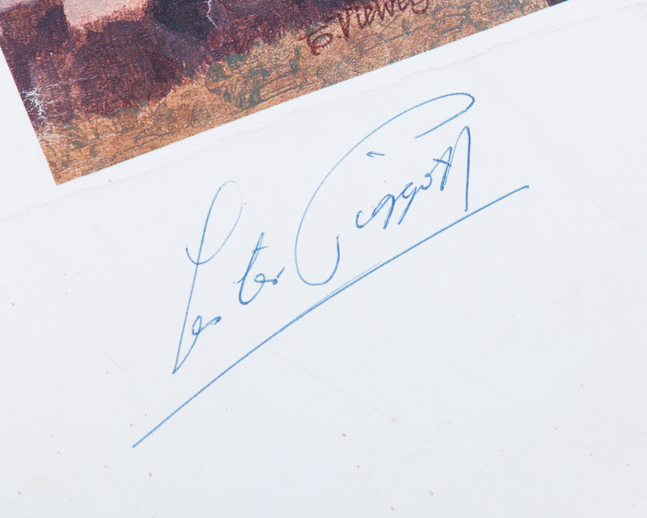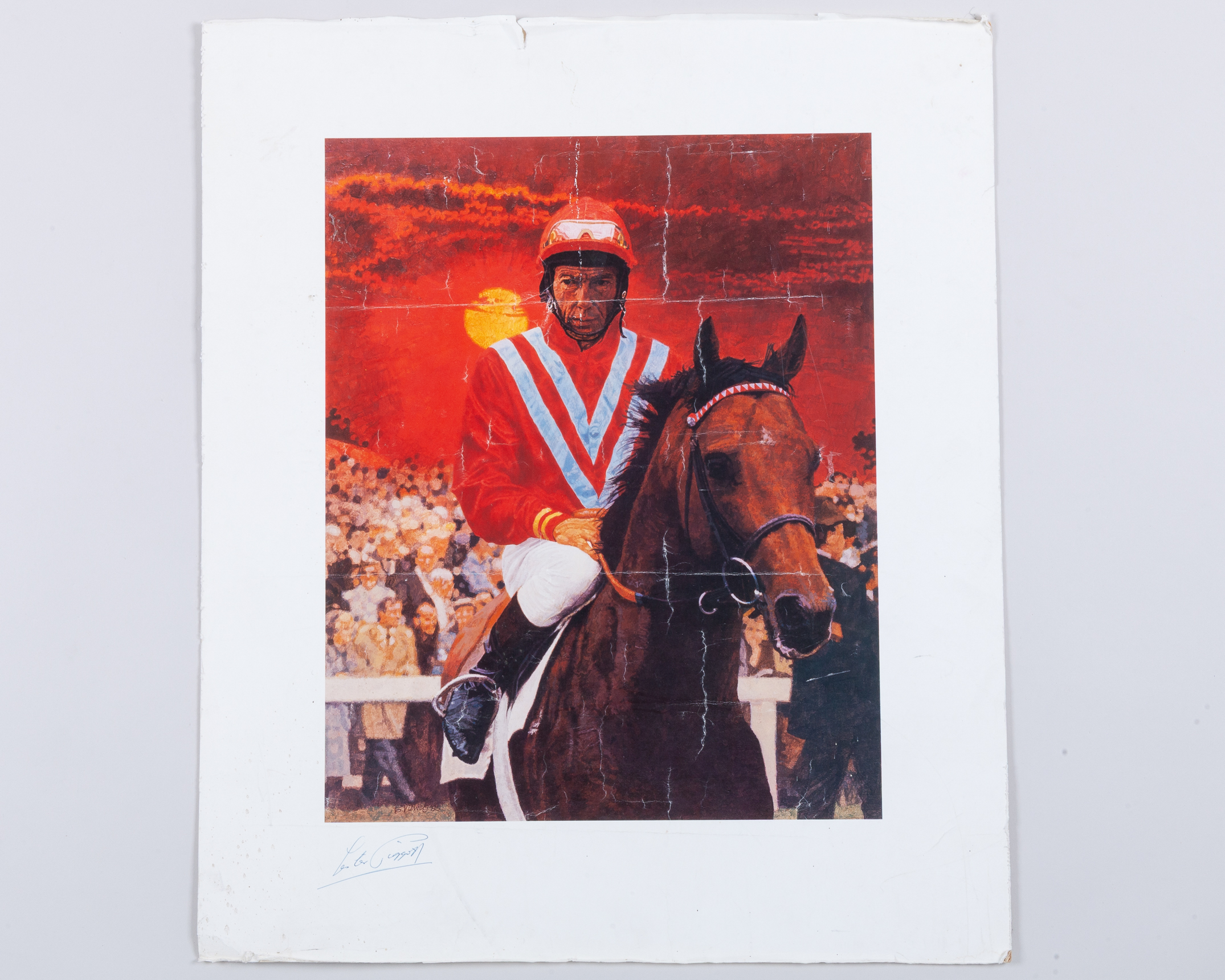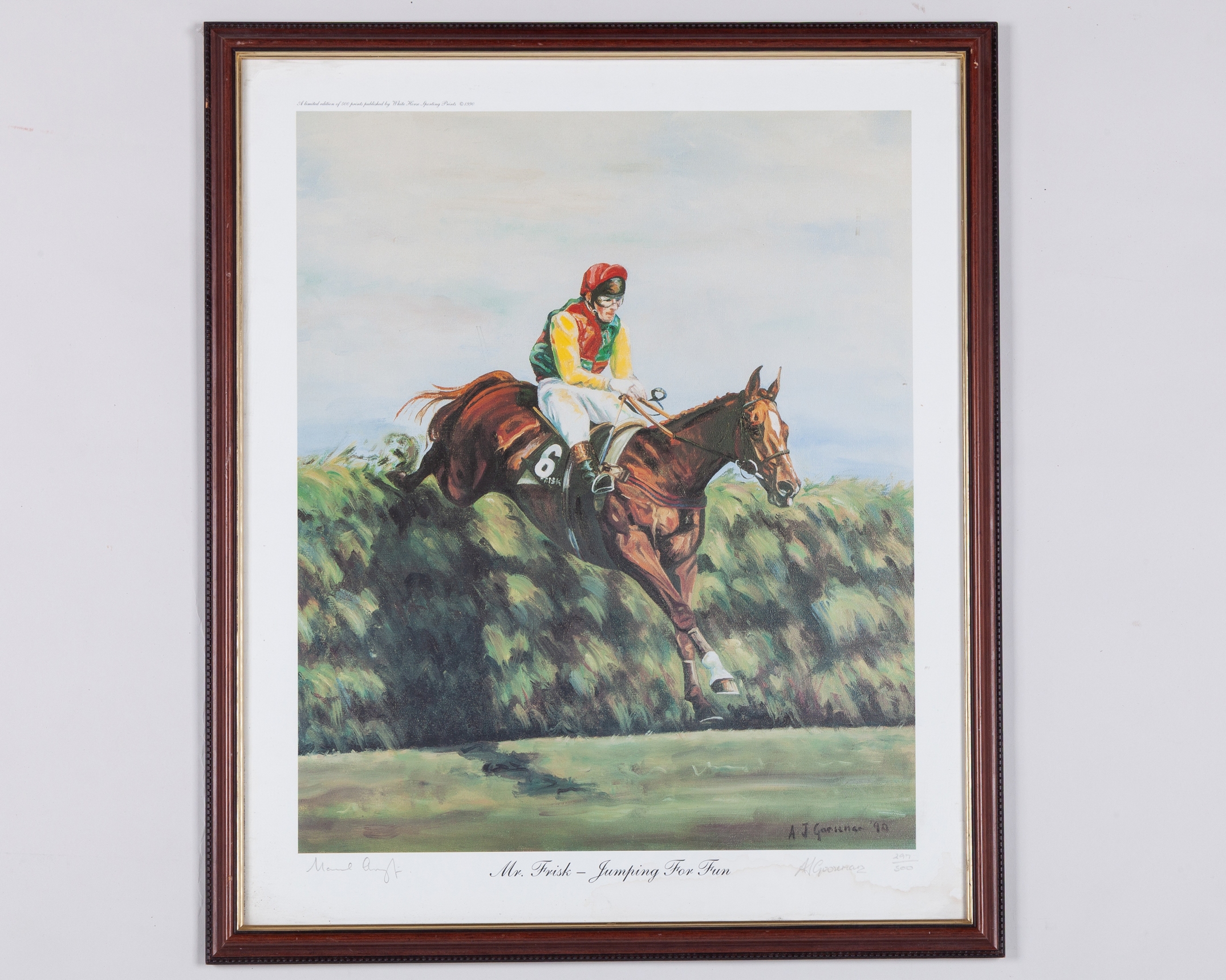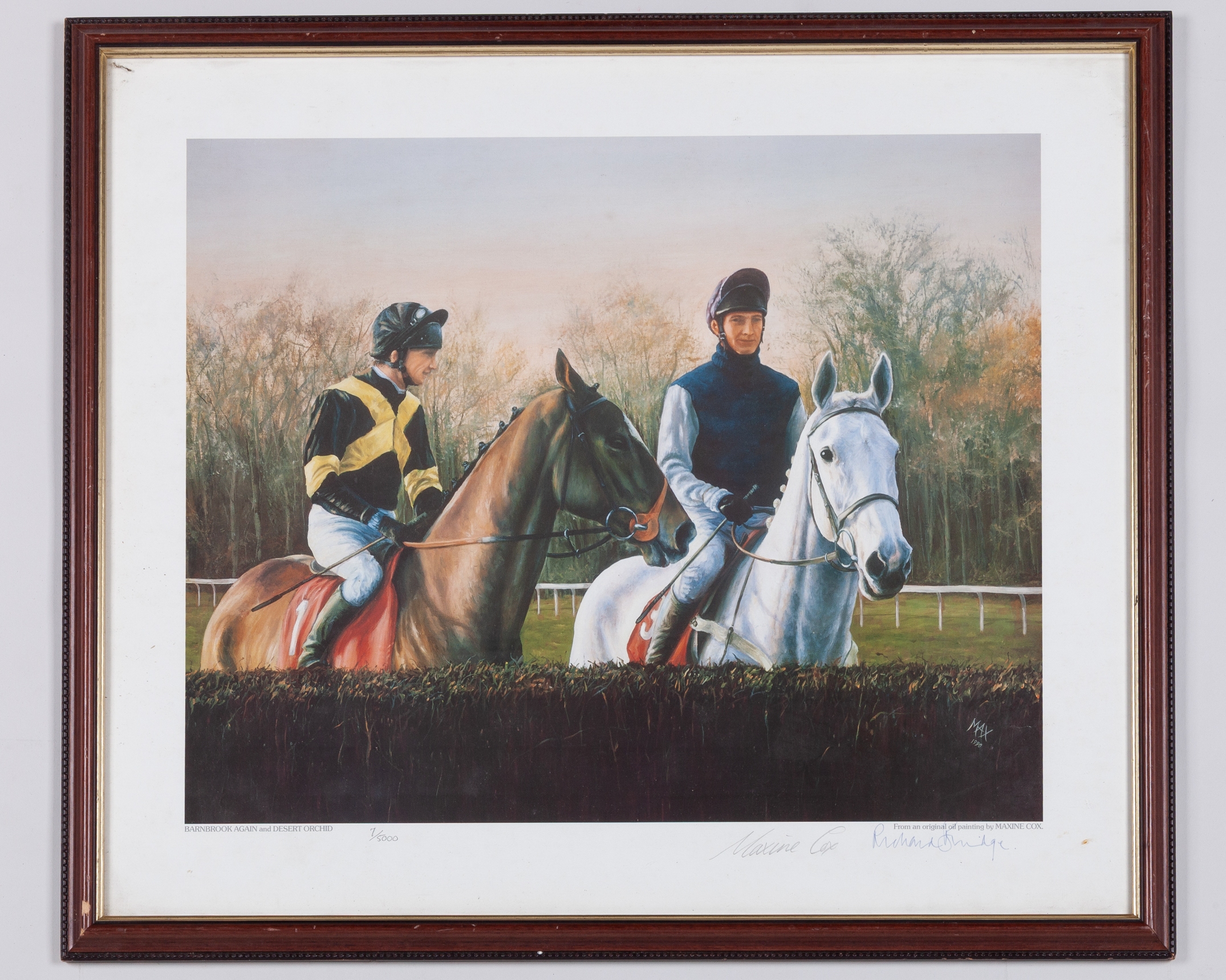 subjects comprising Mr Frisk signed by jockey Marcus Armytage, Desert Orchid signed by owner Richard Burridge and Commanche Run signed by Lester Piggott, the first two framed & glazed, the Commanche Run unframed and in poor condition, various sizes, the largest 53 by 66cm.