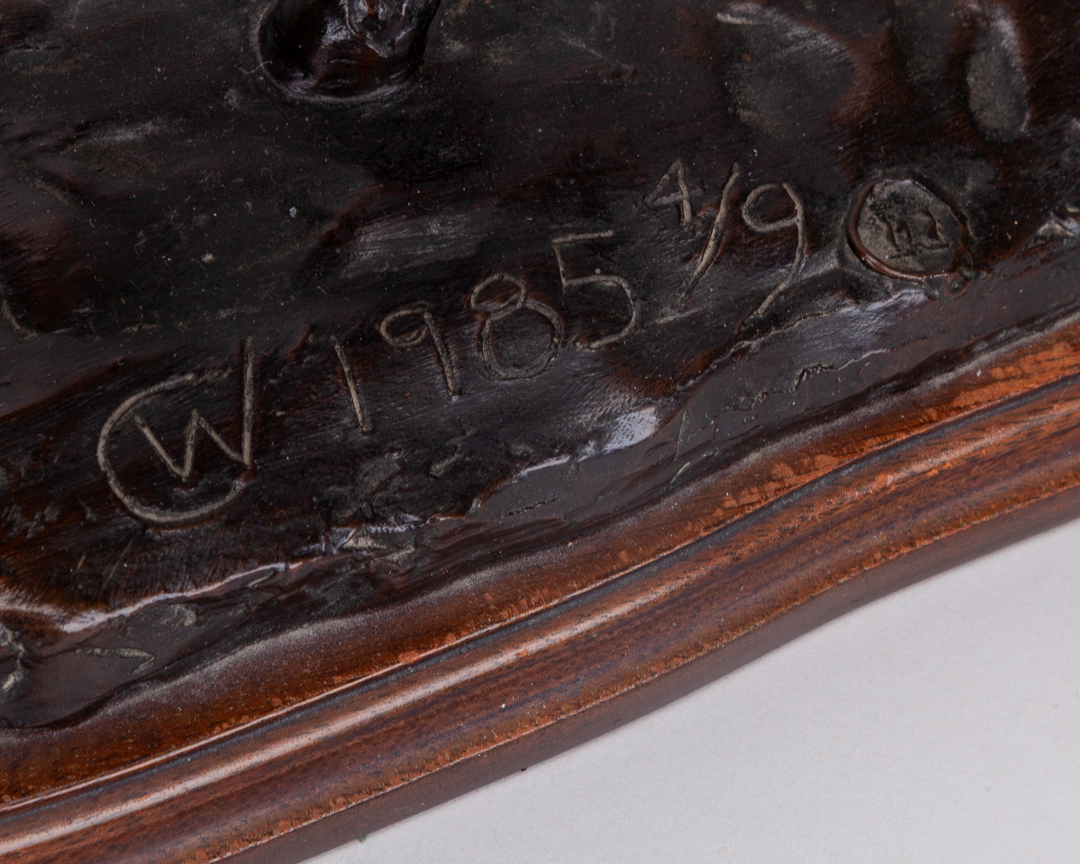 signed with initials, dated 1985, numbered 4/9 and impressed with the artist's signet ring, bronze, rich brown patina, two racehorses and stable riders on a fast work morning, 35 by 60cm.