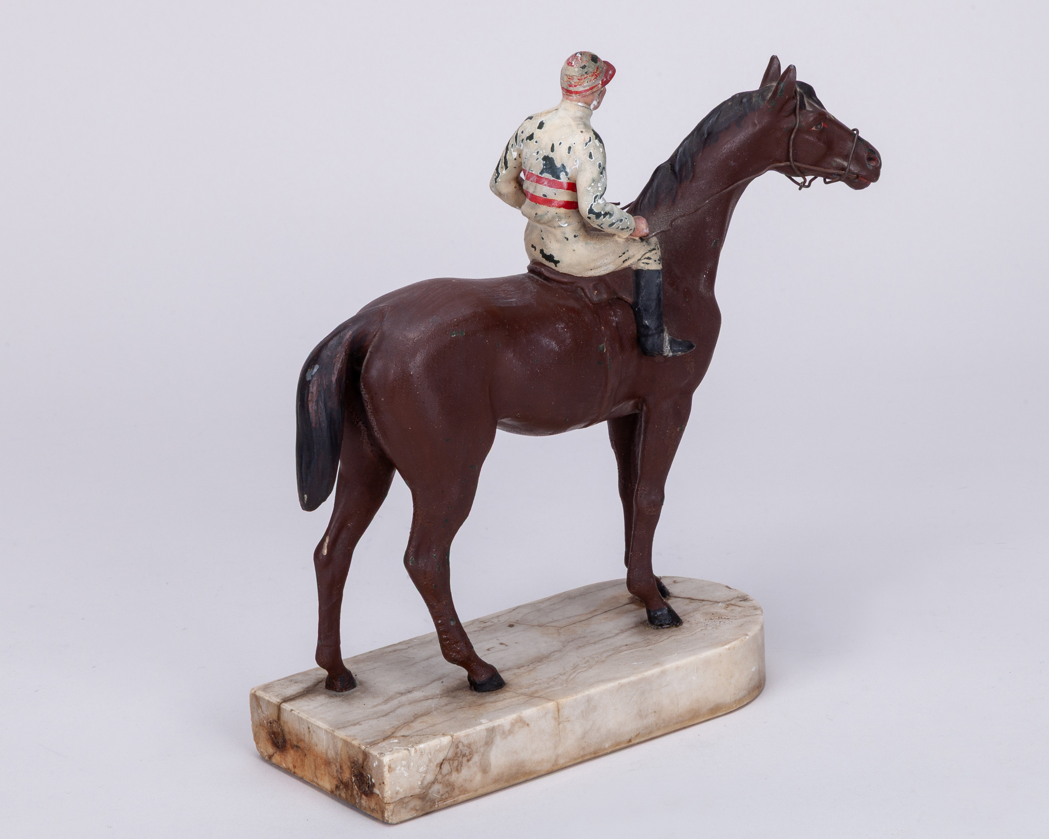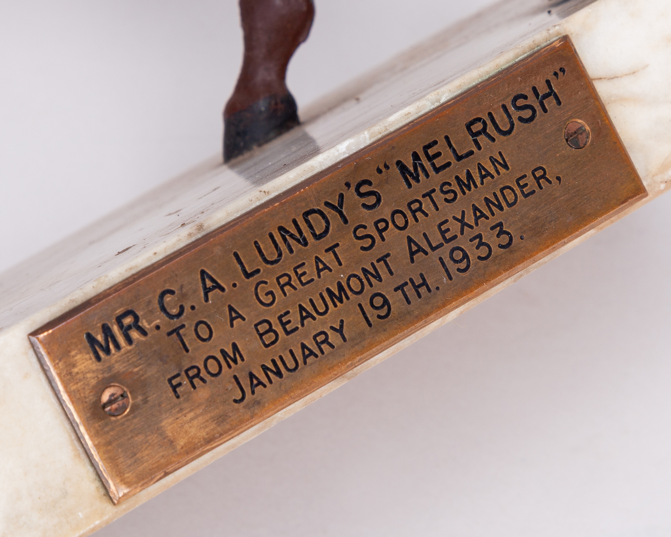 the marble base set with plaque inscribed MR. C. A. LUNDY'S “MELRUSH”, TO A GREAT SPORTSMAN, FROM BEAUMONT ALEXANDER, JANUARY 19th. 1933, height 23cm., some paint loss to jockey's colours