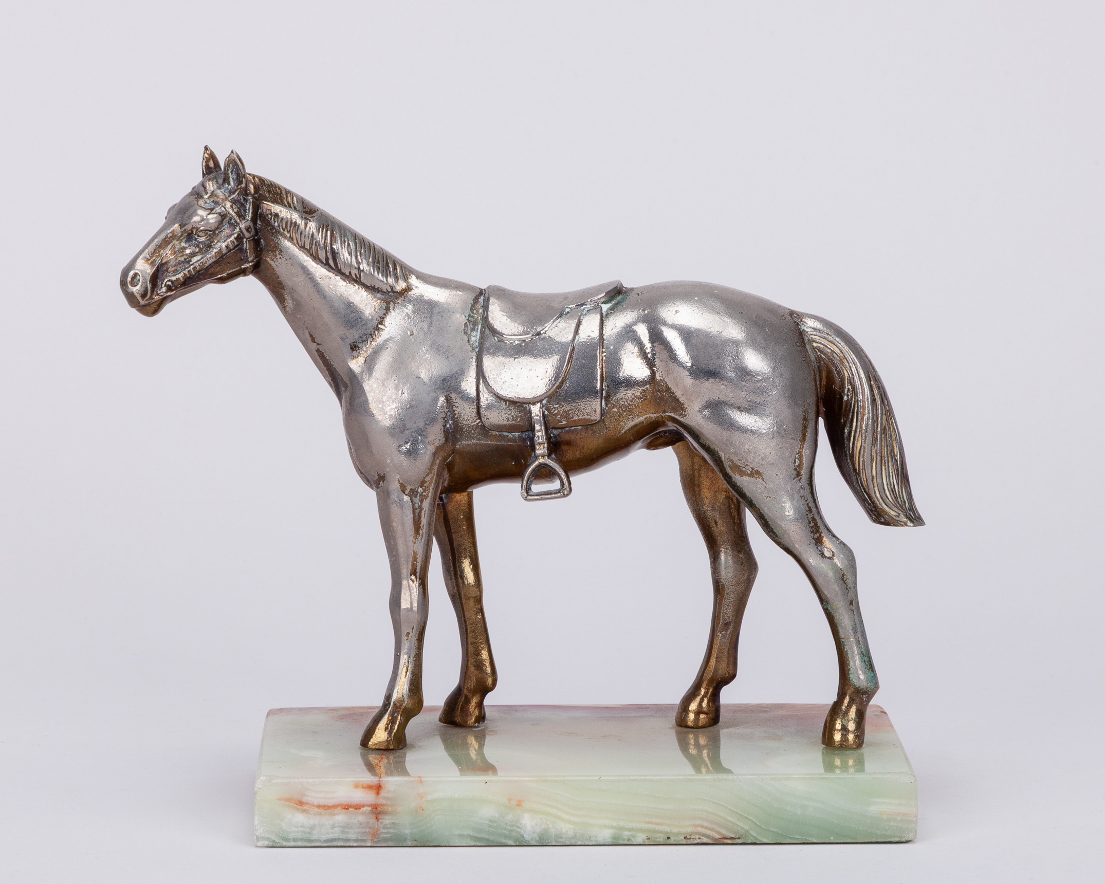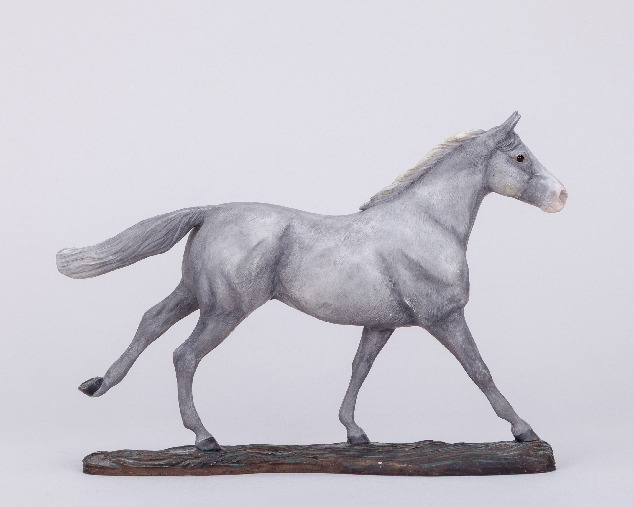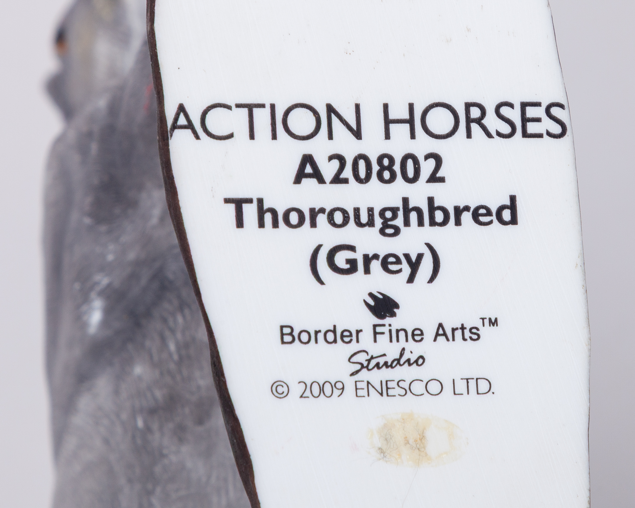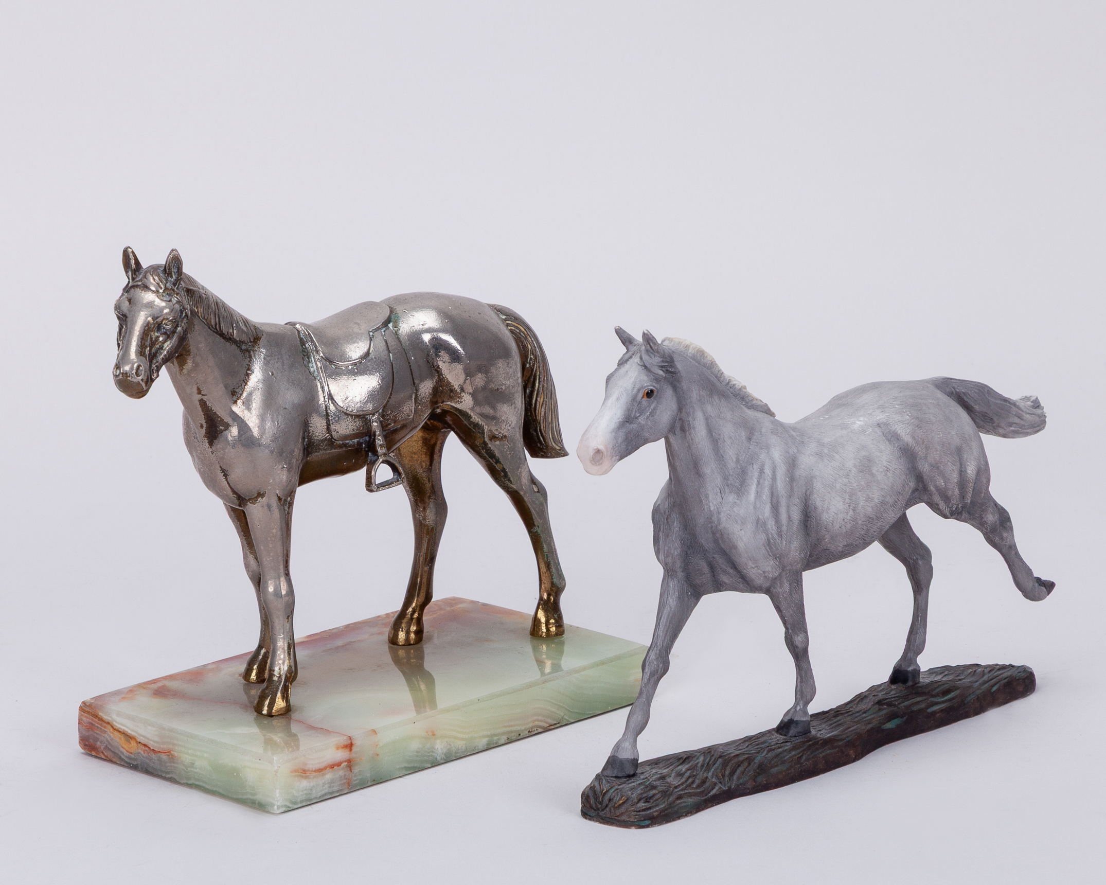 the first a chromed model of a saddled horse on an onyx base, 19cm. high; the other titled ‘Thoroughbred Grey’ by Border Fine Arts, 2009, 17cm. high