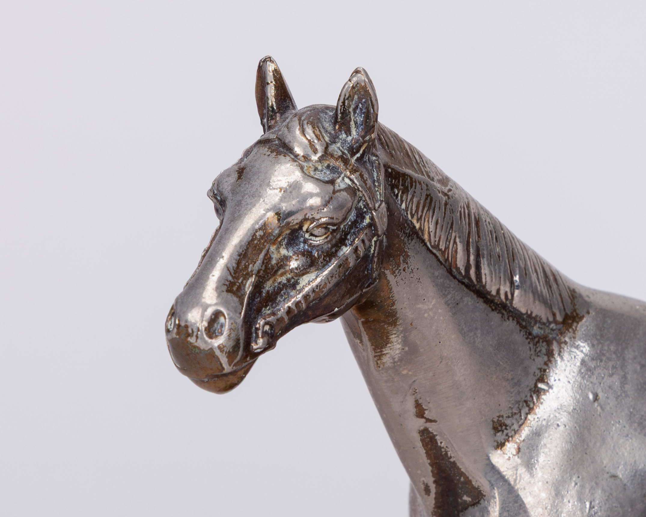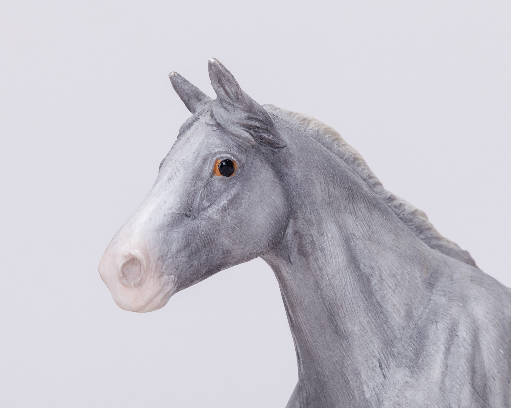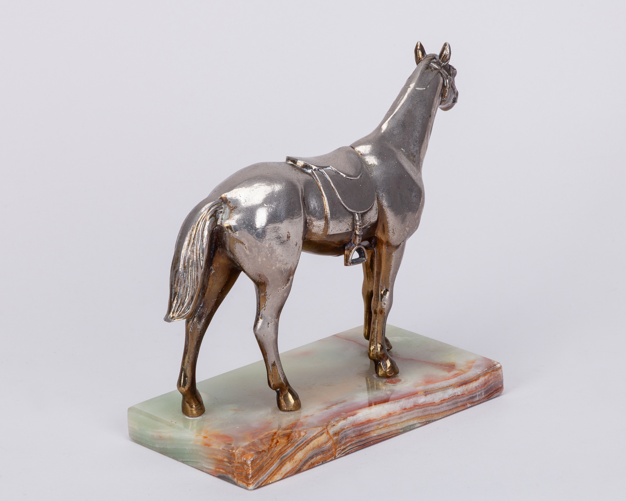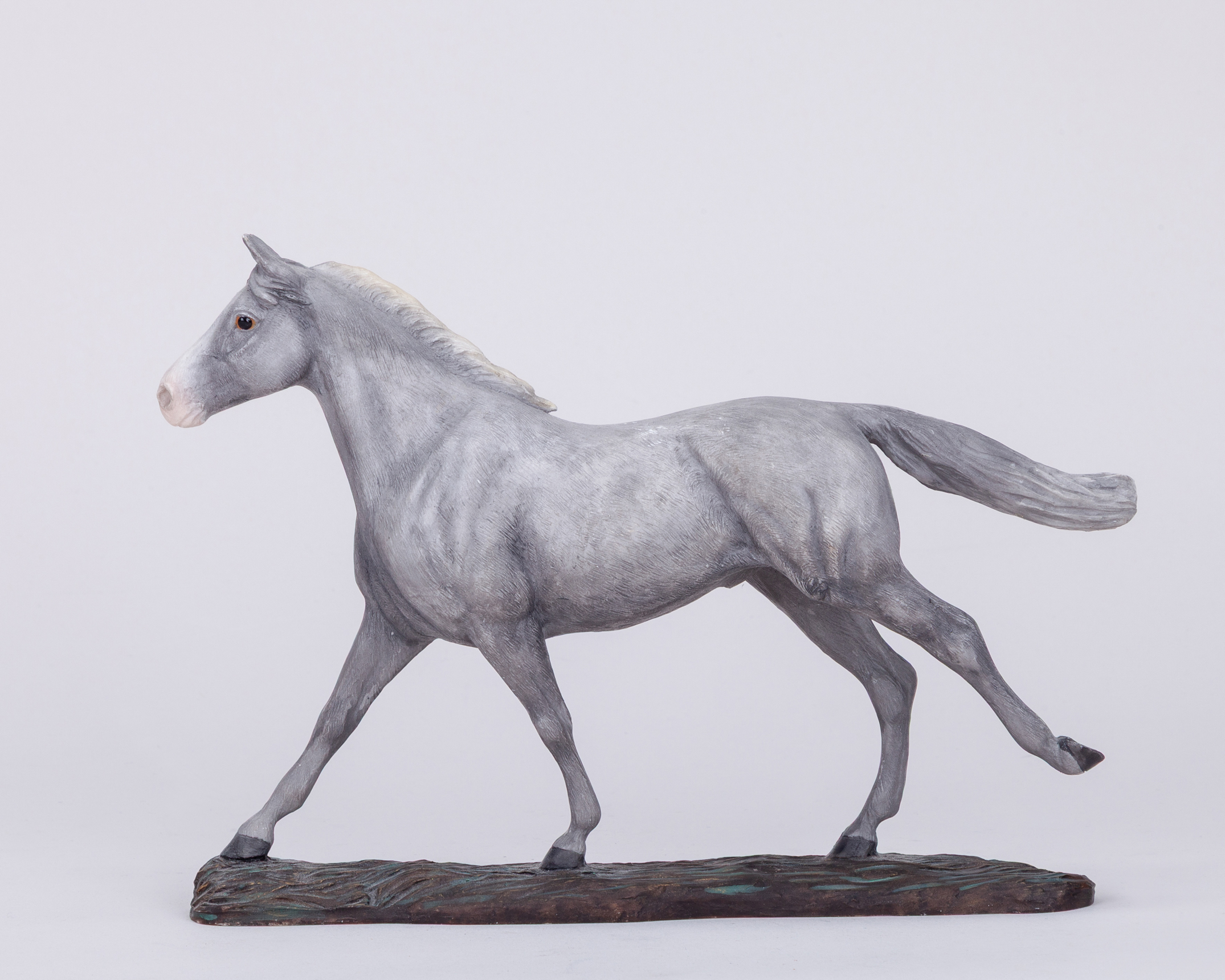 the first a chromed model of a saddled horse on an onyx base, 19cm. high; the other titled ‘Thoroughbred Grey’ by Border Fine Arts, 2009, 17cm. high