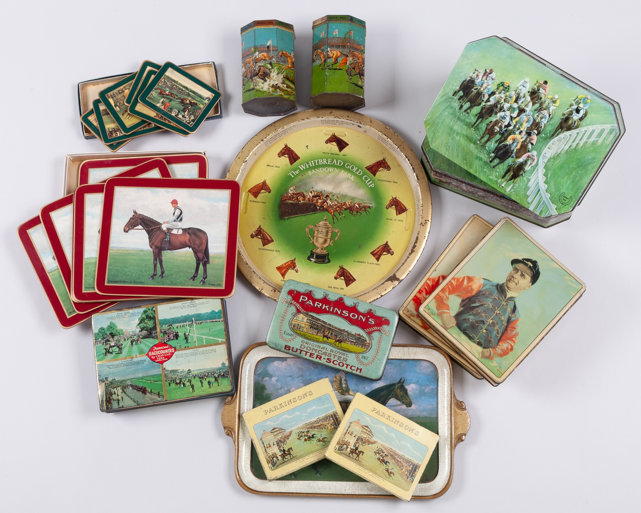 two Lyons tea caddies, one complete with spinning top games, with steeplechasing scenes; three Parkinson's tins for Royal Doncaster Butter-Scoth, with St Leger scenes; two Huntley & Palmer biscuit tins, depicting Tattenham Corner; Famous Racecourses by Craven's of York; and two Peek Frean biscuit tins depicting the jockey Gordon Richards; the lot also including a Whitebread Gold Cup drinks tray; an Italian papier mache drinks tray by Sezzatini, Firenze, bearing a portrait of the 1903 Derby winner Rock Sand with Danny Maher up; a box of table mats with portraits of racehorses; and a box of drinks coasters with St Leger scenes