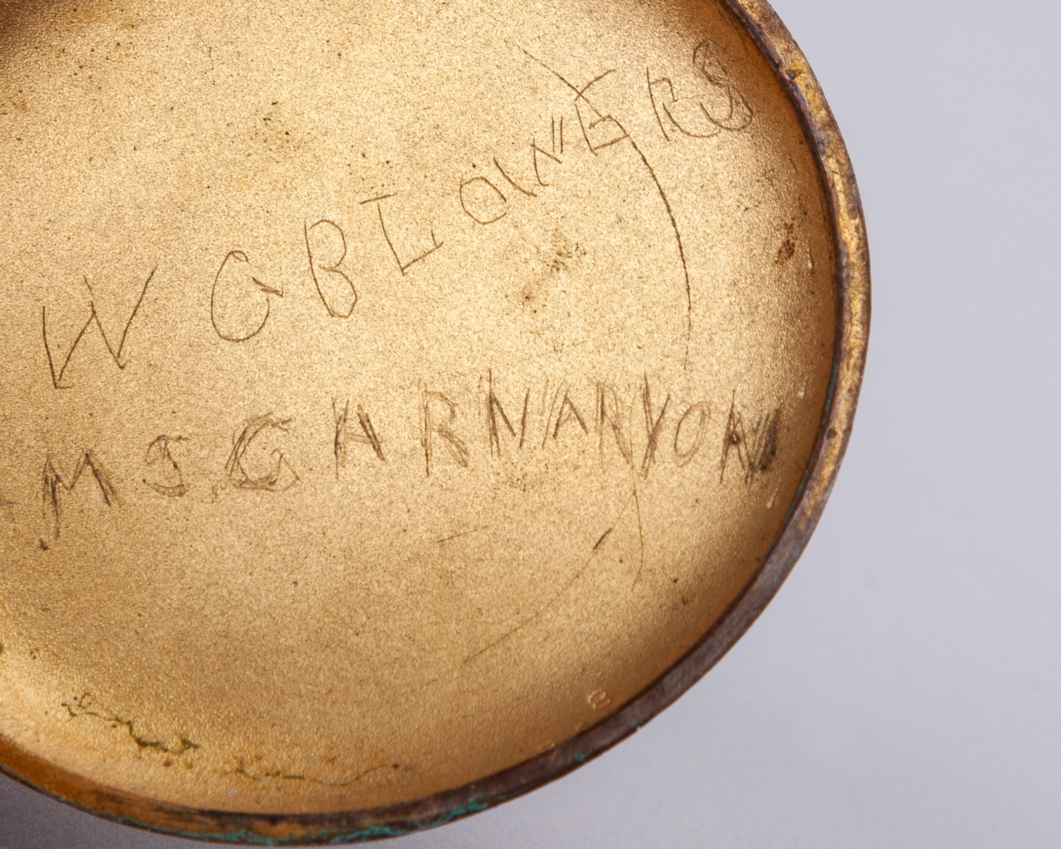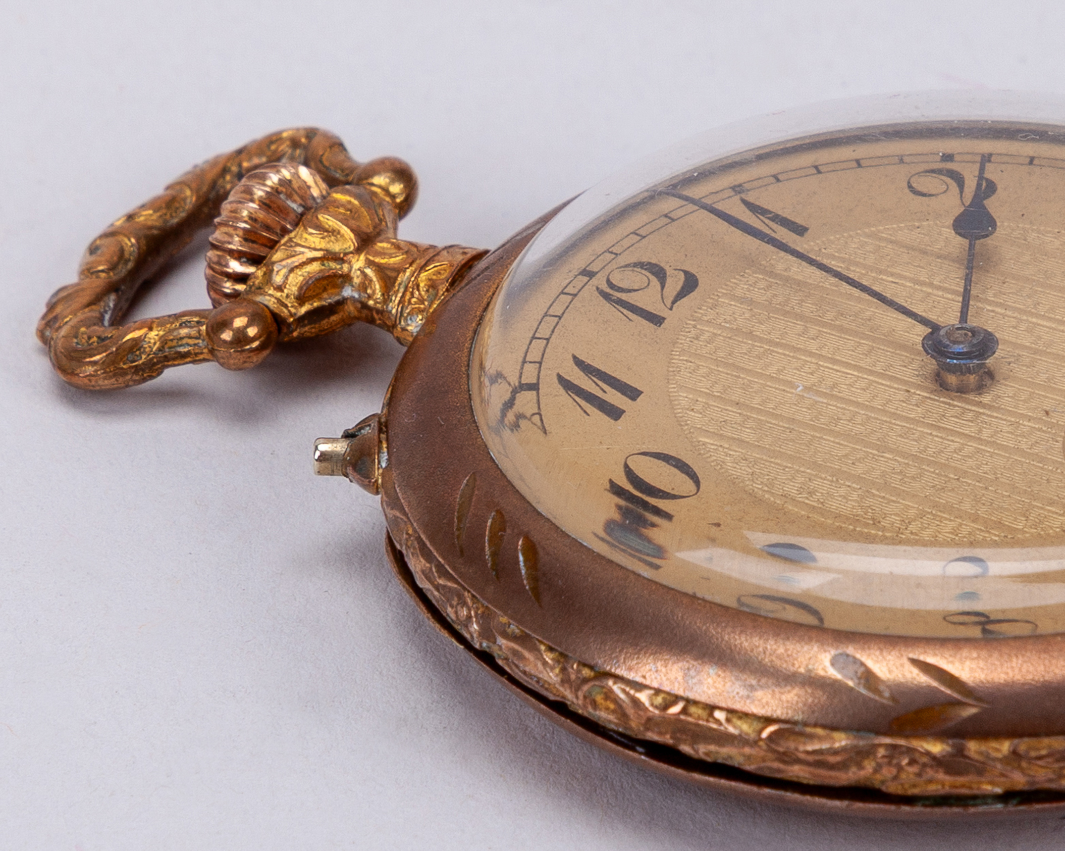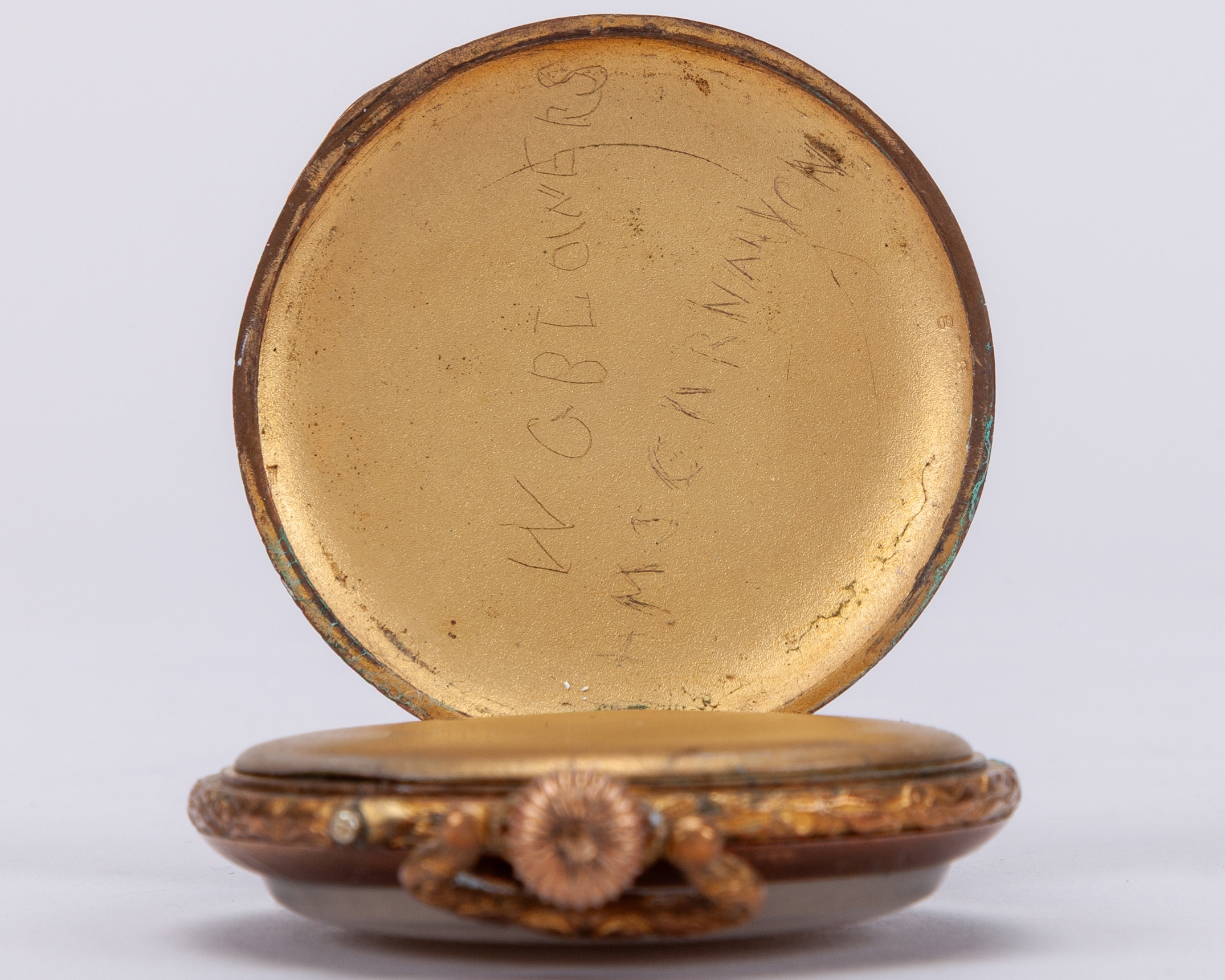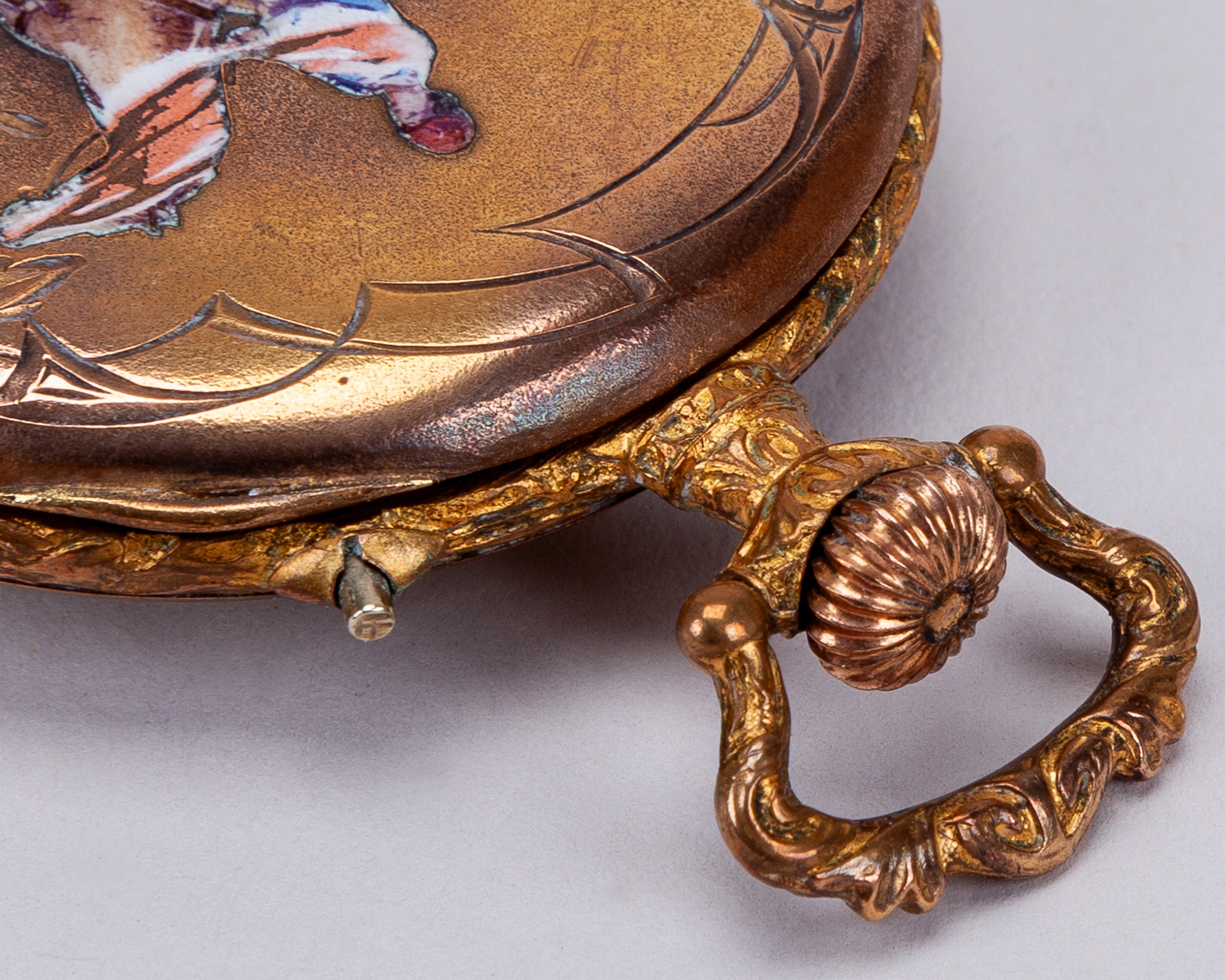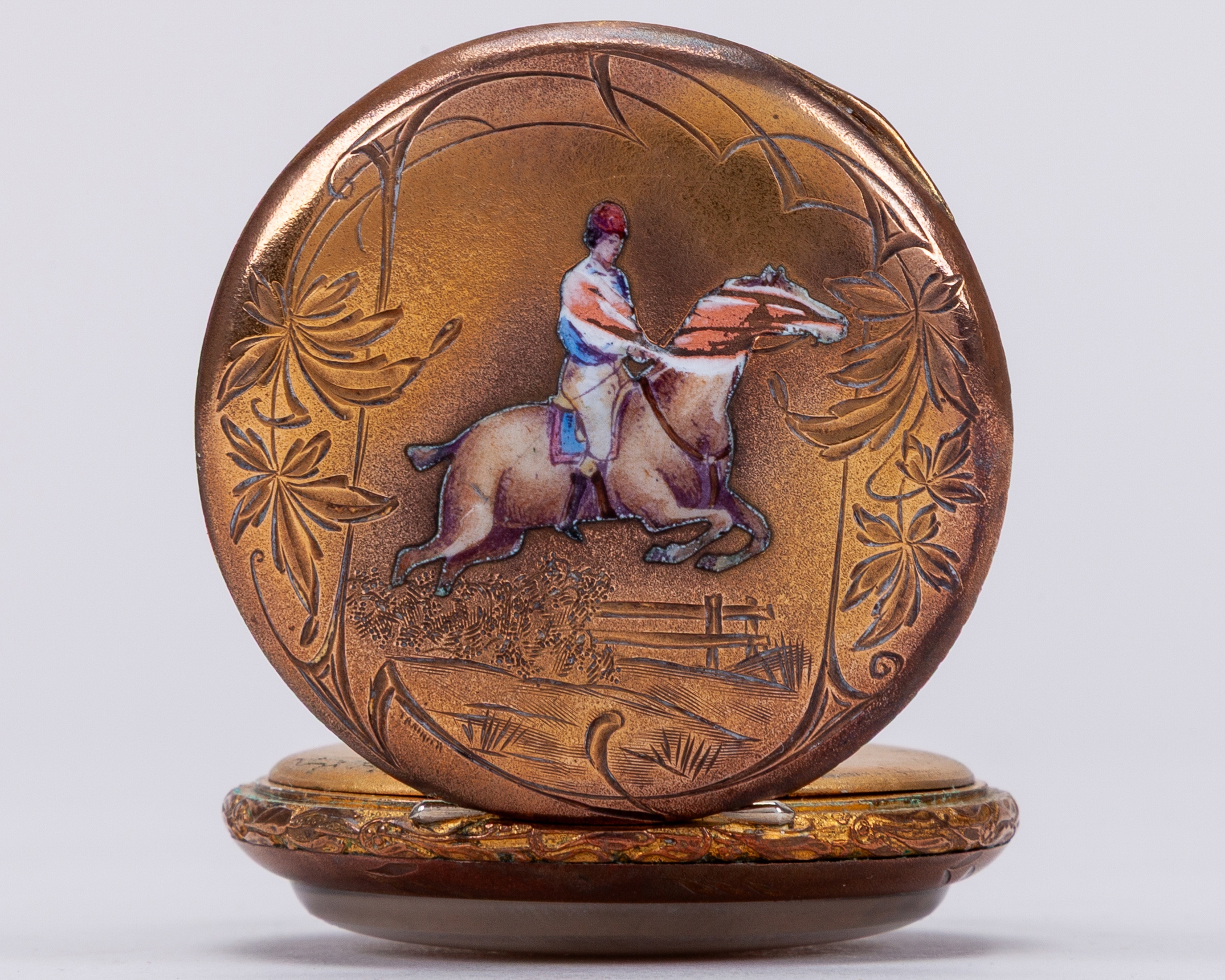 Gilt-metal pocket watch with an enamelled scene of a steeplechaser & jockey circa 1900