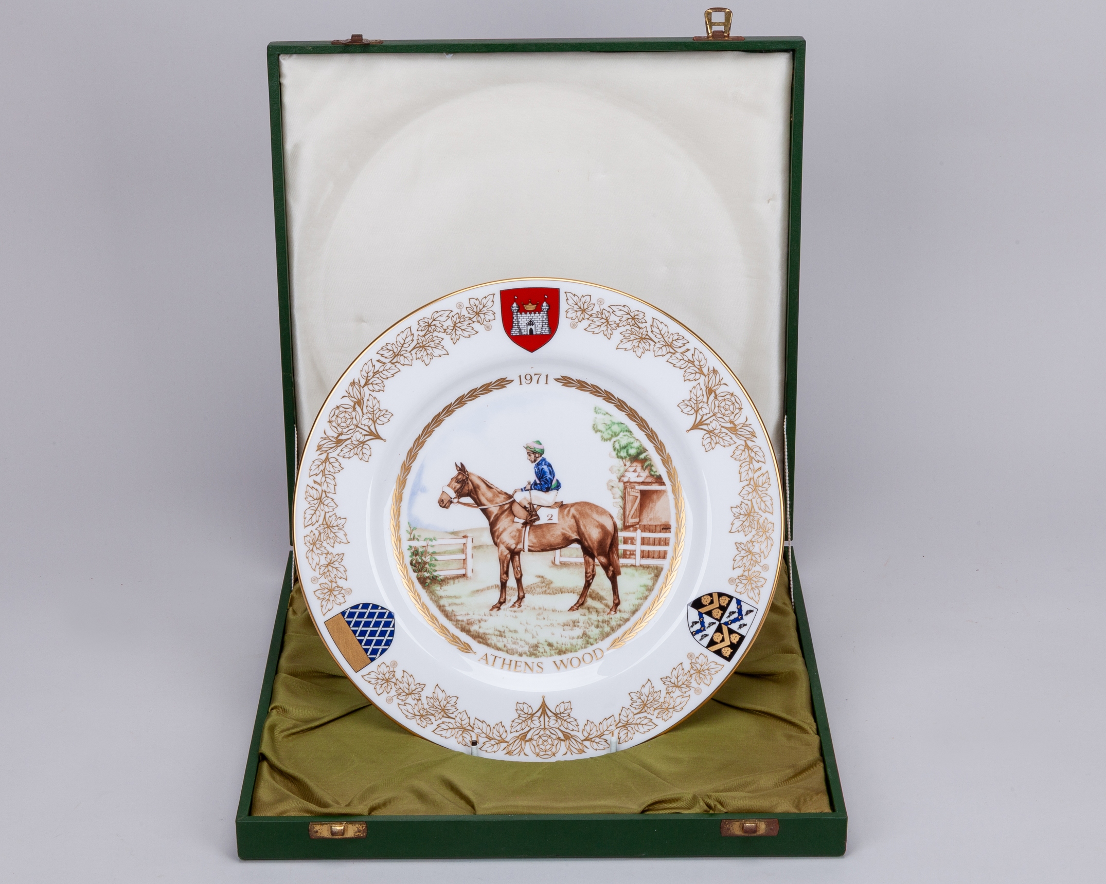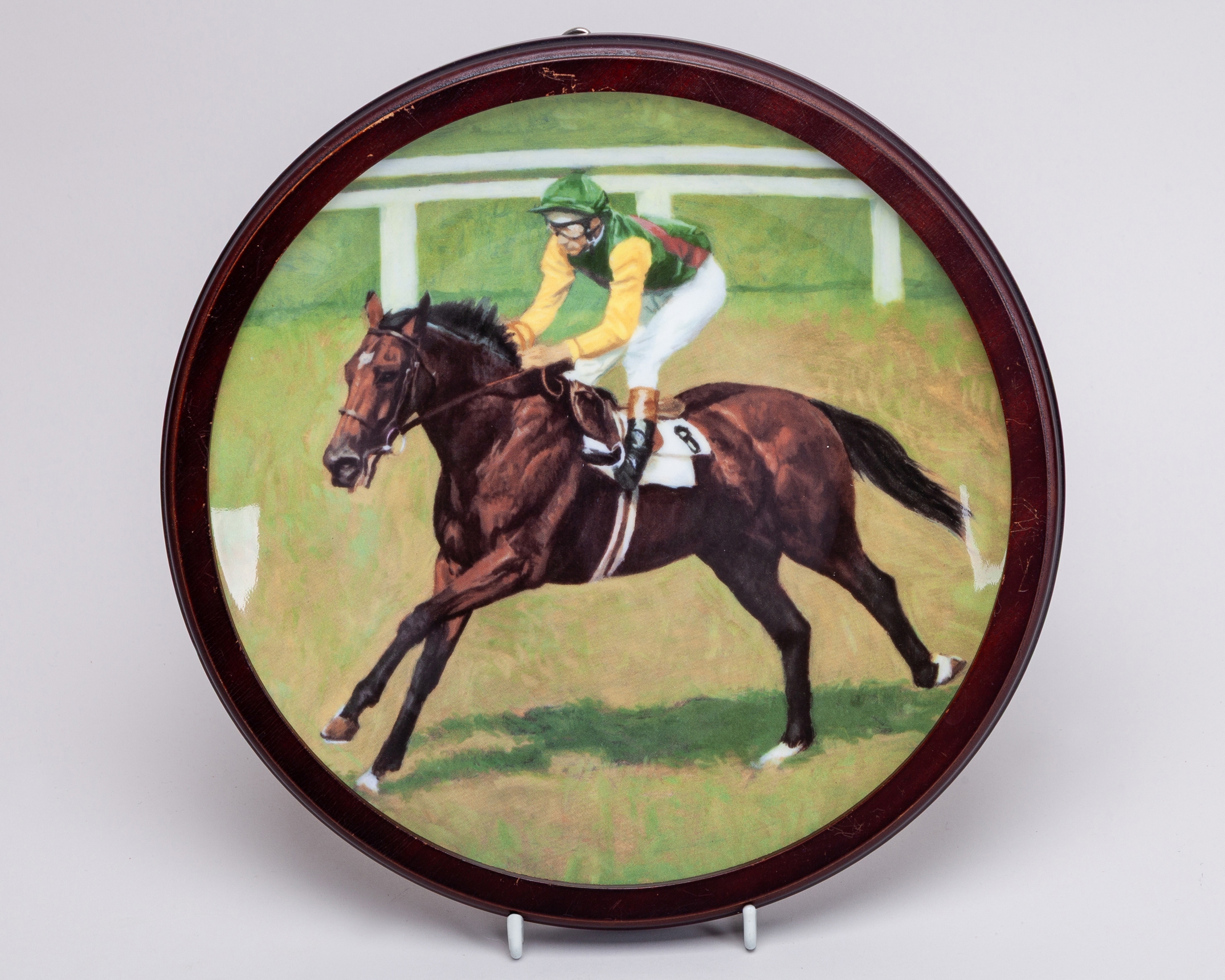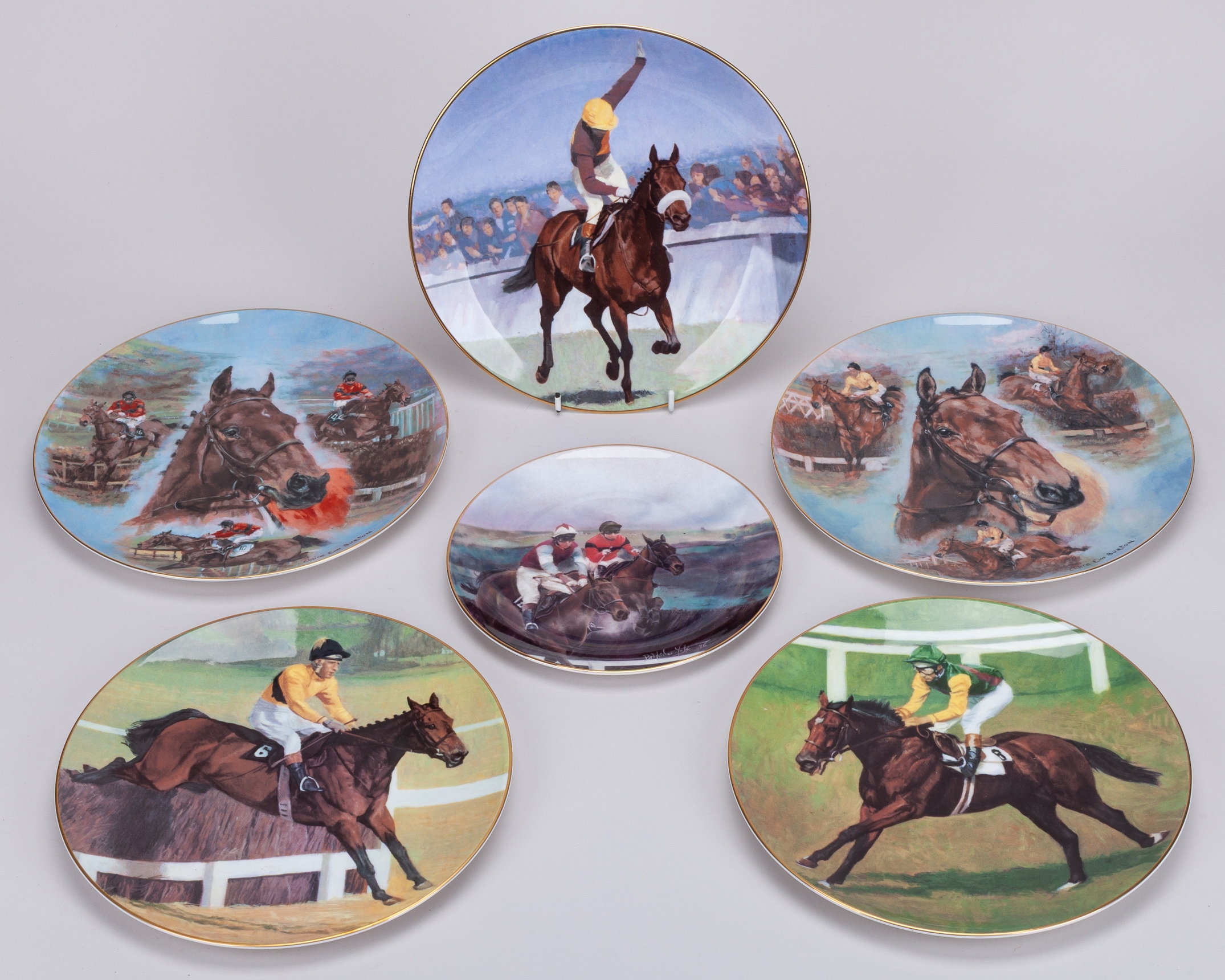 mostly approx. 25cm. diameter, comprising: a boxed Spode limited edition commemorating the 1971 St Leger; Royal Doulton limited edition of Nijinsky with Lester Piggott up, in circular wooden frame for wall hanging; another of the Nijinksy plates and further Royal Doulton issues for Red Rum and Arkle; two examples of a Coalport limited edition of Dawn Run; an American gold signature edition plate of Bill Shoemaker aboard John Henry, damaged; and a smaller plate by Royal Doulton of Dawn Run