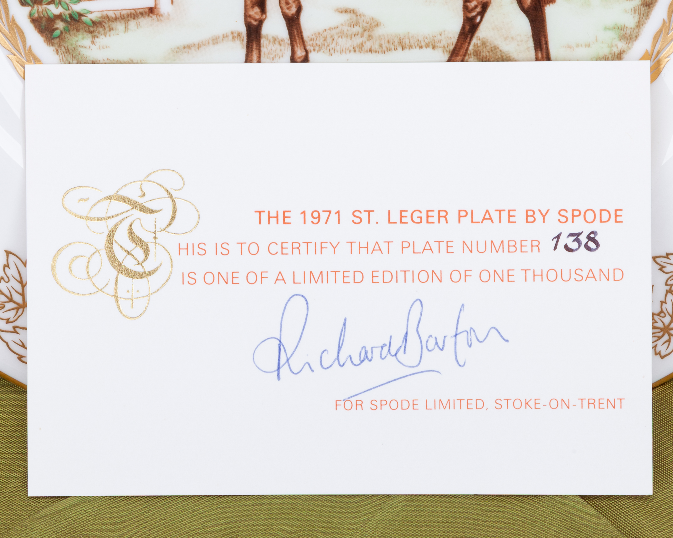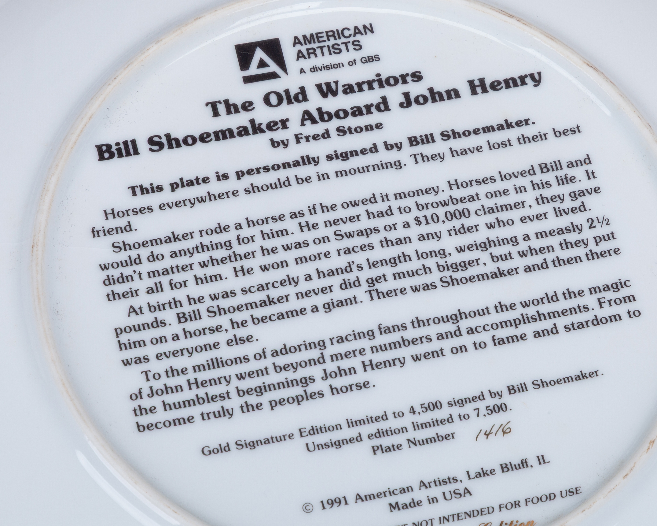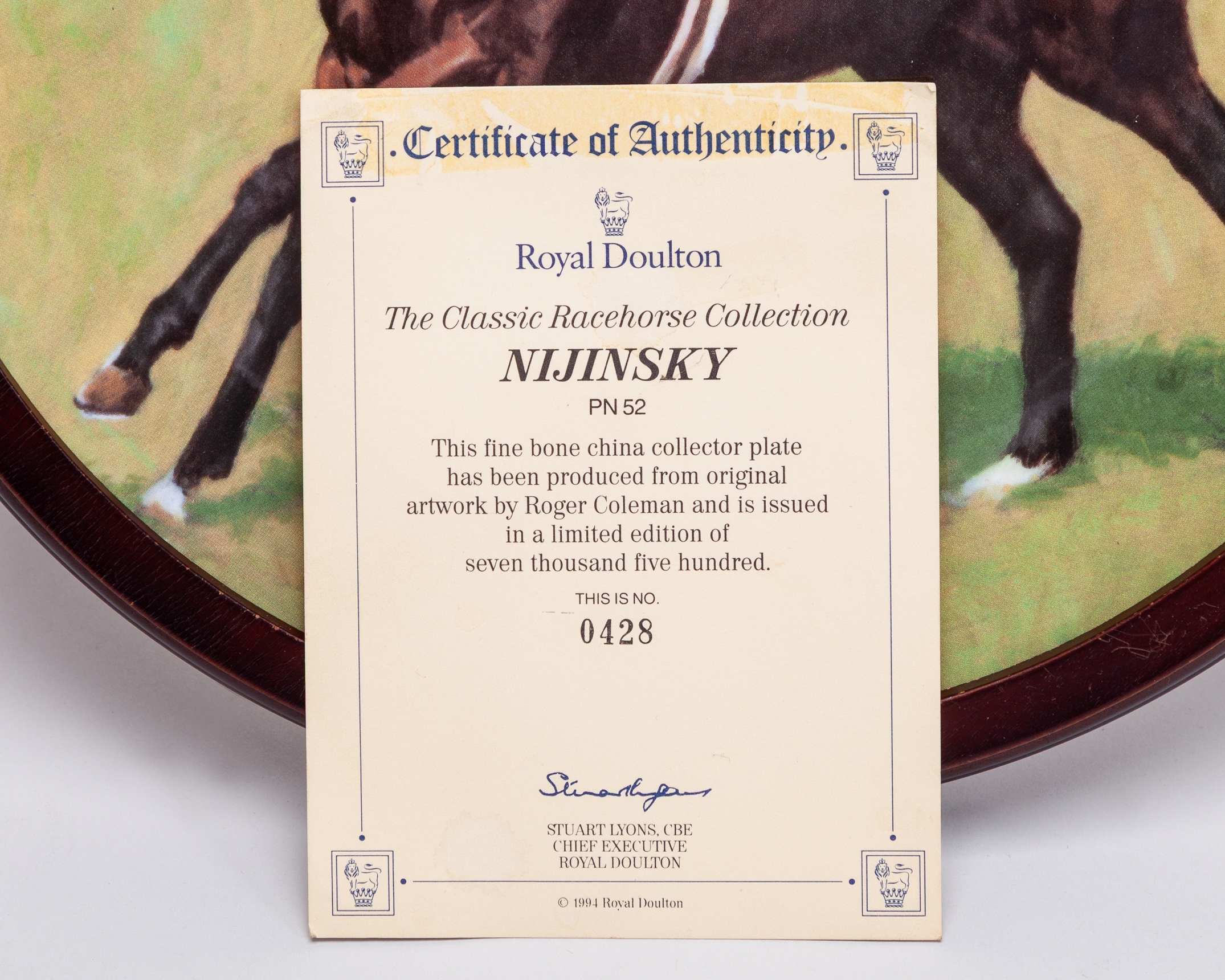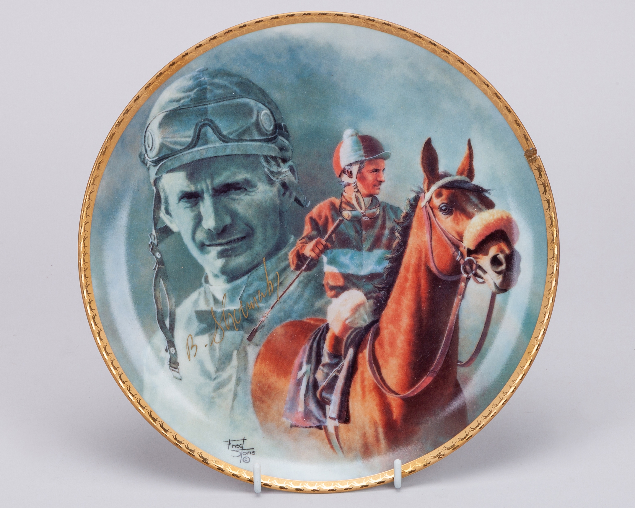 mostly approx. 25cm. diameter, comprising: a boxed Spode limited edition commemorating the 1971 St Leger; Royal Doulton limited edition of Nijinsky with Lester Piggott up, in circular wooden frame for wall hanging; another of the Nijinksy plates and further Royal Doulton issues for Red Rum and Arkle; two examples of a Coalport limited edition of Dawn Run; an American gold signature edition plate of Bill Shoemaker aboard John Henry, damaged; and a smaller plate by Royal Doulton of Dawn Run