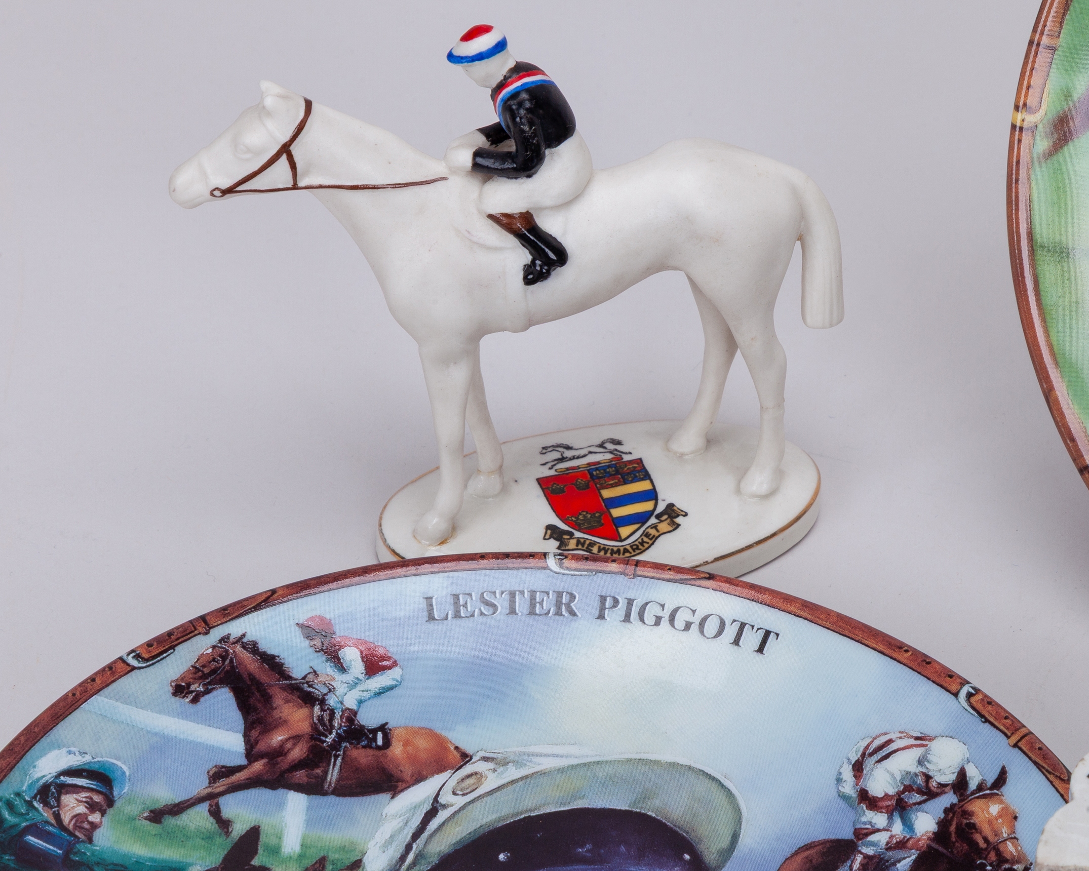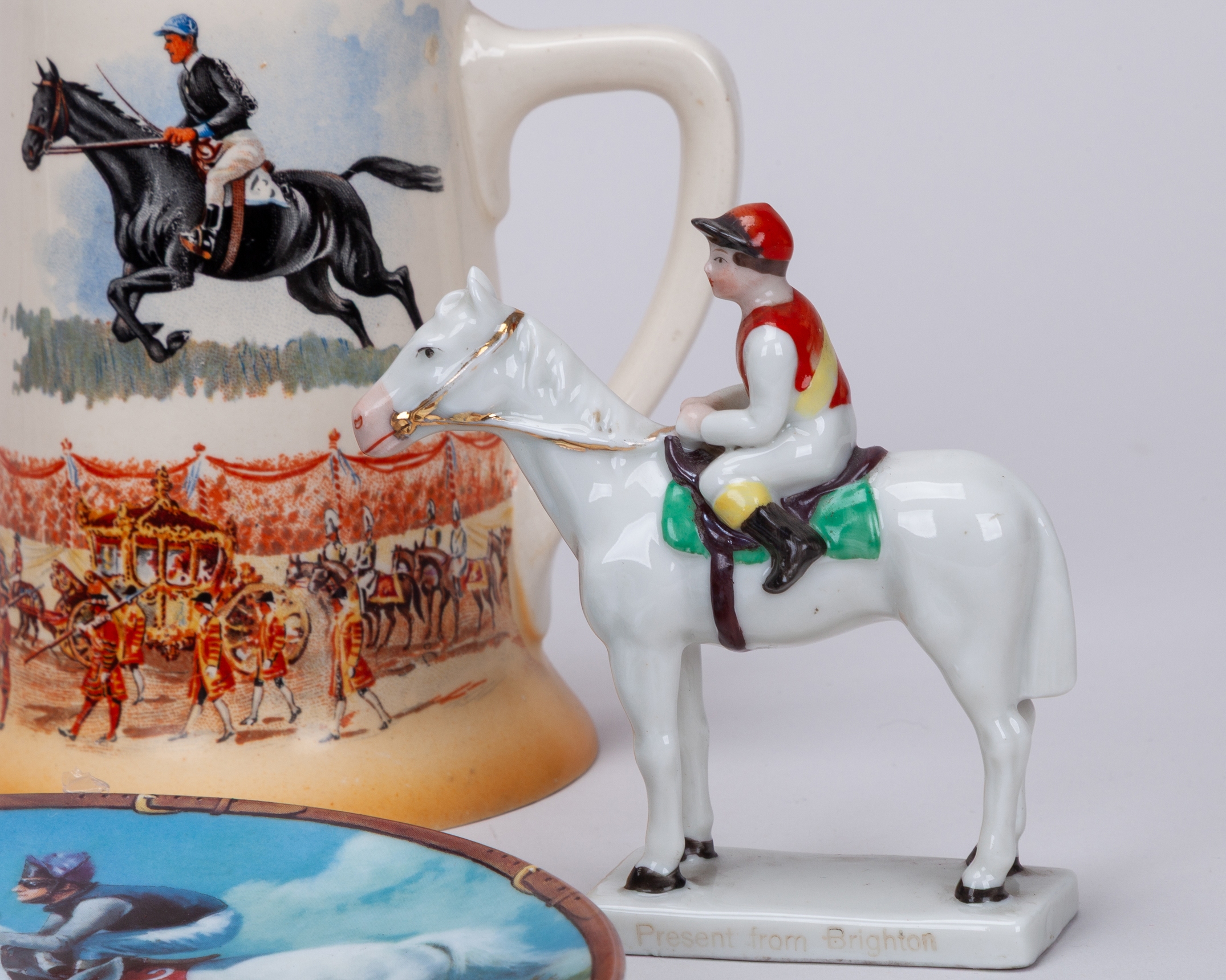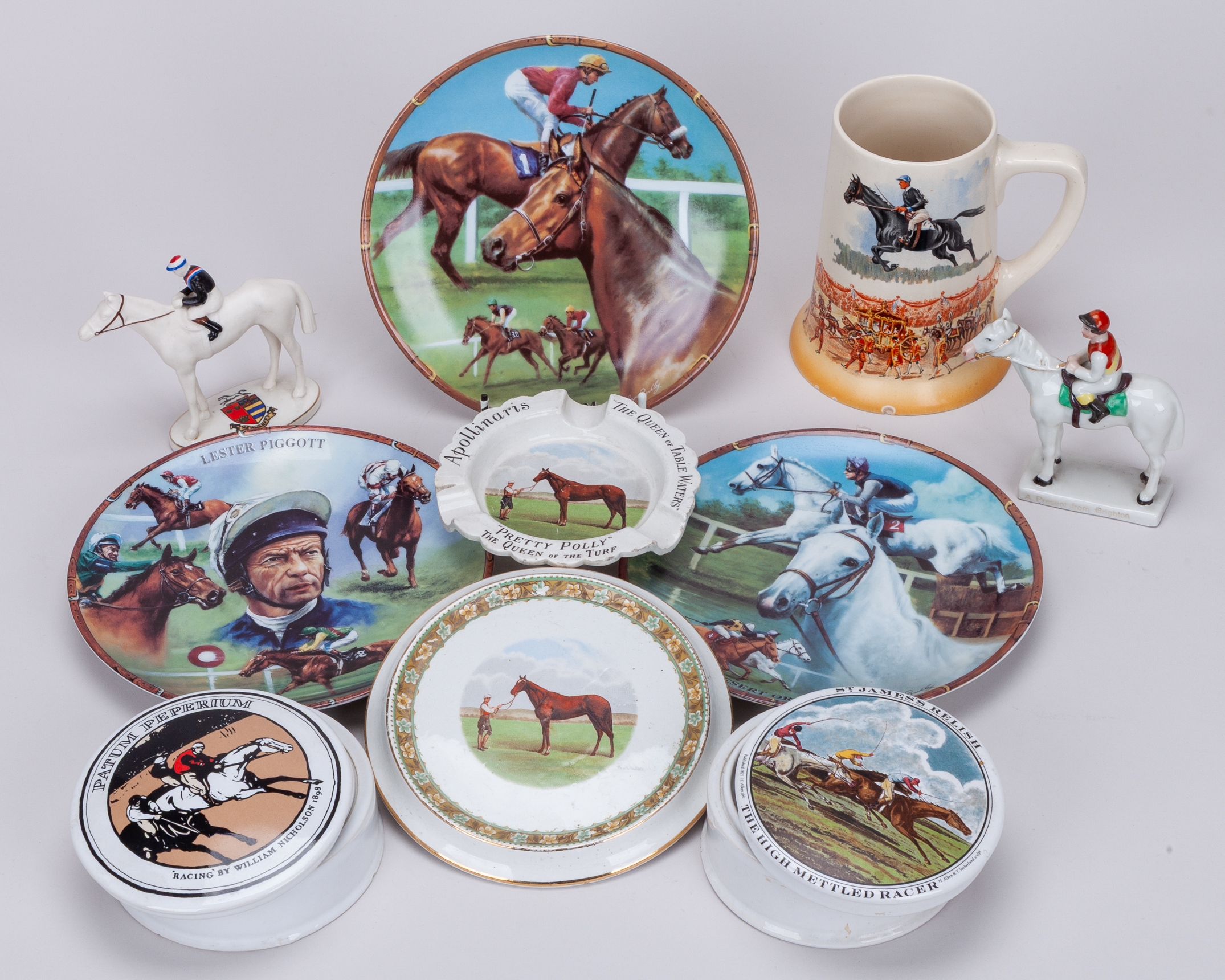 a Royal Doulton Royal Mail 1937 Grand National Tankard; a crested china Newmarket souvenir racehorse & jockey and another similar, continental; Apollinaris table water ashtray depicting Pretty Polly “Queen of the Turf”; hot vessel stand portraying a racehorse; two pots & covers, Patum Peperum and St James's Relish; and three Royal Worcester horse racing plates, Lester Piggott, Desert Orchid & Red Rum