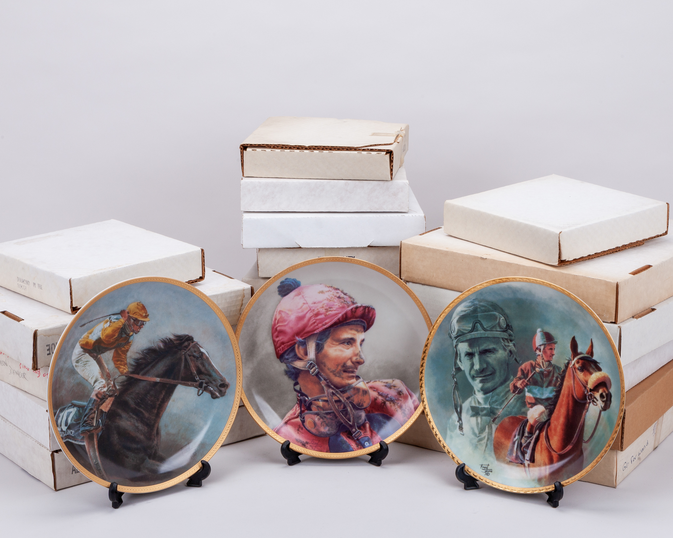 A collection of 31 American boxed horse racing china plates with Fred Stone artworks