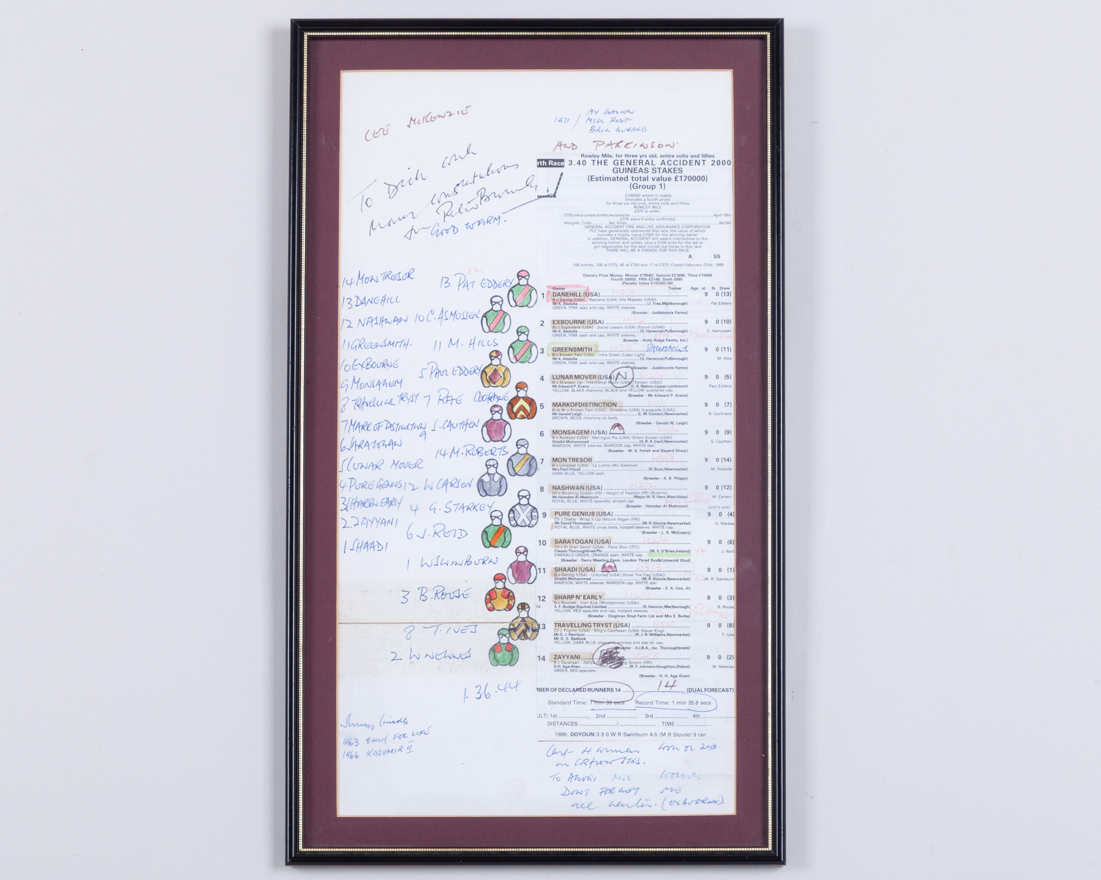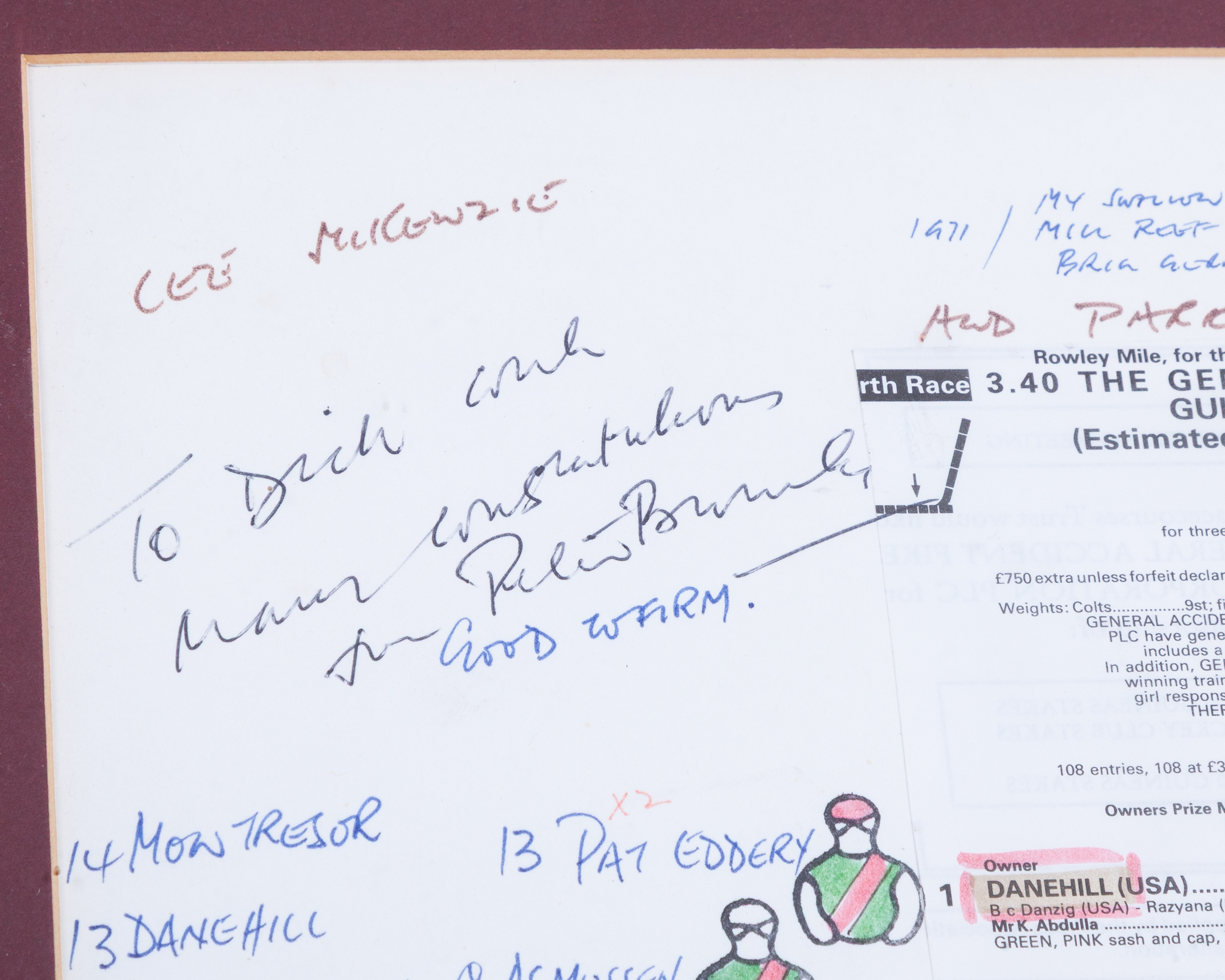 Peter Bromley BBC Radio Commentary racecard for the 1989 2000 Guineas won by Nashwan later presented to the trainer Dick Hern,