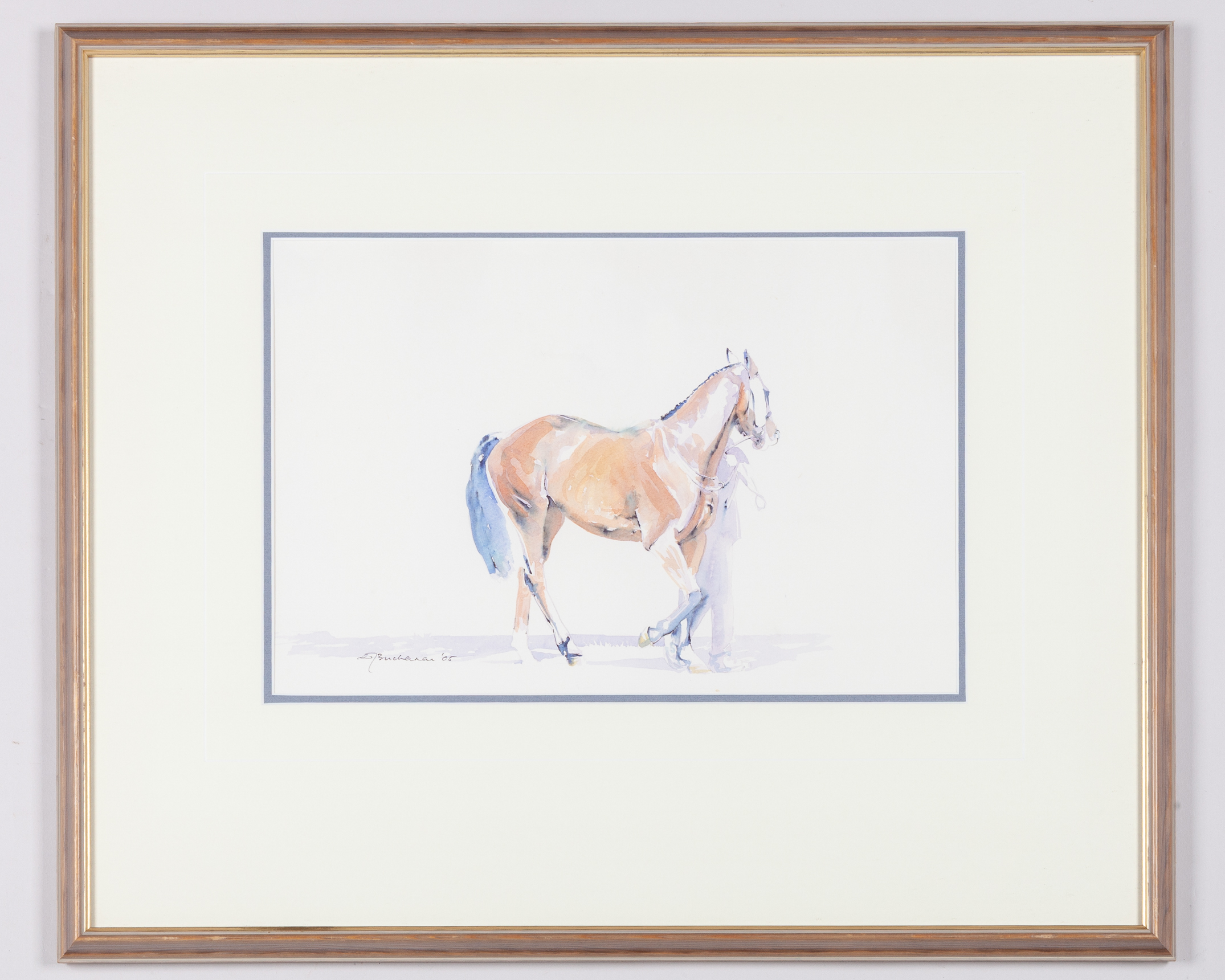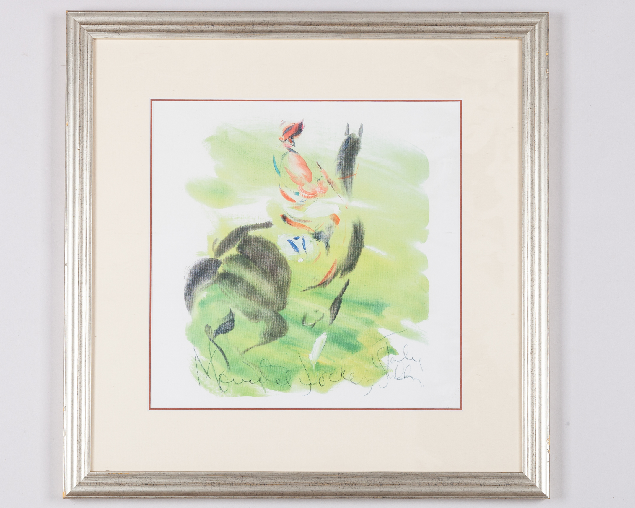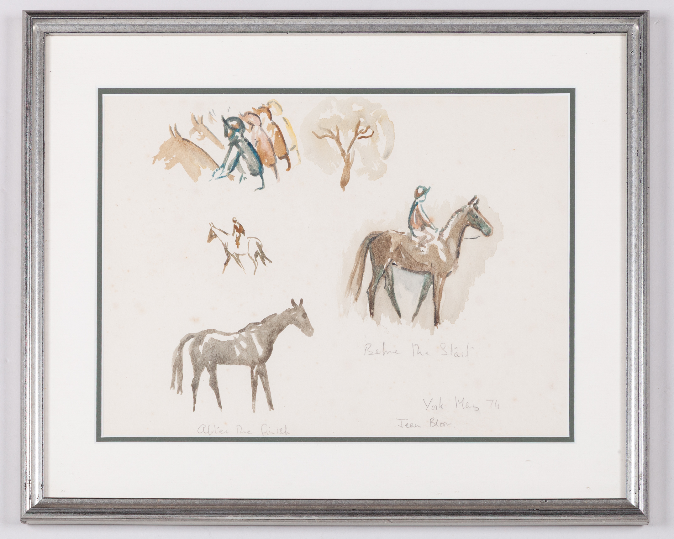 a signed Jean Bloor watercolour sketch, scenes at York in May 1974; a Ruth Buchanan watercolour of a racehorse being led to the saddling box; and a colourful print of a racehorse & jockey, bearing a signature in the plate, various sizes, the largest 53 by 65cm.