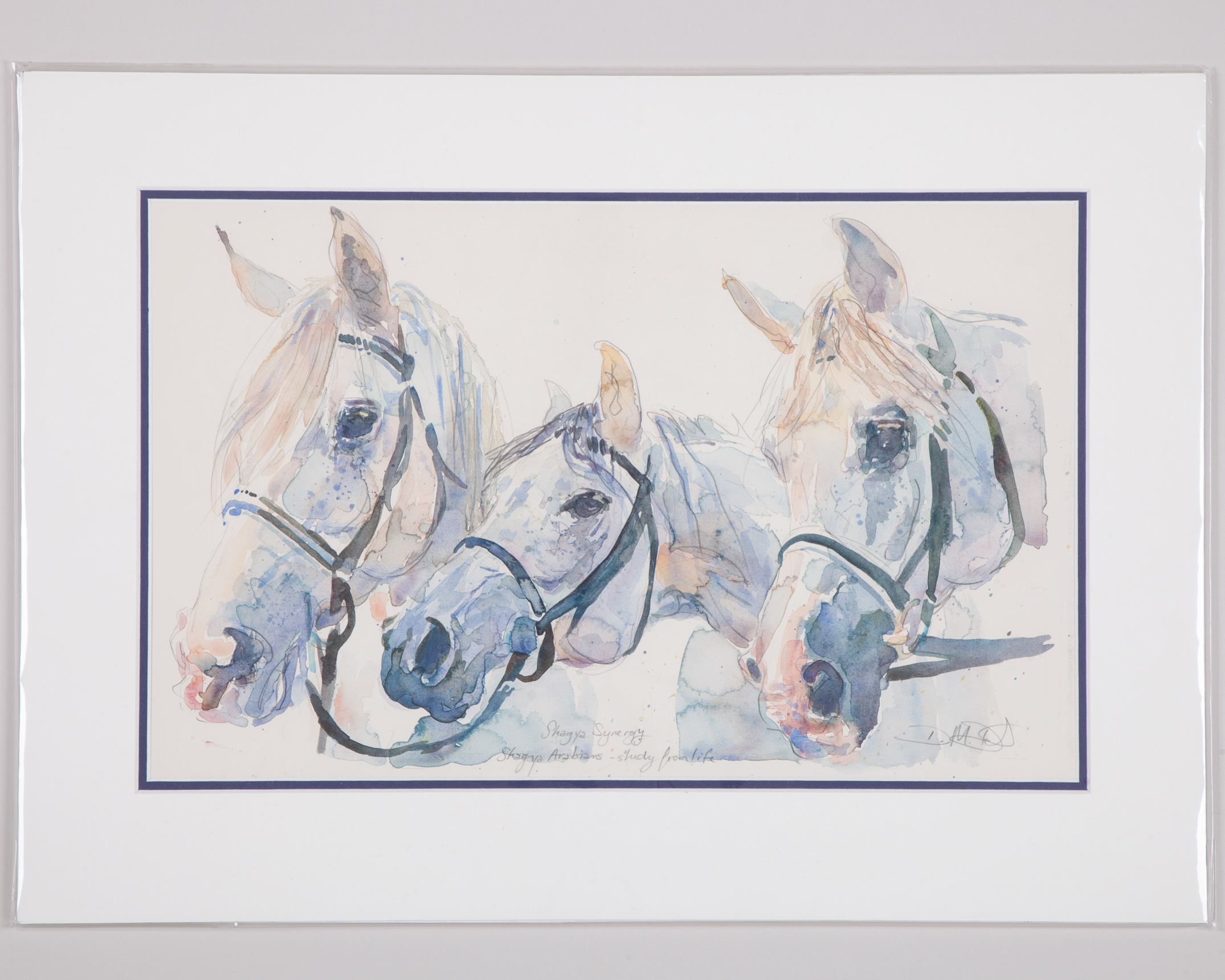 signed by the artist, watercolour over pencil, titled; Shagya Synergy, Shagya Arabians - study from life, mounted, 53 by 38cm., overall