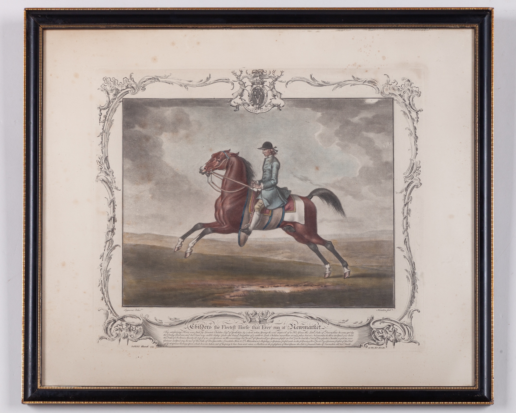 engraved by Richard Houston (1721-1775), bearing the Duke of Devonshire's Coat of Arms and extensive printed legend regarding ‘The fleetest Horse that Ever run at Newmarket’, published March 1755, under glass in modern frame, 42 by 49.5cm.