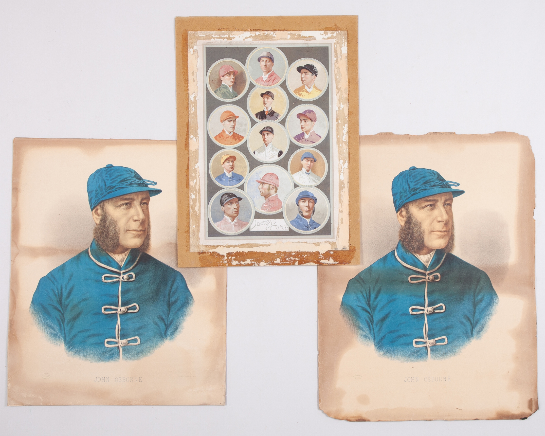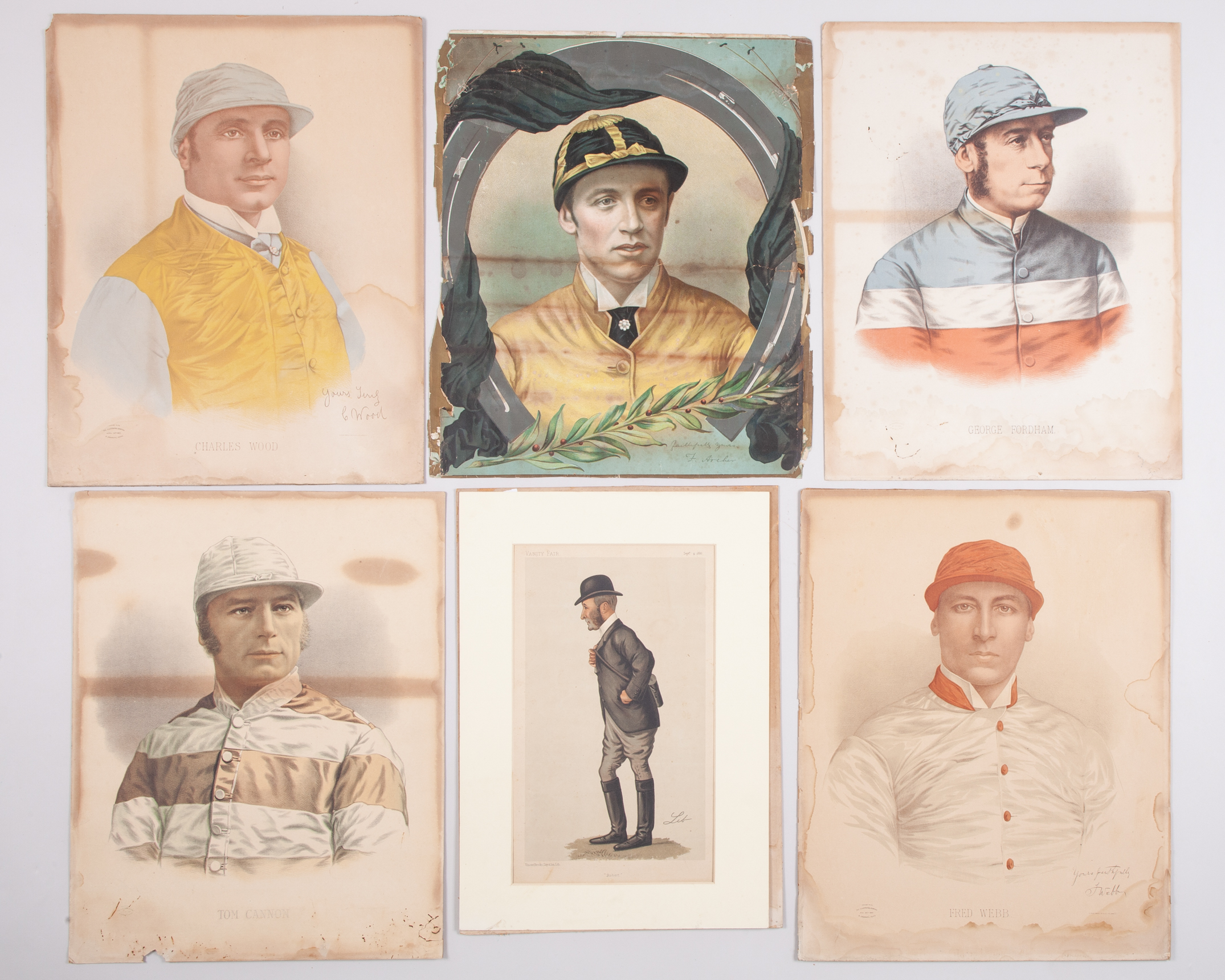 i) Jockeys of the Day, London Illustrated News supplement print published 23rd May 1891; ii) Vanity Fair print by ‘Lib’ titled “Robert” [Robert Peck]; iii) print commemorating the dead-heat for The Derby in 1884; iv) to xi), and 7 jockey portraits published by the Illustrated Sporting & Dramatic News, comprising George Fordham, Fred Archer, John Osborne (two), Fred Webb, Tom Cannon & Chales Wood, mixed condition