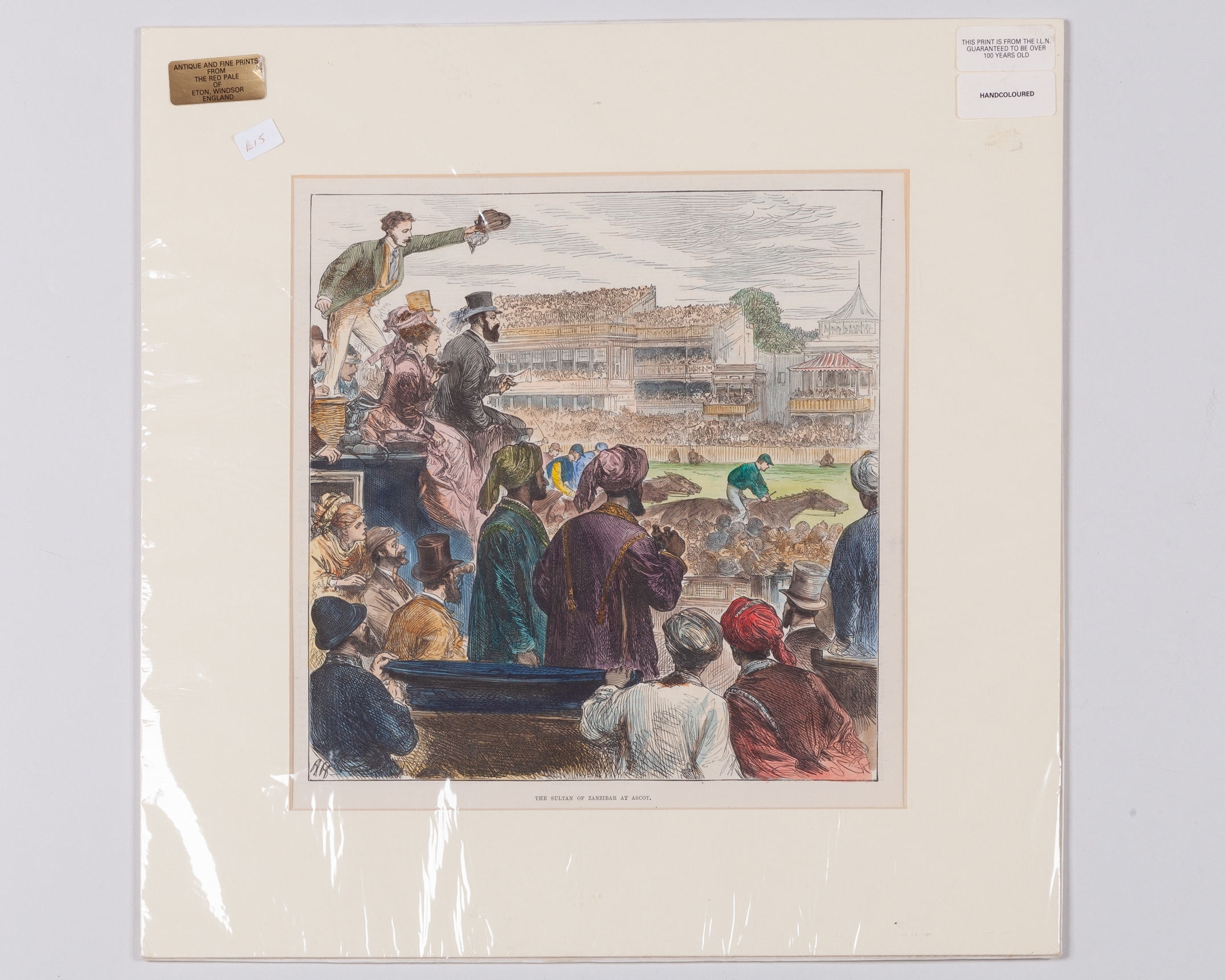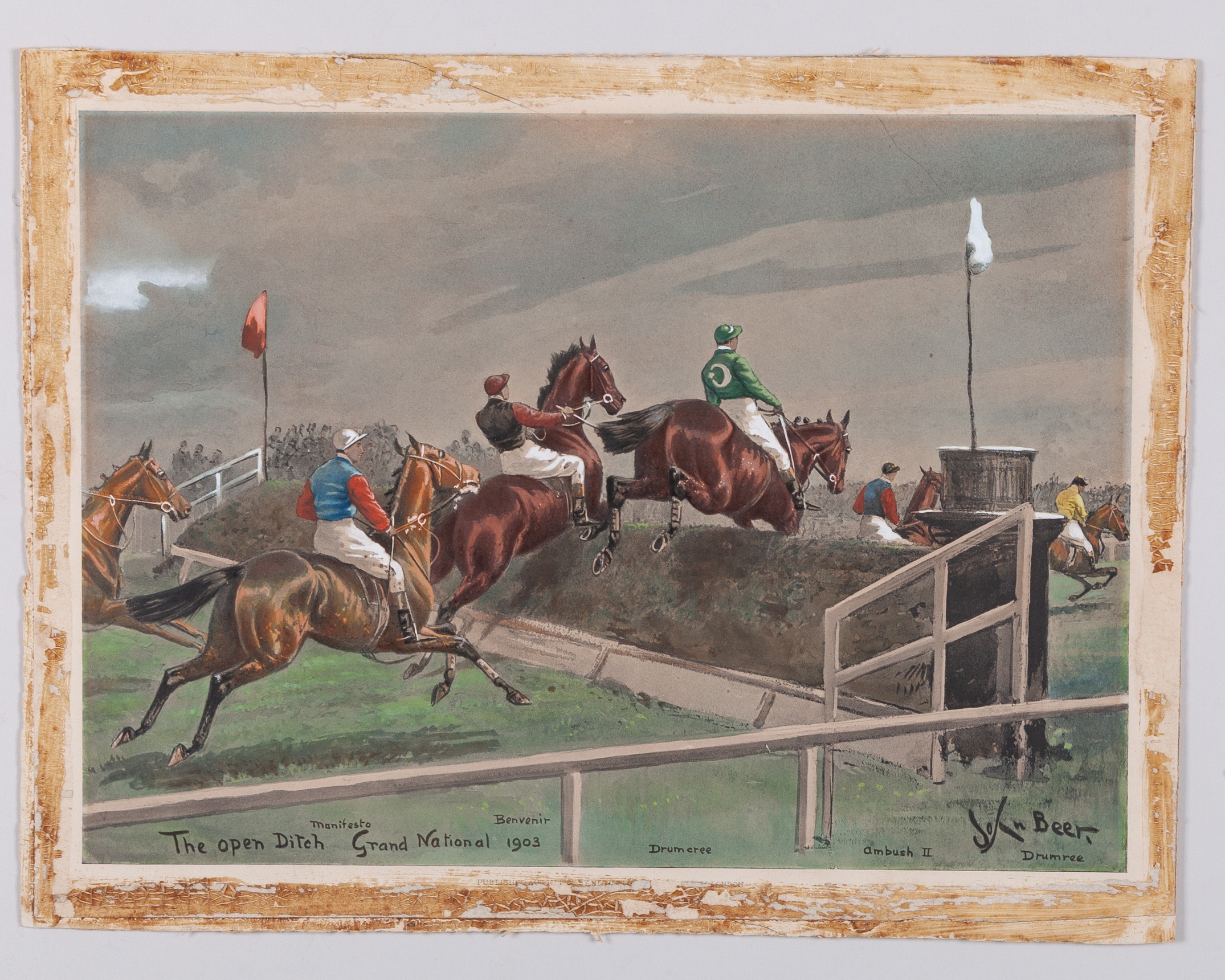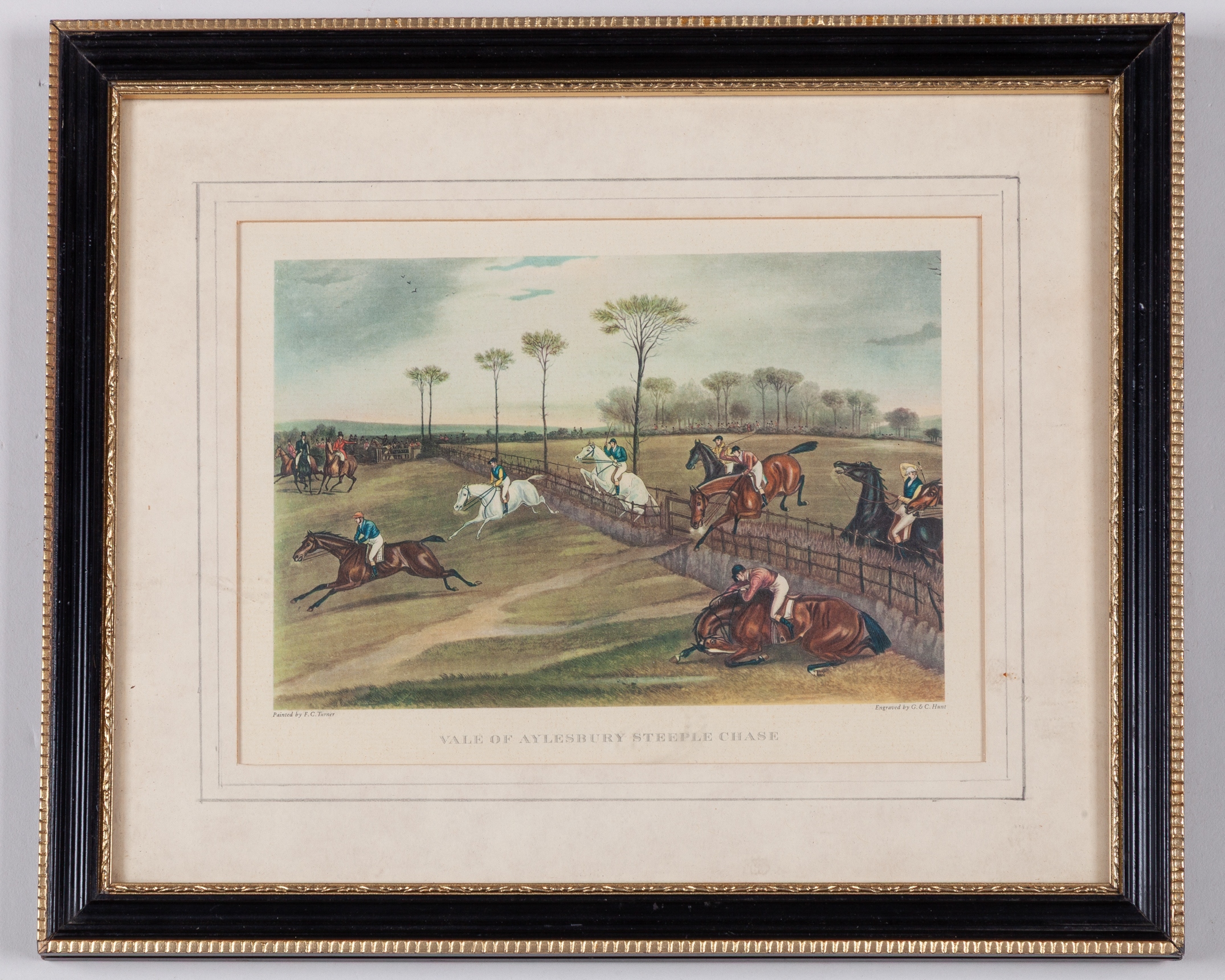 framed unless otherwise stated, comprising: i) Cecil Aldin Bluemarket Races, one only from a larger set; ii) Charles Ancelin French steeplechasing print, one only from a larger set; iii & iv) two John Beer 1903 Grand National prints, from a larger set (one unframed); v) Oleograph, signed J Dalby, of two racehorses; vi) repro of a Gilbey's Whisky advertisement print; vii) Francis Calcraft Turner print of the Vale of Aylesbury Steeplechase, one only from a larger set; viii) modern print, signed Hamilton; ix) coloured print portraying The Sultan of Zanzibar at Royal Ascot, mounted ready for framing