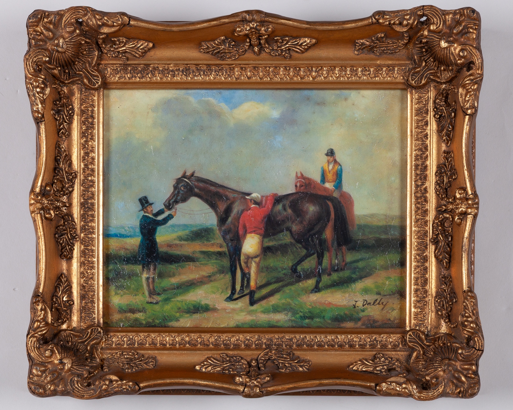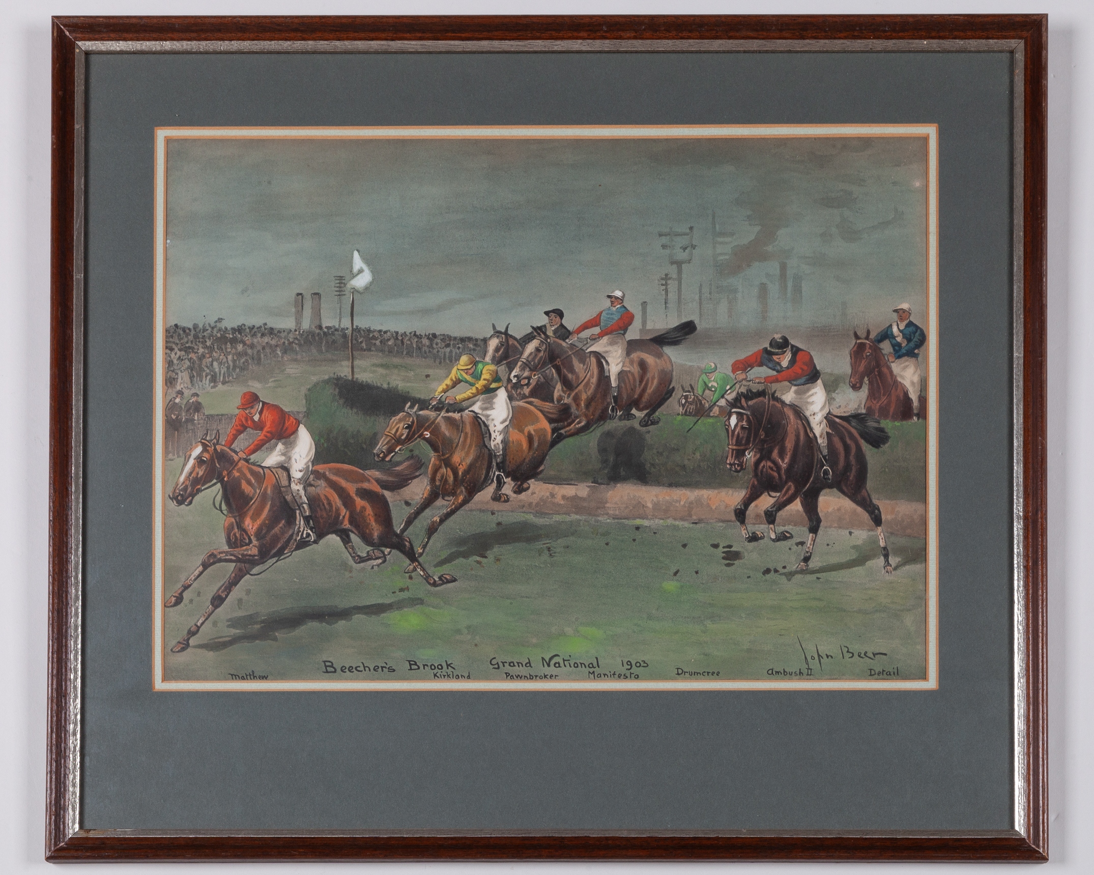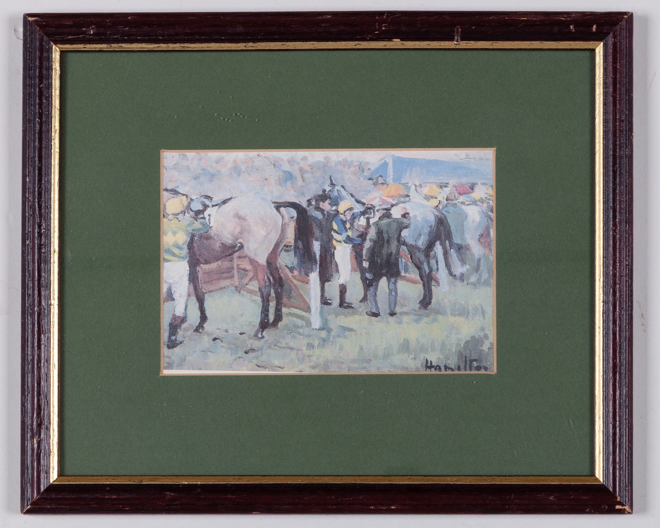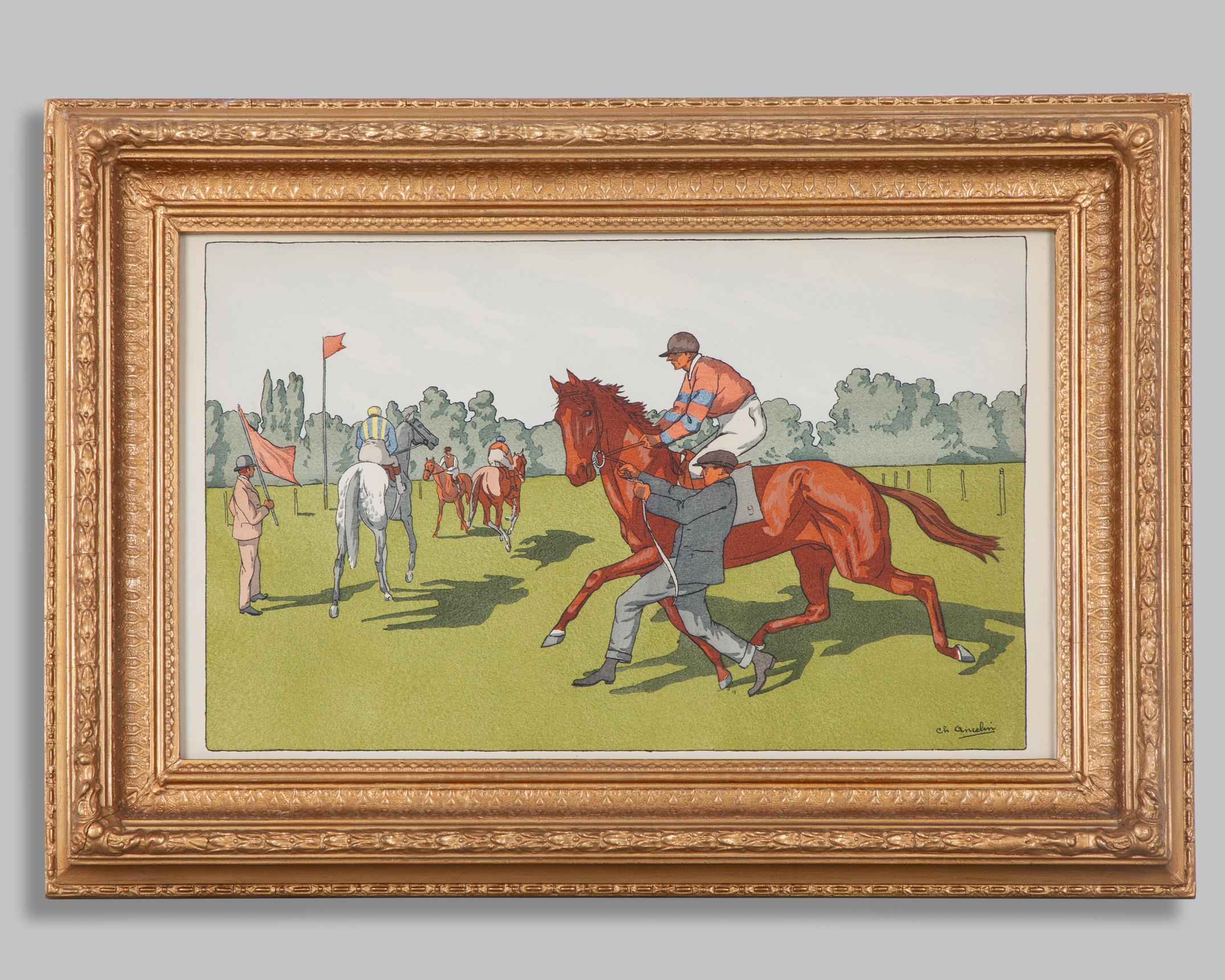 framed unless otherwise stated, comprising: i) Cecil Aldin Bluemarket Races, one only from a larger set; ii) Charles Ancelin French steeplechasing print, one only from a larger set; iii & iv) two John Beer 1903 Grand National prints, from a larger set (one unframed); v) Oleograph, signed J Dalby, of two racehorses; vi) repro of a Gilbey's Whisky advertisement print; vii) Francis Calcraft Turner print of the Vale of Aylesbury Steeplechase, one only from a larger set; viii) modern print, signed Hamilton; ix) coloured print portraying The Sultan of Zanzibar at Royal Ascot, mounted ready for framing