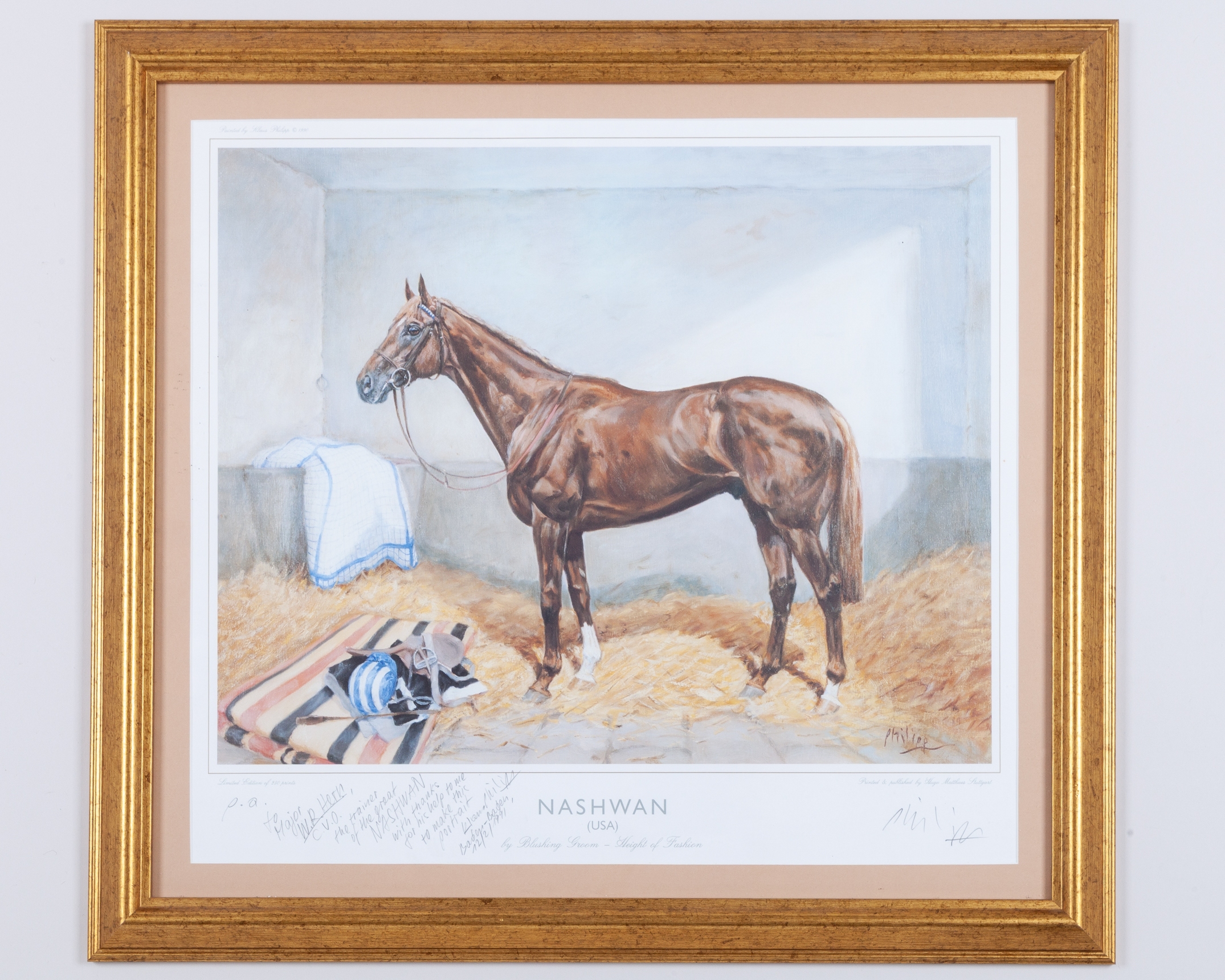 Klaus Philipp (German, 1932-2023) print of the racehorse Nashwan presented to the trainer Major Dick Hern,