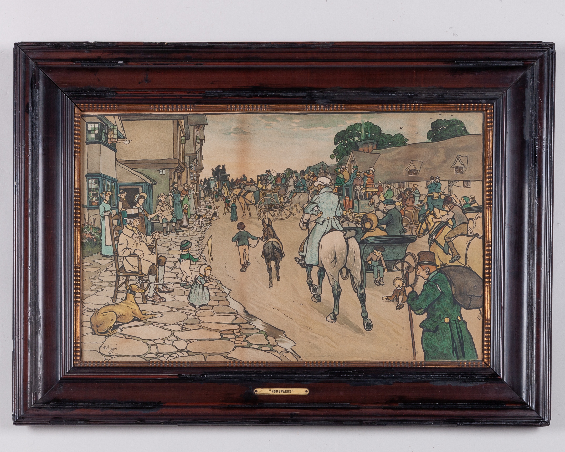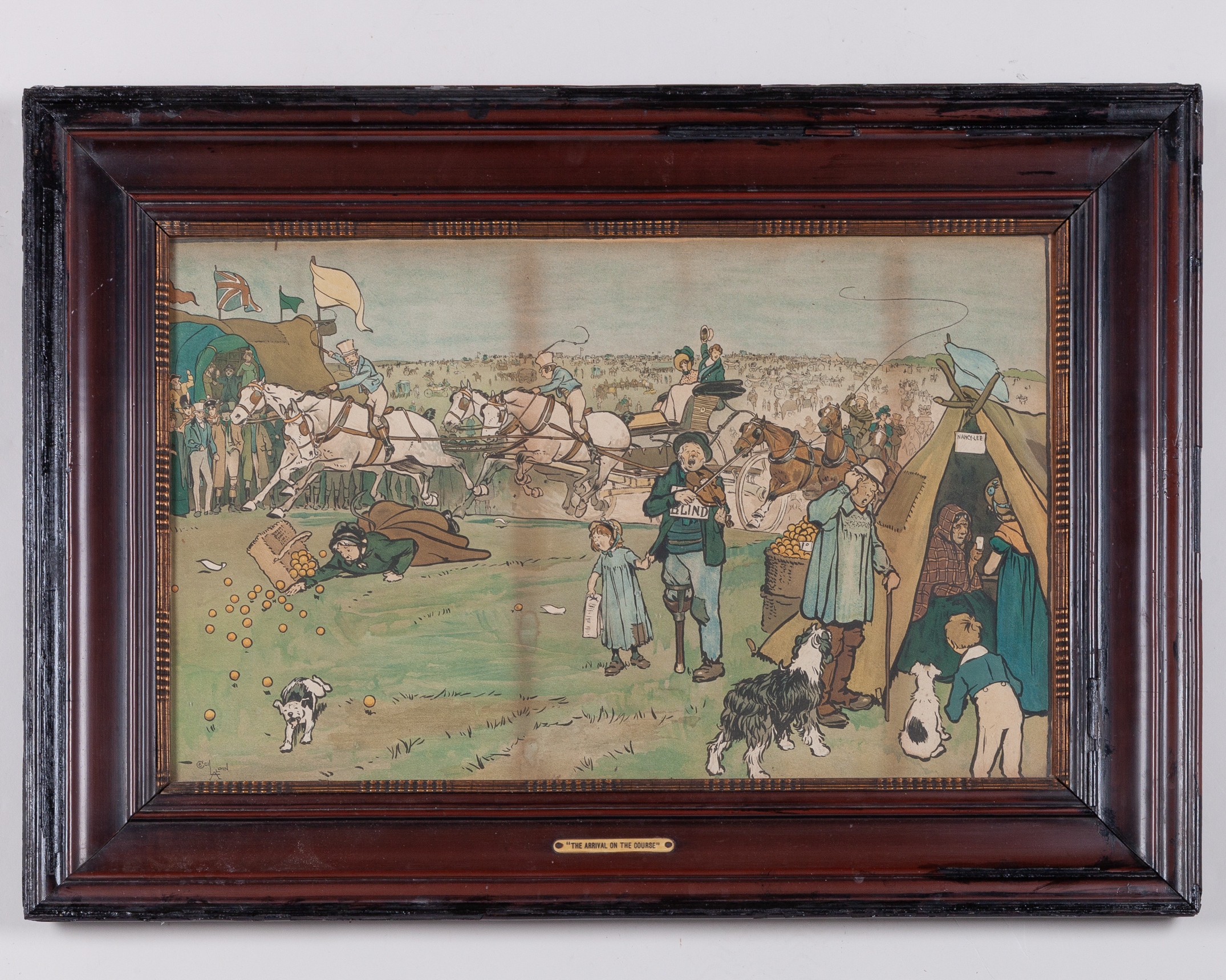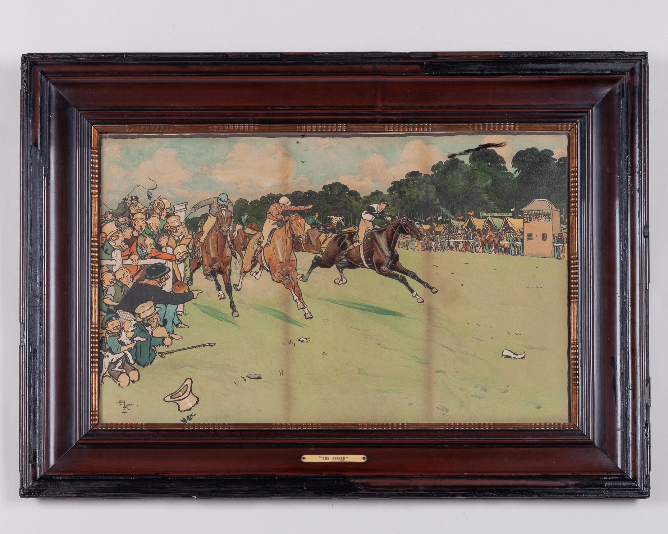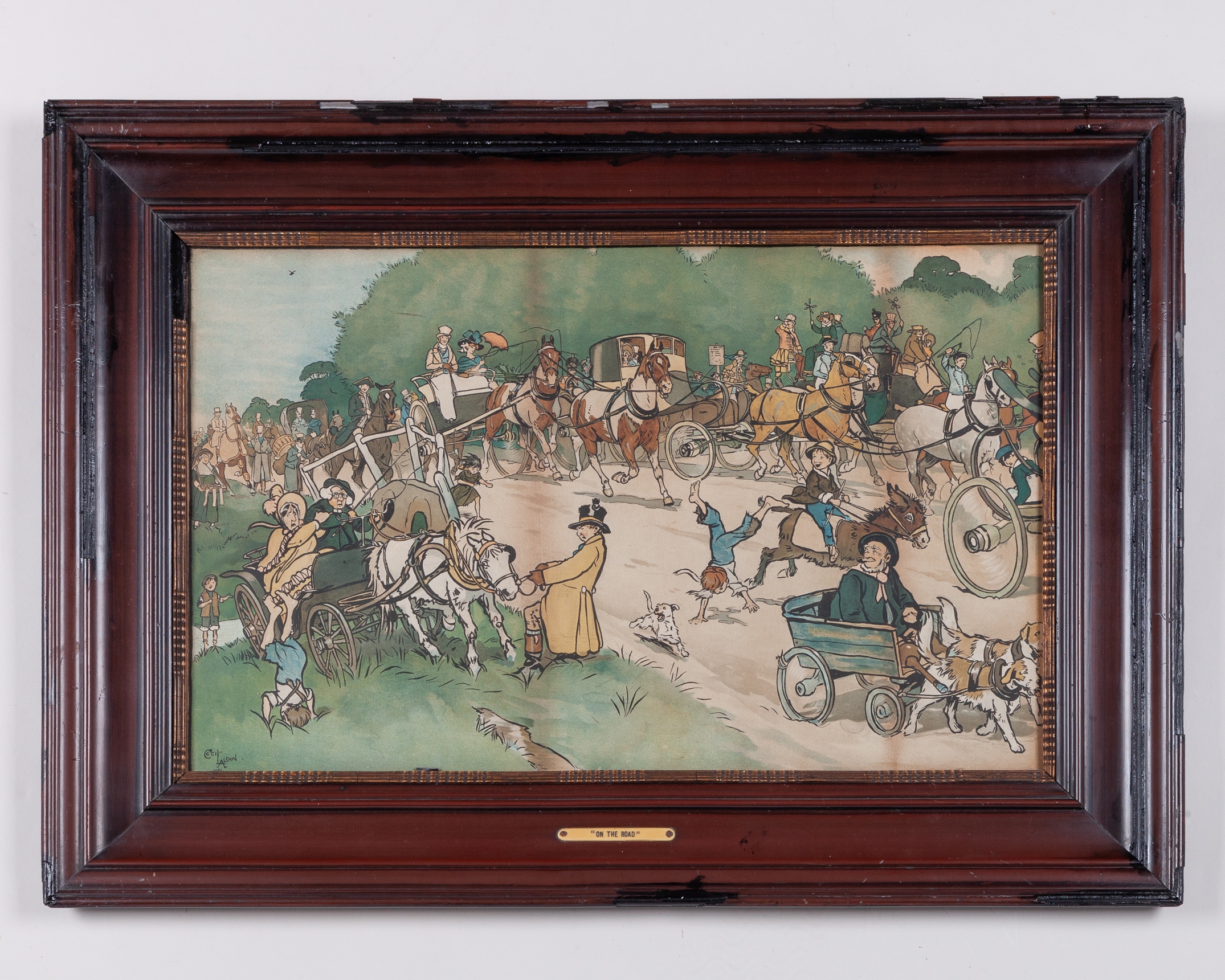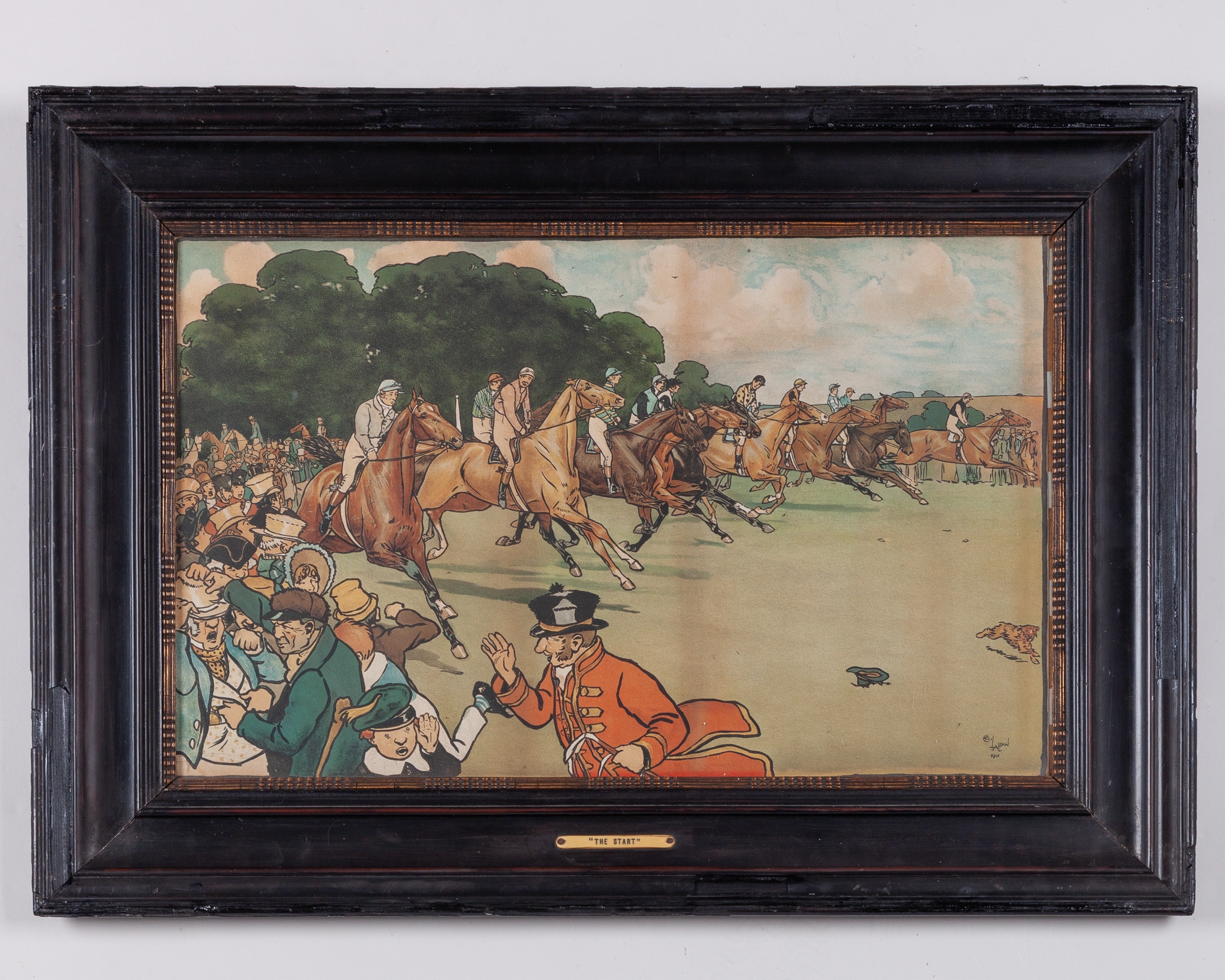 chromolithographs published by Lawrence & Bullen in 1902, each in a period frame set with individual title plaques: ON THE ROAD, THE ARRIVAL ON THE COURSE, THE START, THE FINISH, BETWEEN THE RACE, HOMEWARDS, 56 by 80cm.
