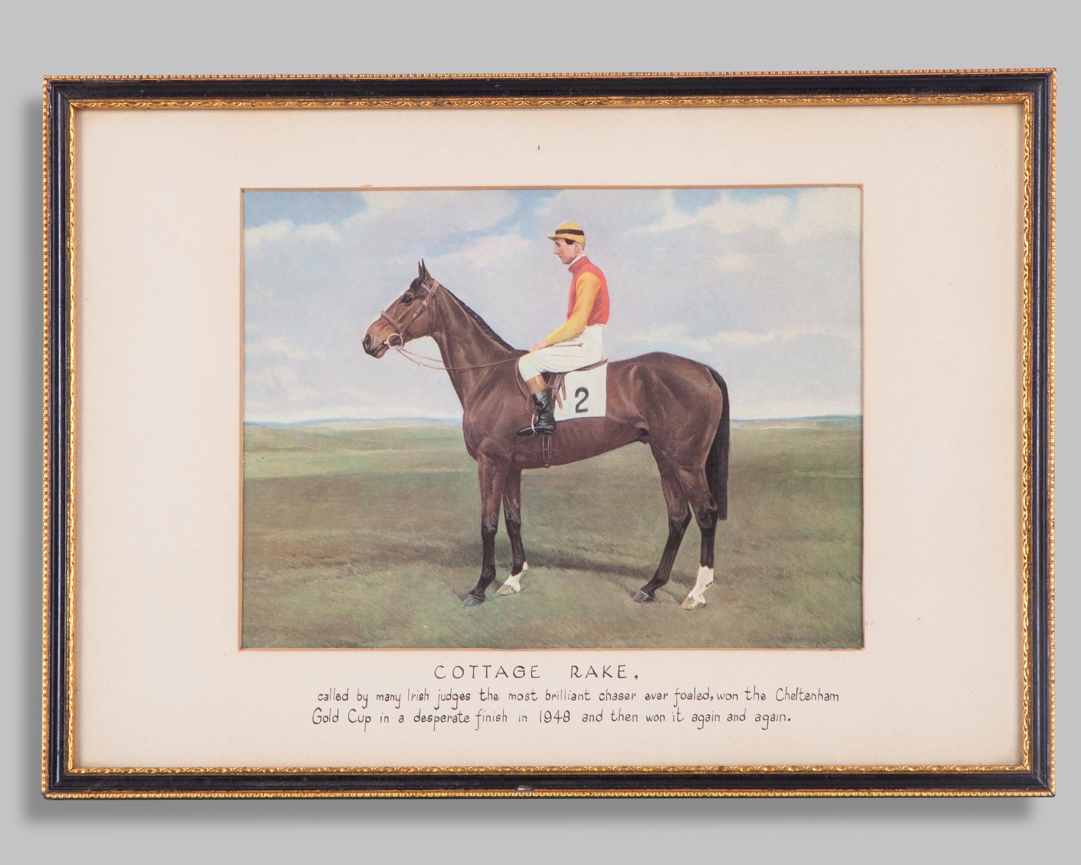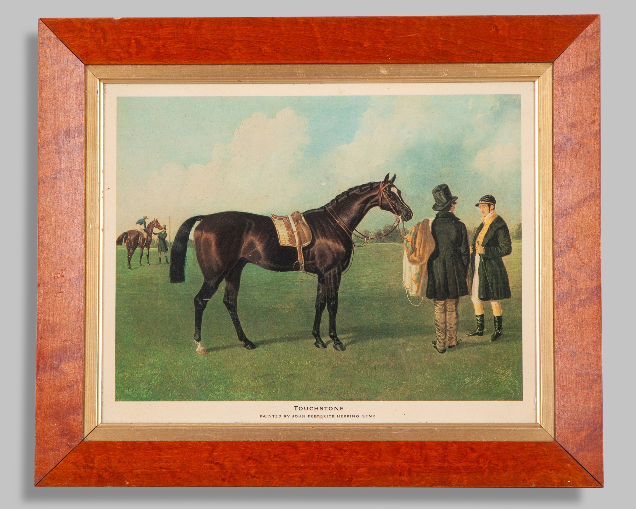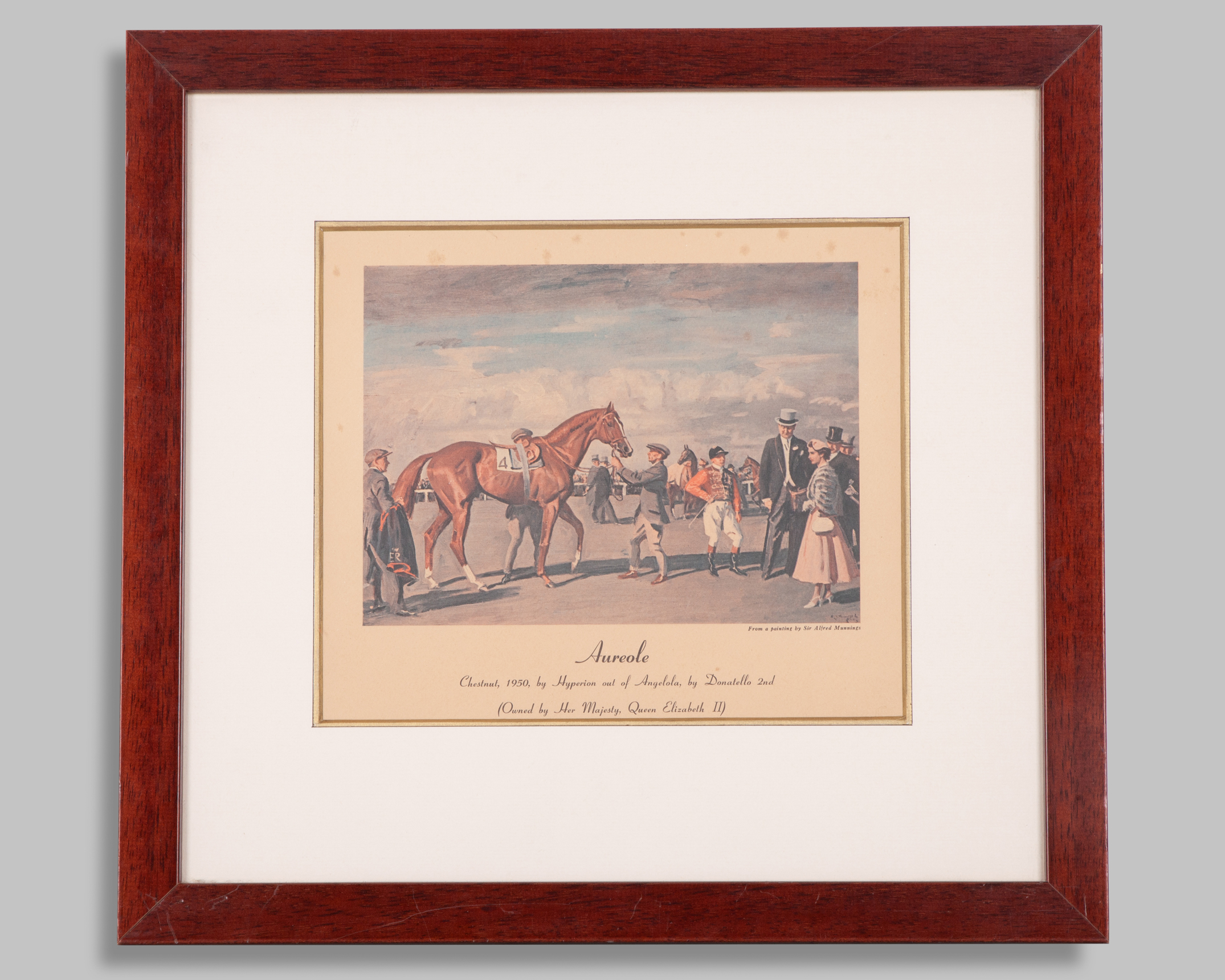 a J F Herring repro print of Touchstone; Sir Alfred Munnings print of Queen Elizabeth II's Aureole; The Finish, artist's signature indistinct; and Cottage Rake with Aubrey Brabazon up, various sizes, the largest 37 by 43cm.