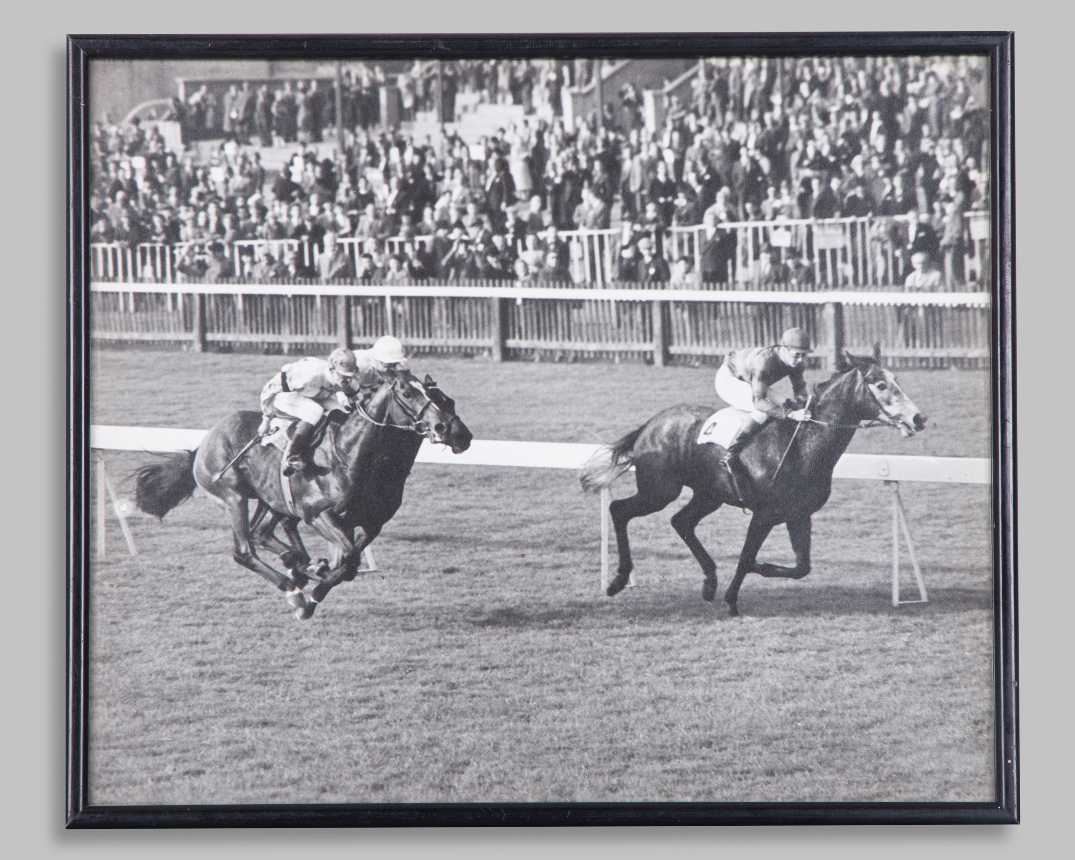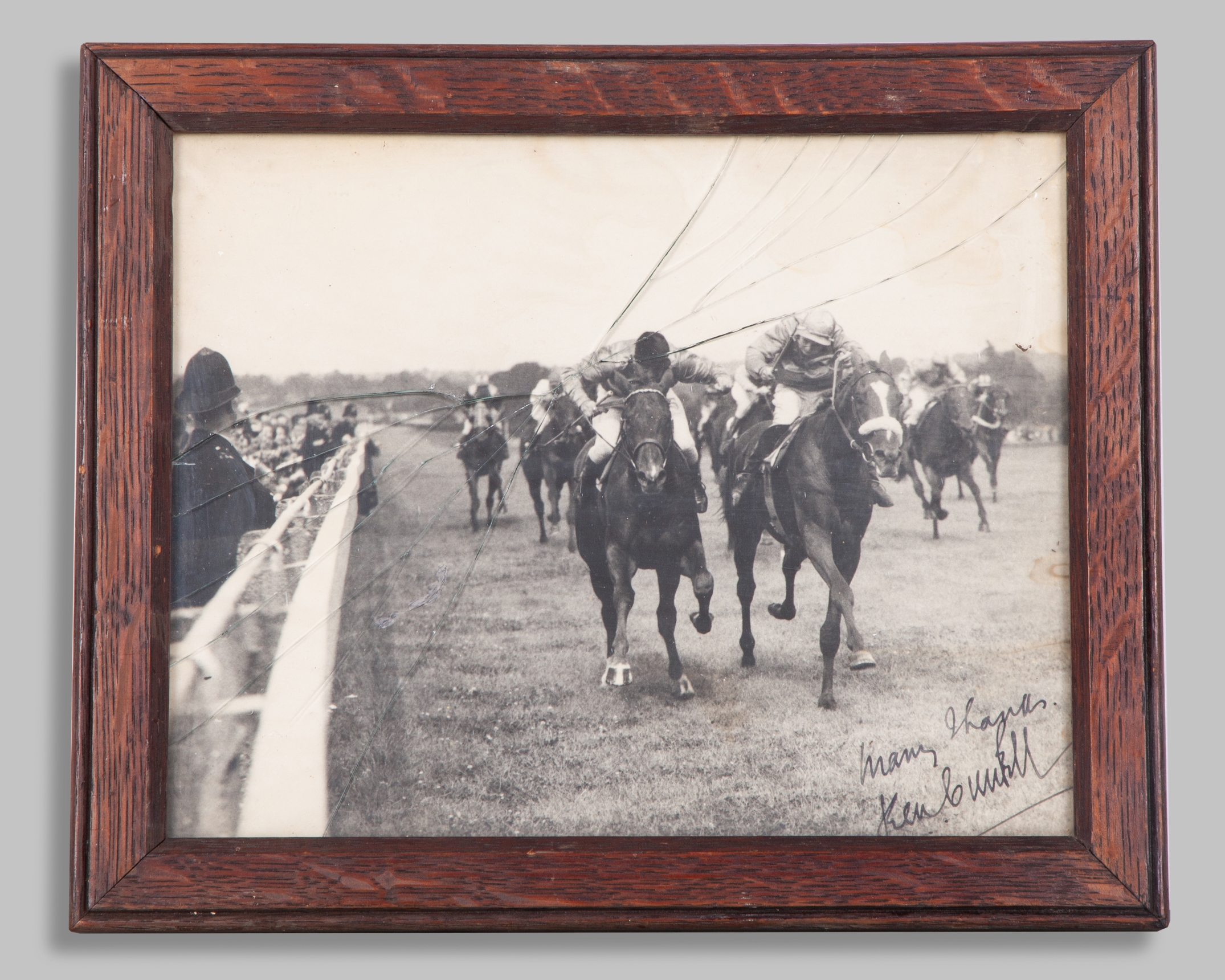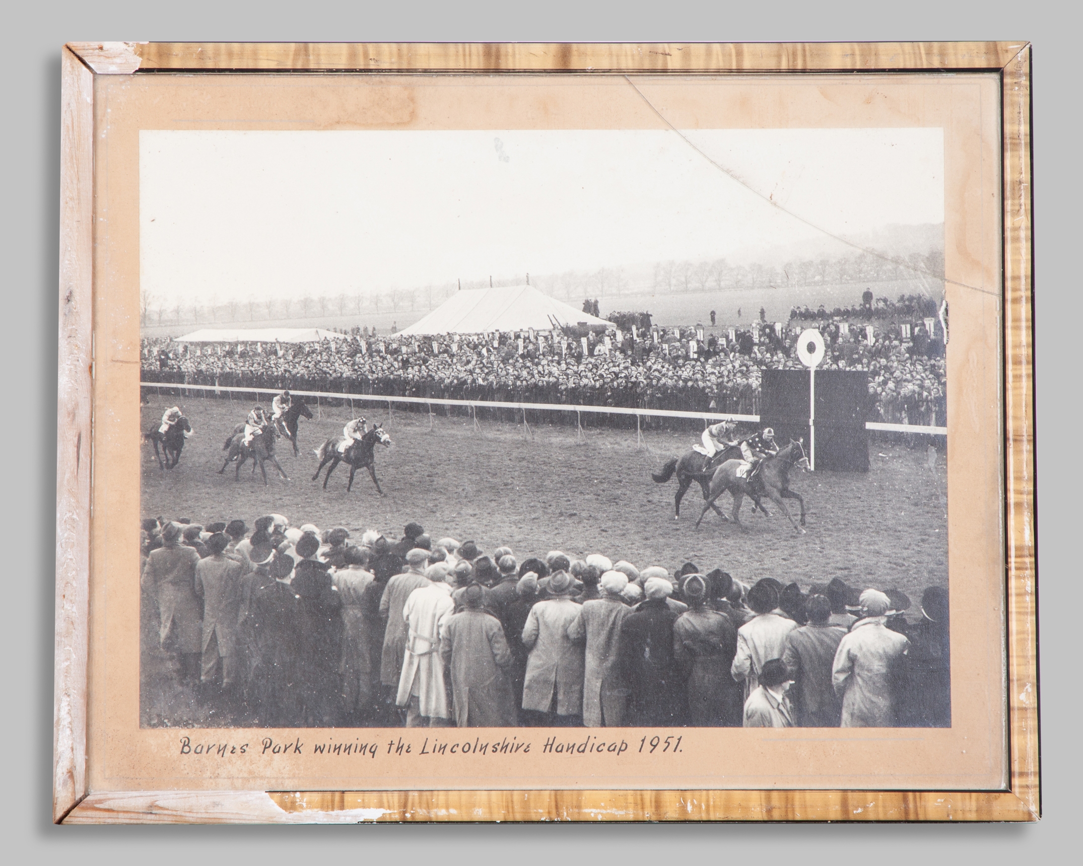 photographs including Barnes Park winning the 1951 Lincoln, a photograph signed by Ken Cundall, Arkle winning the Power Gold Cup, Phil Drake the 1955 Derby winner, Sir Peter O'Sullevan potrait and a group photograph in the paddock of J J Parkinson (trainer), E M Quirke (jockey) and Paddy Shaw (owner), various sizes