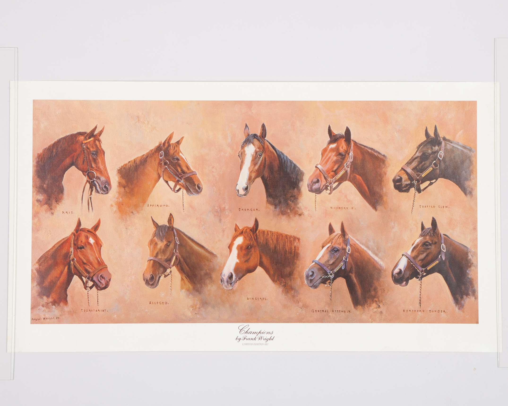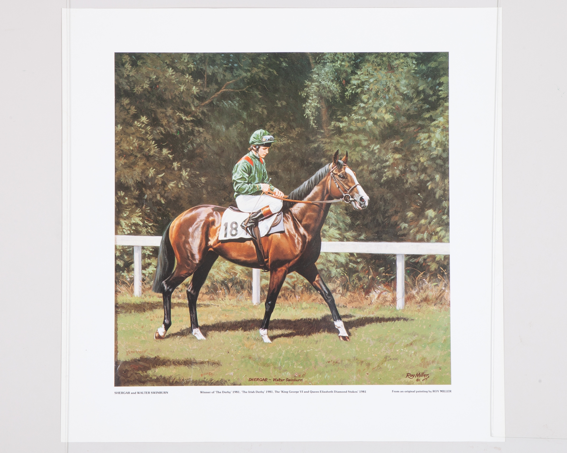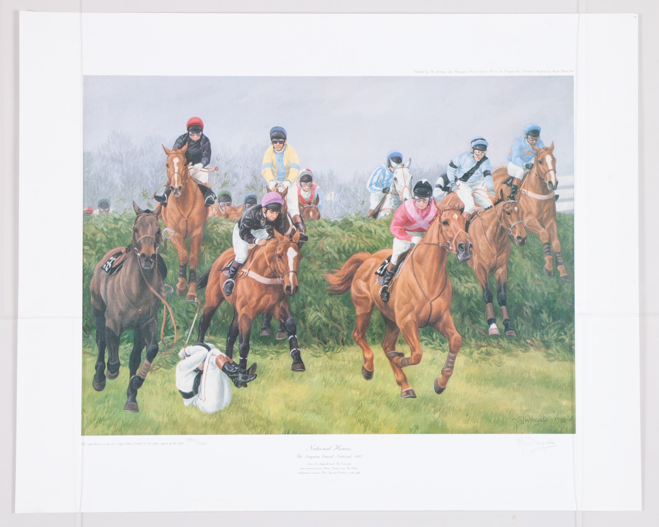 the first a limited edition print signed by the artist Sue Wingate (British, 1947-2016) titled; National Heroes The Seagram Grand National 1987, 180/500, 68 by 55cm.; the others smaller and comprising ‘Champions’ by Frank Wright (British, 1928-2016); and ‘Shergar - Walter Swinburn’ by Roy Miller (British, b.1938), tube rolled