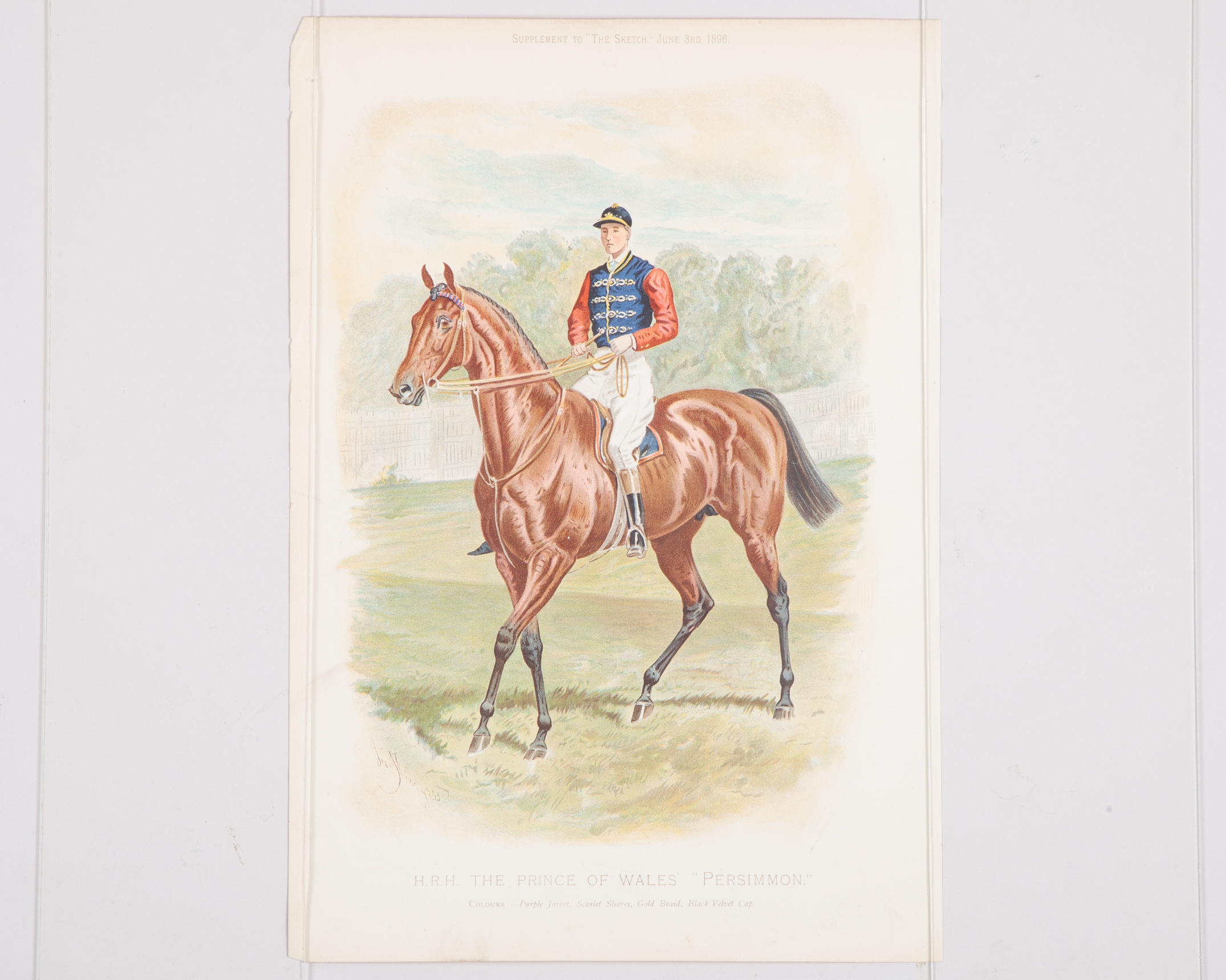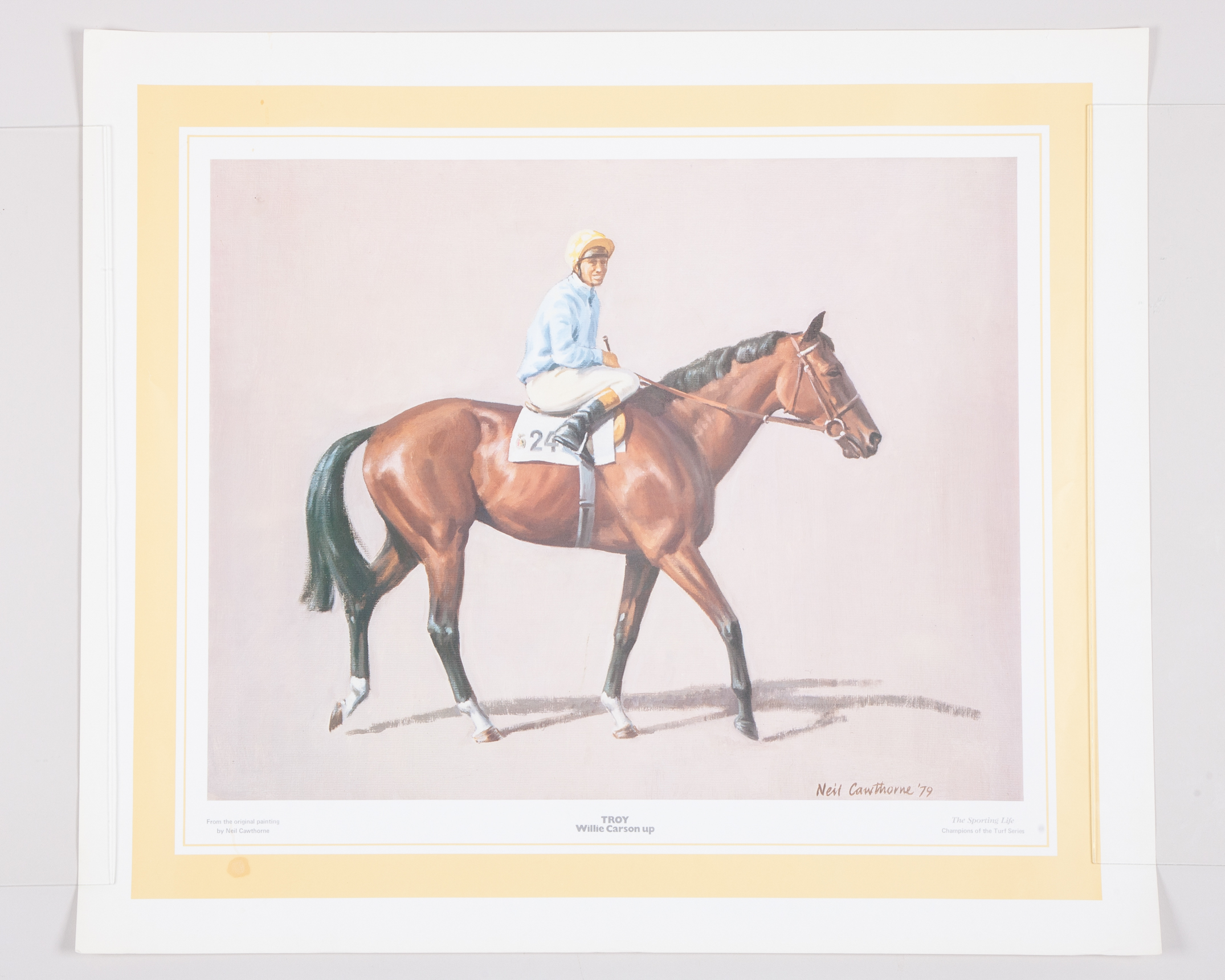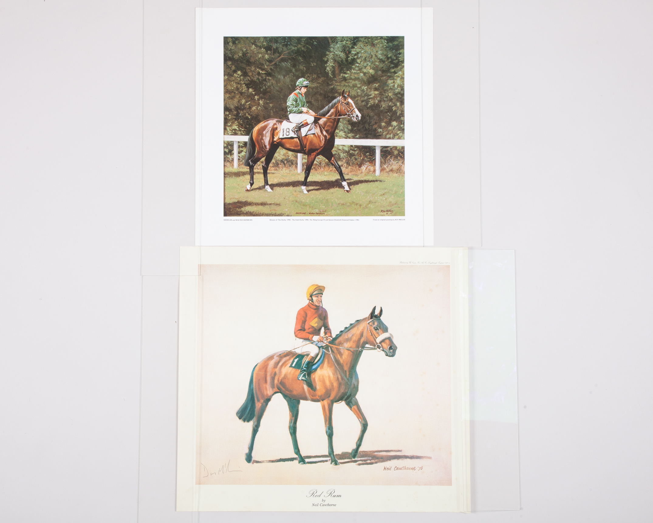 comprising two by Neil Cawthorne (British, 1936-2022) Red Rum, and Troy with Willie Carson Up, 63 by 55cm; the others smaller and comprising Shergar - Walter Swinburn by Roy Miller (b.1938); and a modern print of H.R.H. The Prince of Wales's 1896 Derby and St Leger winner Persimmon, rolled