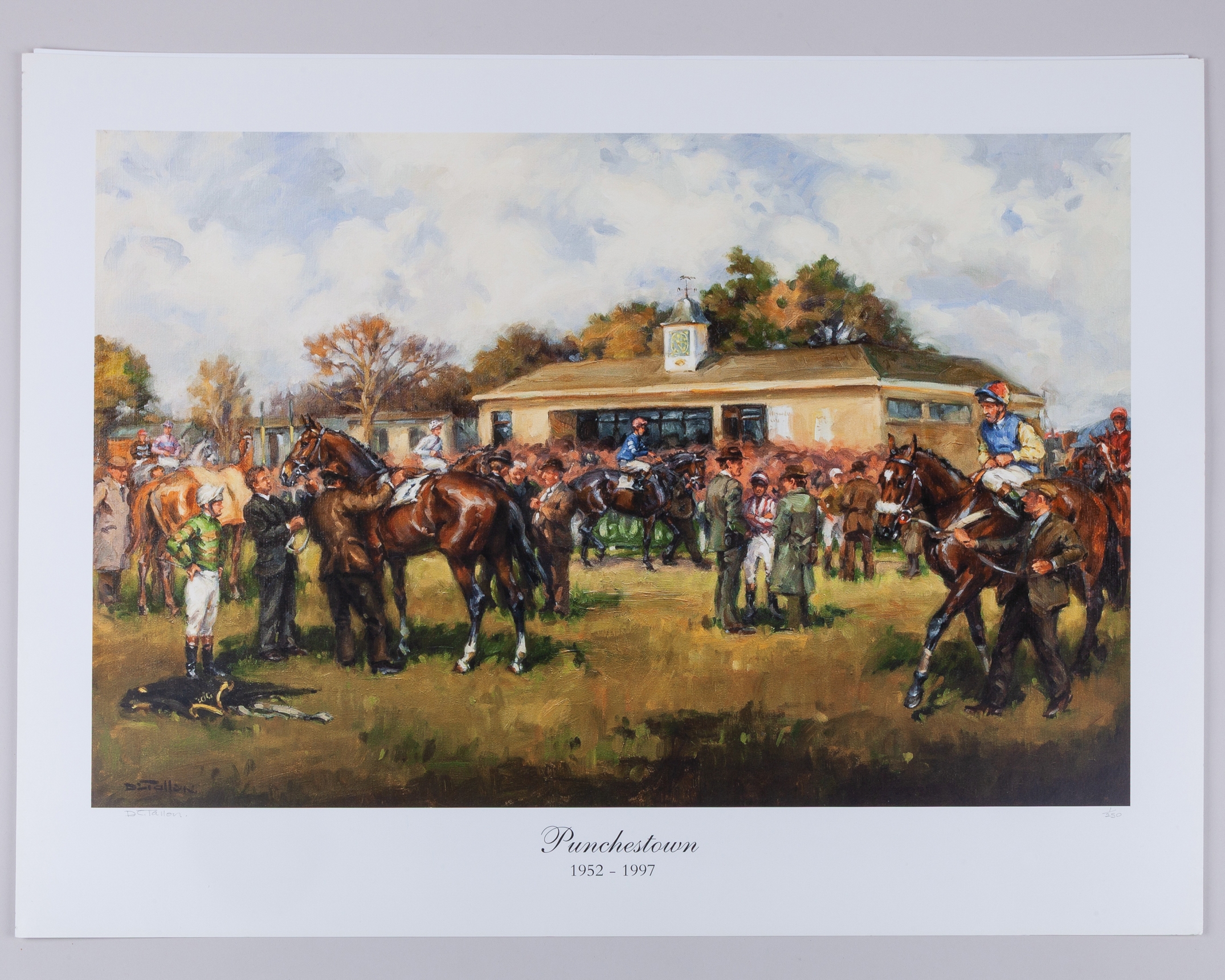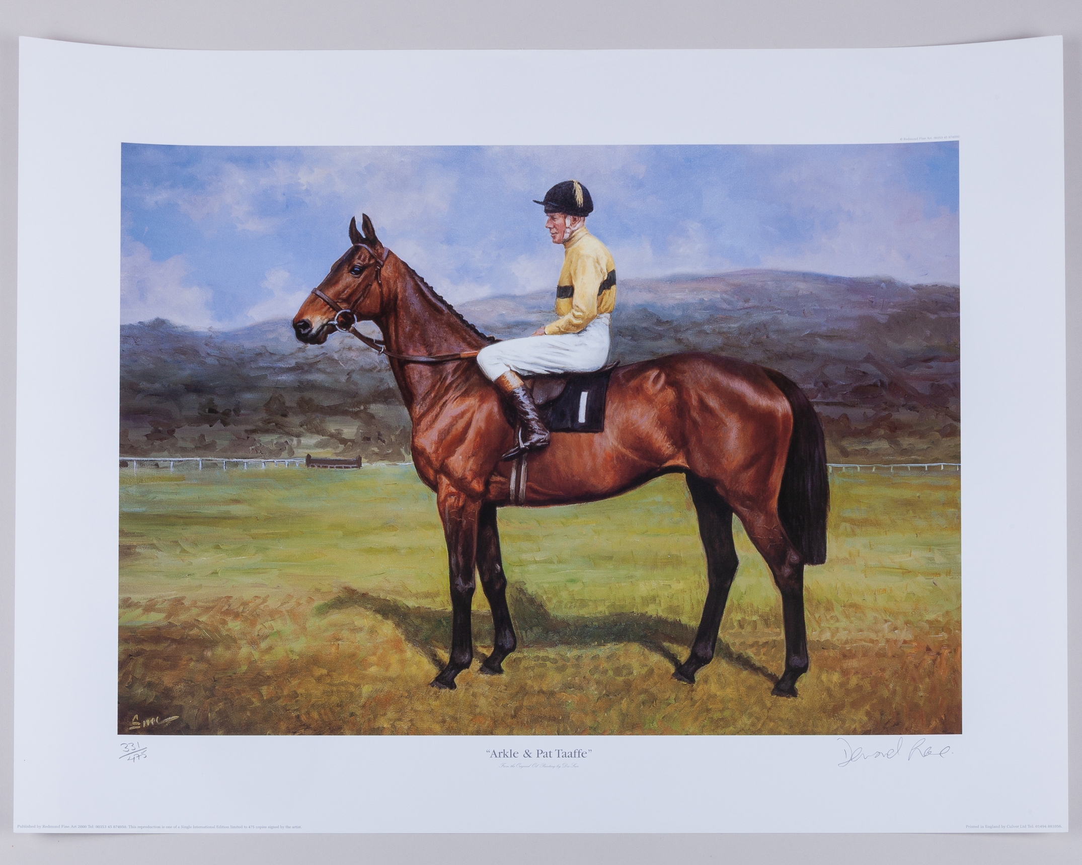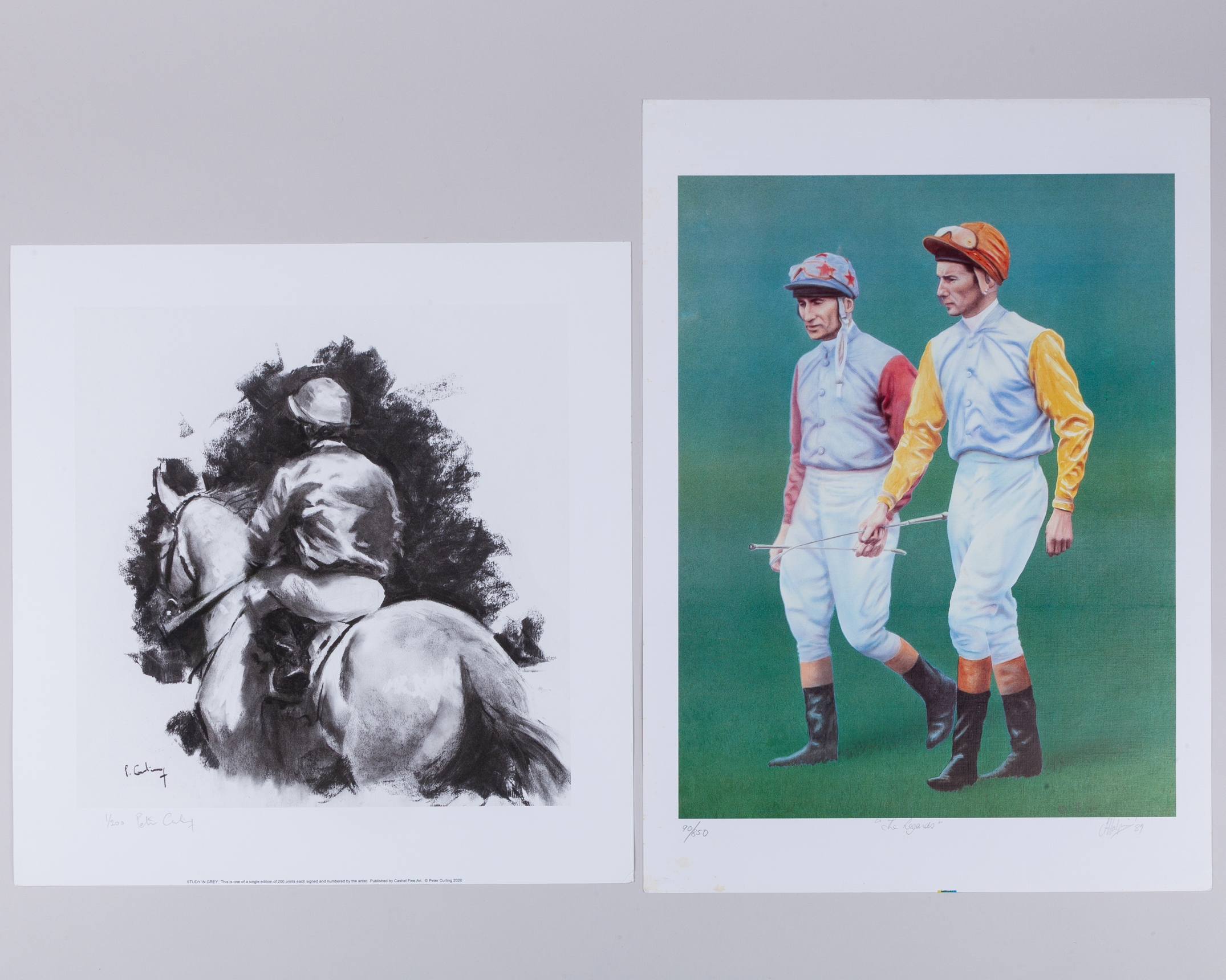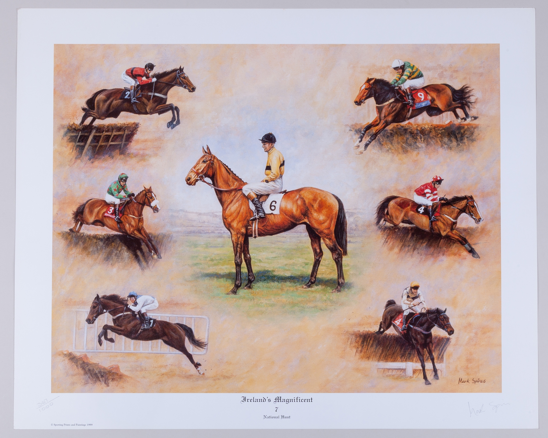 all signed in pencil by the artist, comprising: i) Peter Curling (Irish, b.1955) Study in Grey, this being No.1 from the edition of 200; ii) a print signed ‘Halpin’ titled “The Legends”, dated 1989 and featuring the jockeys Scobie Breasley & Lester Piggott, 90/850; iii) Mark Spires (contemporary) Ireland's Magnificent 7, National Hunt, 367/1,000; iv) Desmond C. Tallon (Irish, b.1950) Punchestown 1952-1997, this being No.1 from the edition of 250; & v) Desmond Snee (Irish, 1957-2005) Arkle & Pat Taaffe, unmounted sheets, various sizes, the largest 63 by 81cm.