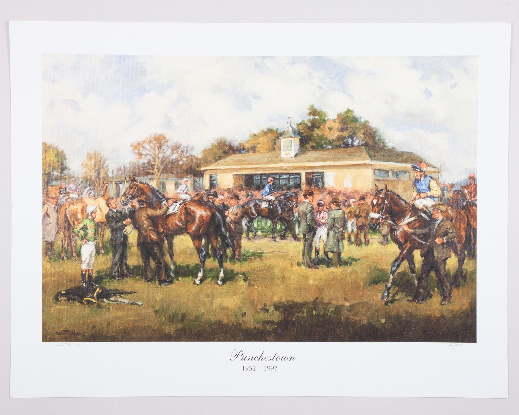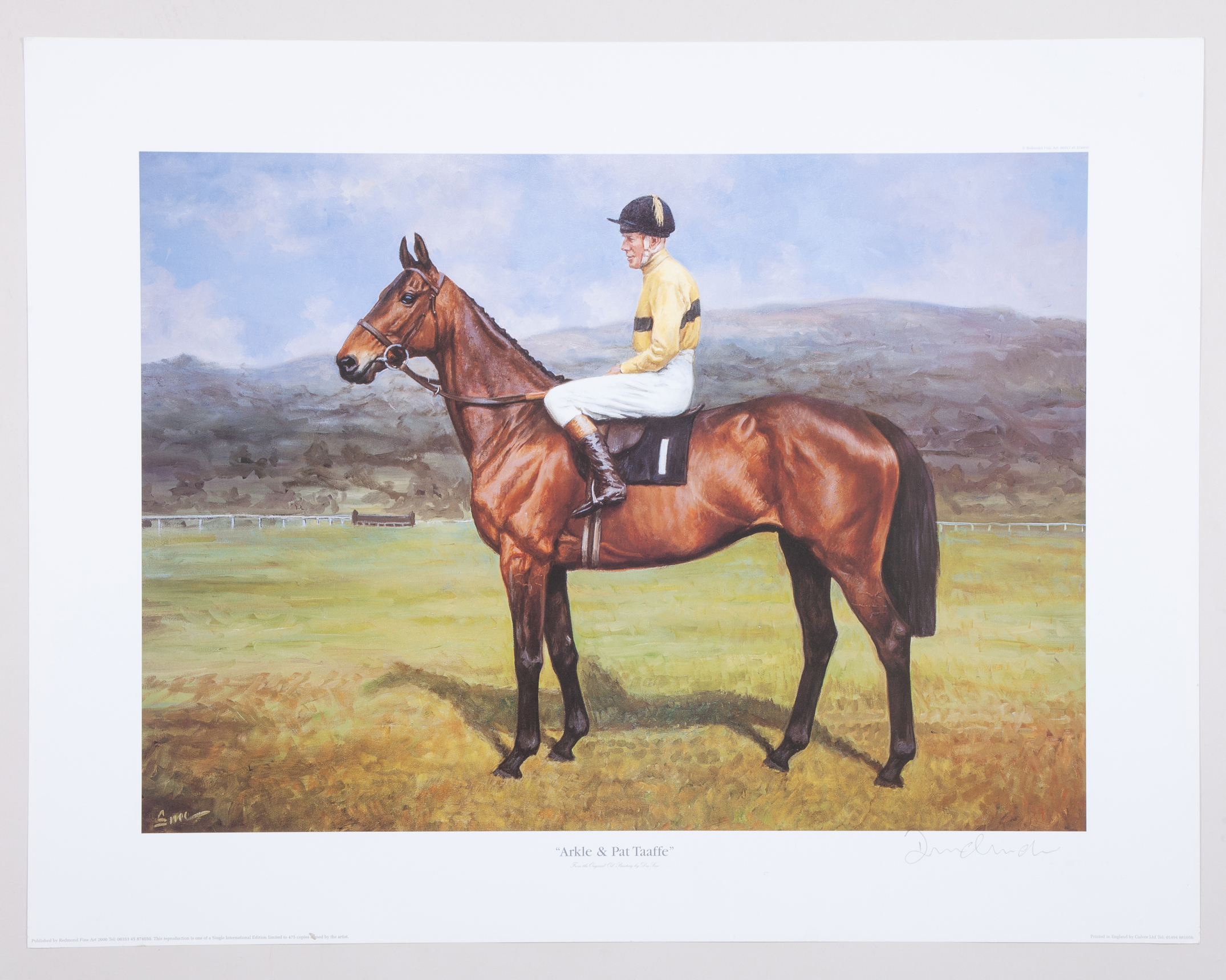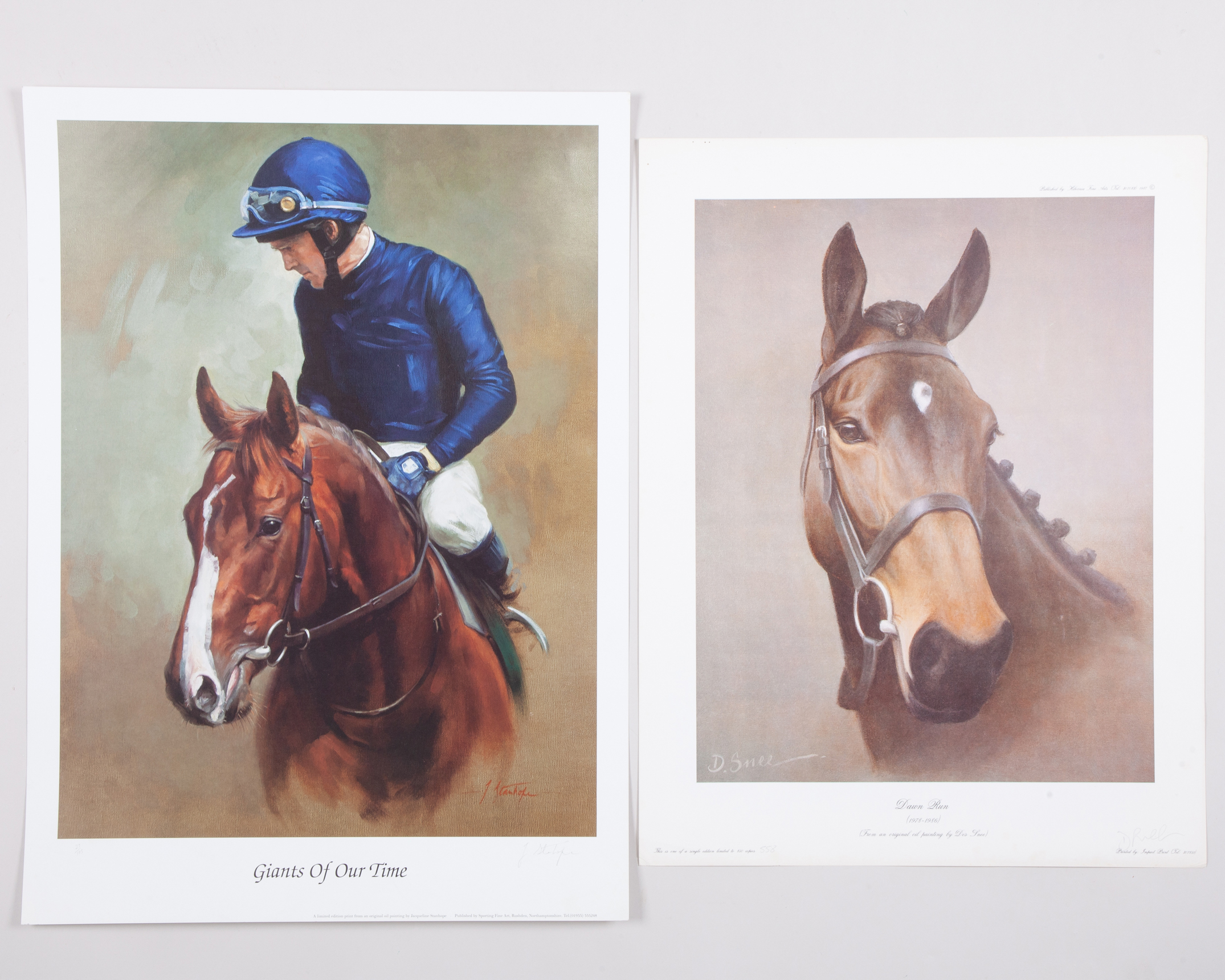 all signed in pencil by the artist, comprising: i) Susan Crawford (British, b.1941) Pilsudski, 136/250; ii) Jacqueline Stanhope (British, b.1963) Giants of our Time, 27/195; iii) & iv) Desmond Snee (Irish, 1957-2005) Arkle & Pat Taaffe, unnumbered; & head portrait of Dawn Run, 558/850; & v) Desmond C. Tallon (Irish, b.1950) Punchestown 1952-1997, 81/250, unmounted sheets, various sizes, the largest 68 by 80cm.