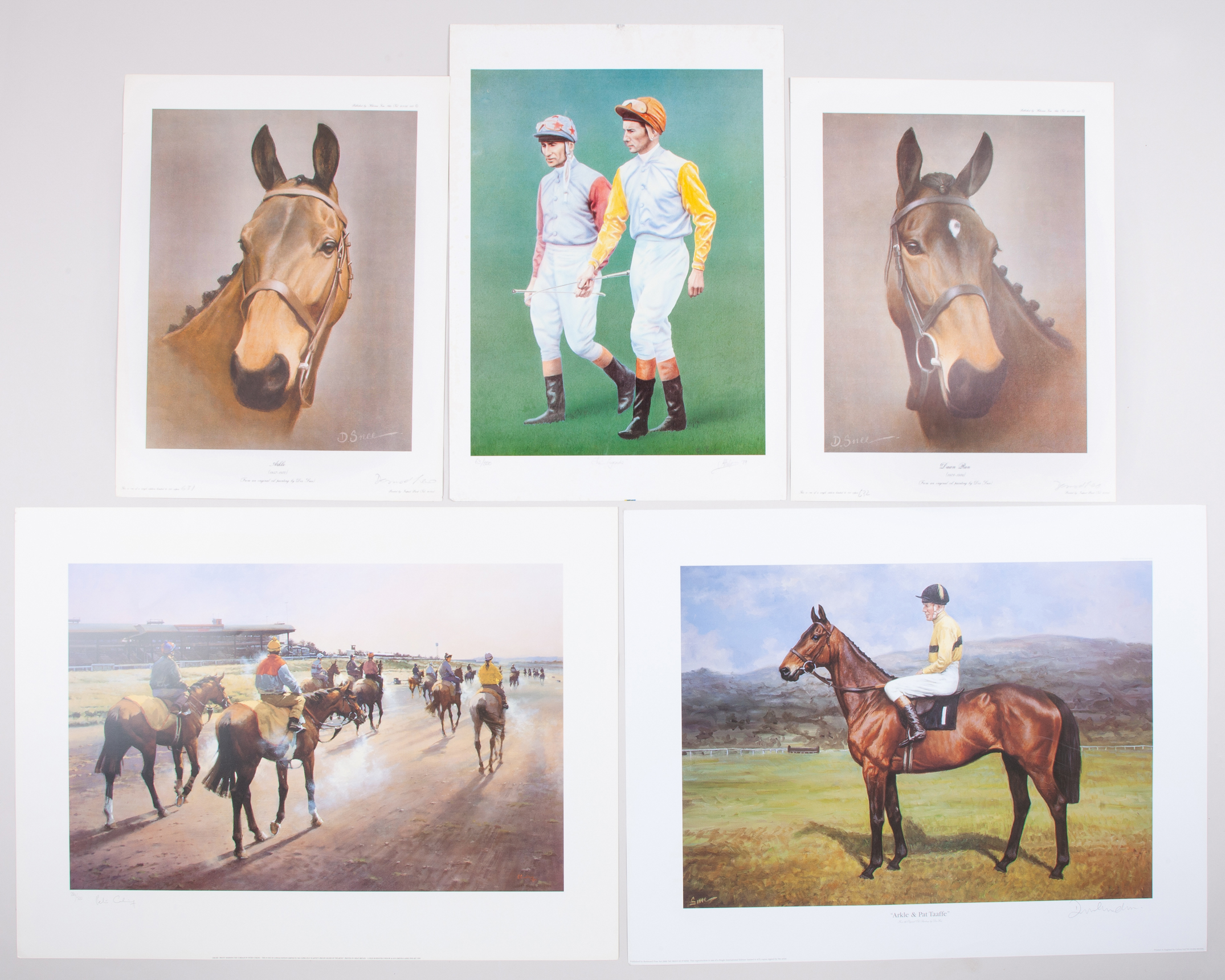 all signed in pencil by the artist, comprising: i) Peter Curling (Irish, b.1955), Frosty Morning, The Curragh, 284/500; ii) a print signed ‘Halpin’ titled “The Legends”, dated 1989 and featuring the jockeys Scobie Breasley & Lester Piggott, 63/850; iii), iv) & v) Desmond Snee (Irish, 1957-2005), Arkle & Pat Taaffe, unnumbered; head portrait of Dawn Run, 632/850; & head portrait of Arkle, 631/850, unmounted sheets, various sizes