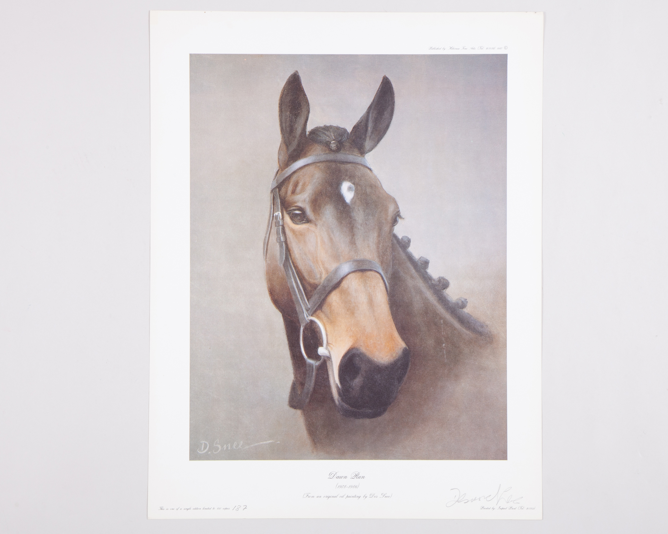comprising: i), ii) & iii) Desmond C. Tallon (Irish, b.1950) Punchestown 1952-1997; & Tom Costello, Master of his Craft, 1932-2009; and Shergar with Walter Swinburn up, all unsigned & unnumbered; iv & v) Desmond Snee (Irish, 1957-2005) Arkle & Pat Taaffe, signed but unnumbered; and head portrait of Dawn Run, signed, 187/850;, various sizes, the largest 61 by 81cm.