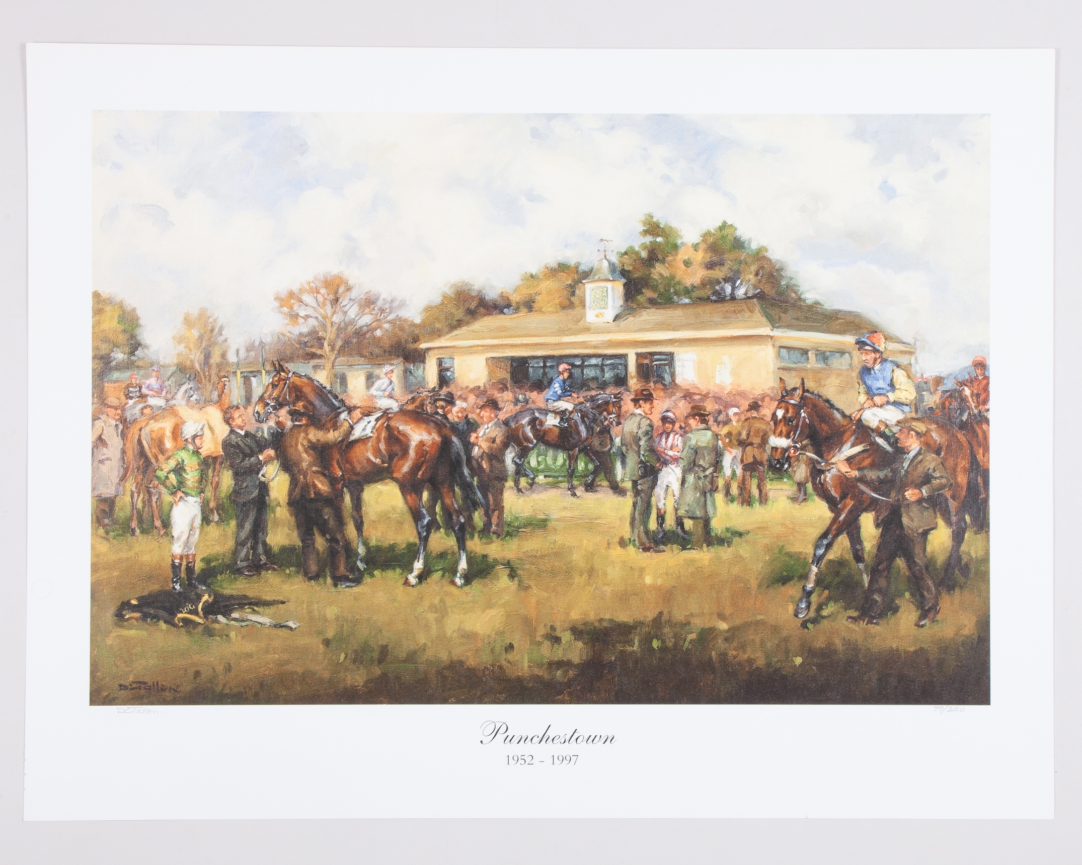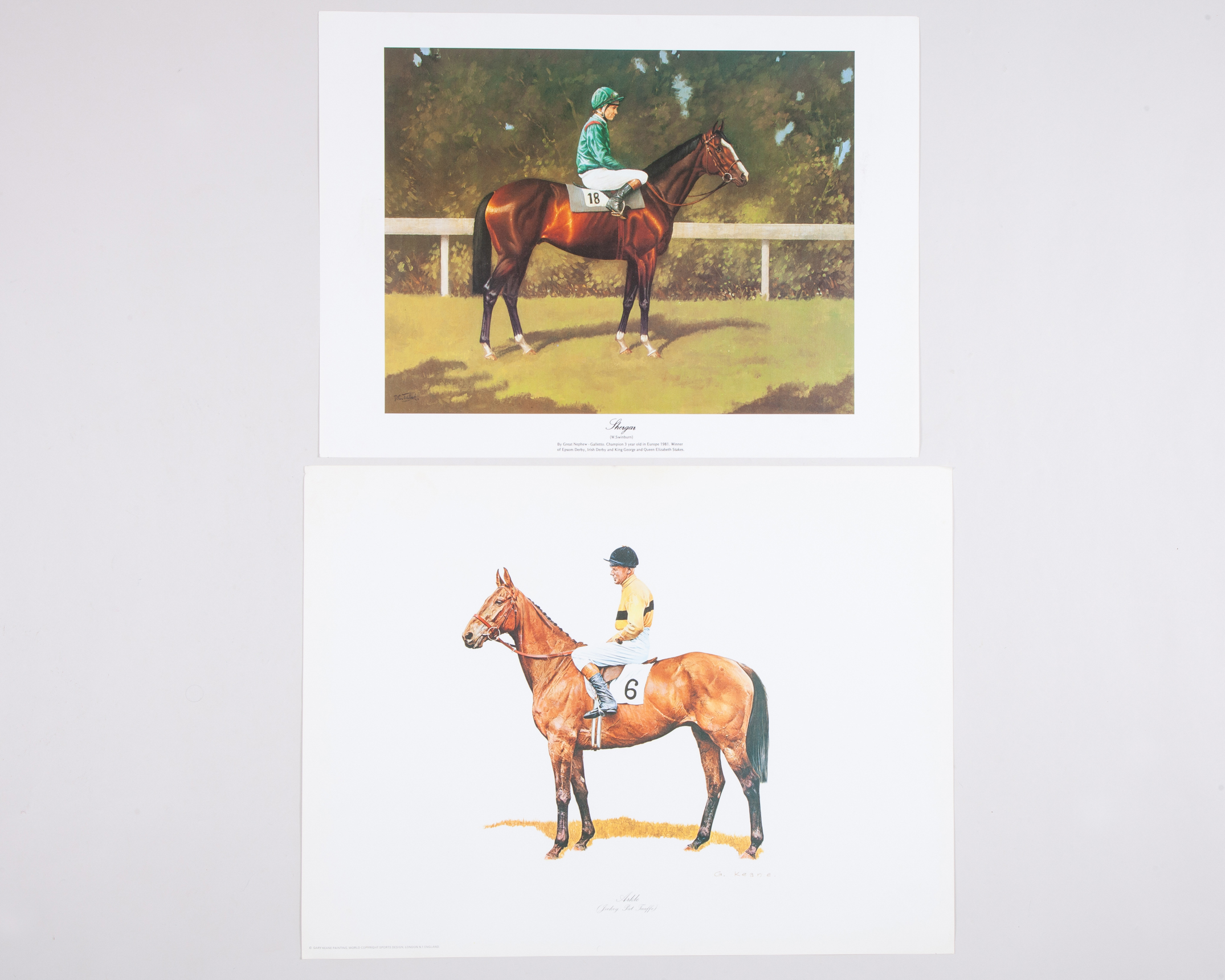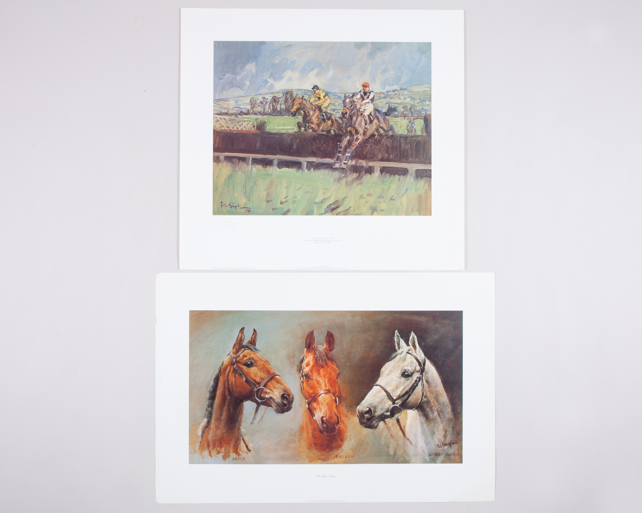 i) & ii) Desmond C. Tallon (Irish, b.1950) Shergar with Walter Swinburn up, unsigned & unnumbered; & Punchestown 1952-1997, signed 79/250; iii) Susan Crawford (British, b.1941) We Three Kings, unsigned & unnumbered; iv) Peter Biegel republish, The Writing's On The Wall [Arkle & Mill House], 295/850; & v) Gary Keane (British, b.1931) Arkle & Pat Taaffe, unsigned & unnumbered, unmounted sheets, various sizes, the largest 61 by 81cm.