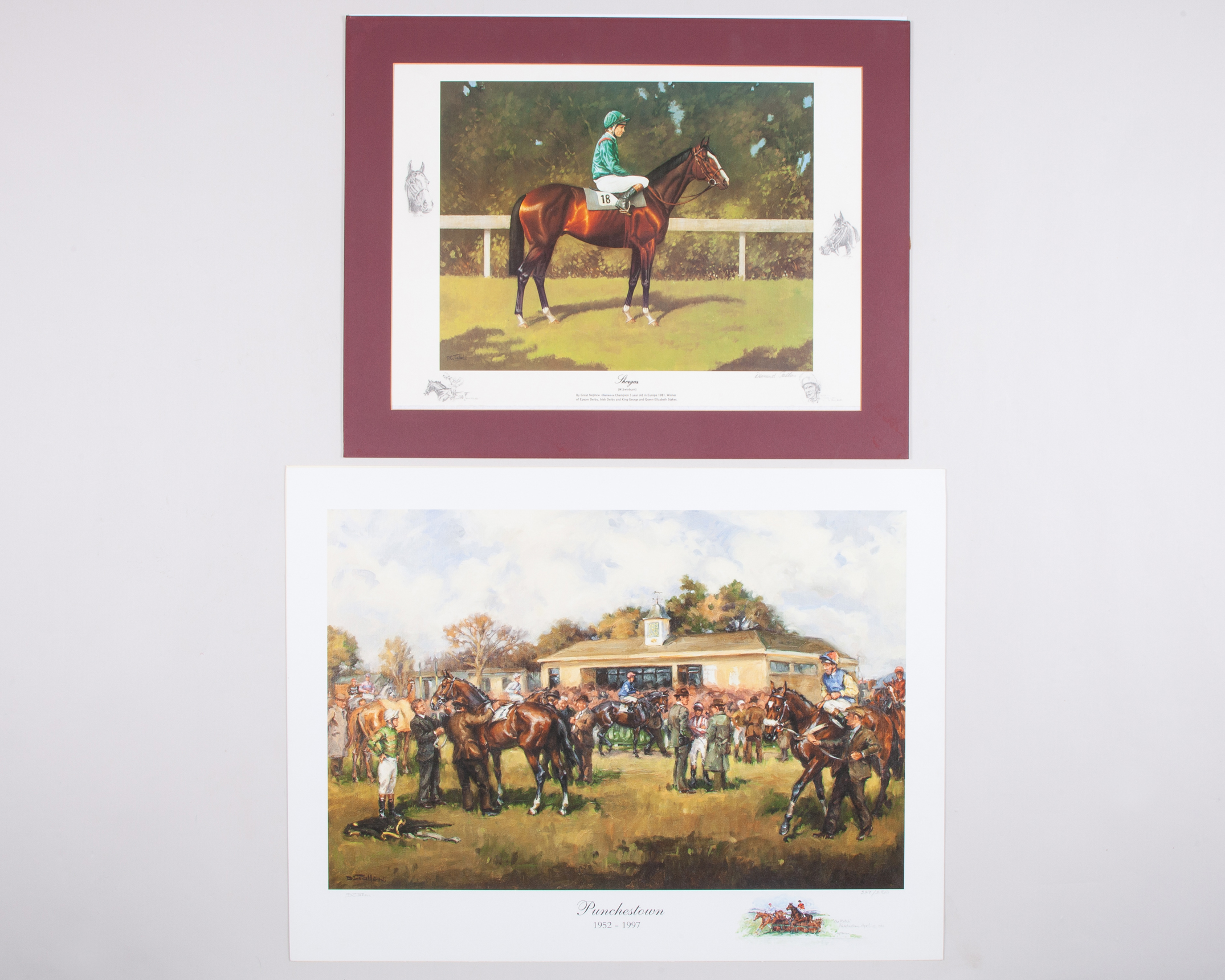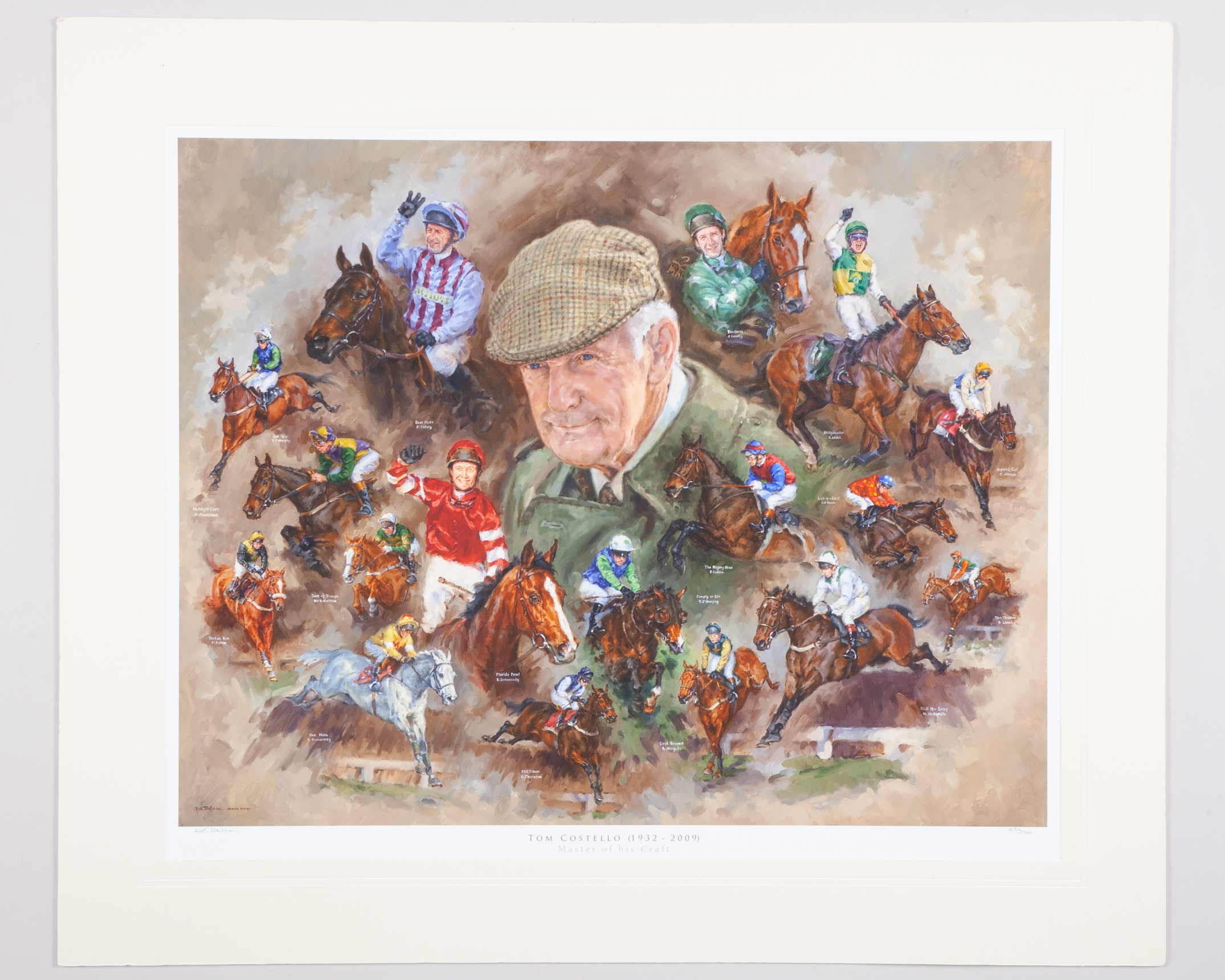 i) Punchestown 1952-1997, signed. 227/250, the lower margin with a hand painted vignette of the Dawn Run v Buck House 23rd April 1986; ii) Tom Costello, Master of his Craft, 1932-2009, 43/250; and iii) Shergar with Walter Swinburn up, the artist has added hand-drawn pencil drawing vignettes, various sizes. the largest 72 by 84cm., all mounted ready for framing