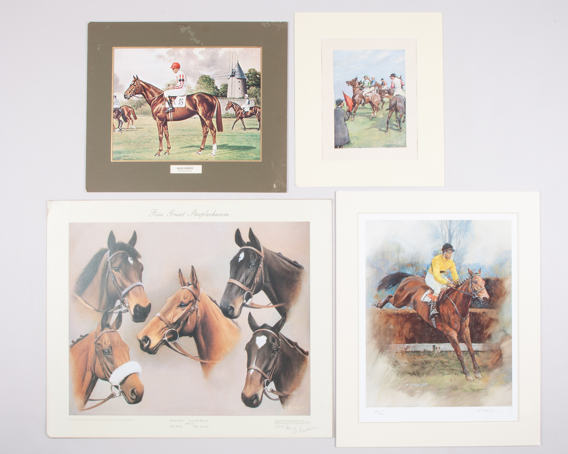 i) Michael Heslop, Arkle with Pat Taaffe up, signed, 12/500; ii) Desmond Snee (Irish, 1957-2005), The Great Steeplechasers, 6/500; iii) After G D Armour, “At The Start”; iv) Ballymoss with Scobie Breasley up by an unknown artist, all mounted ready for framing